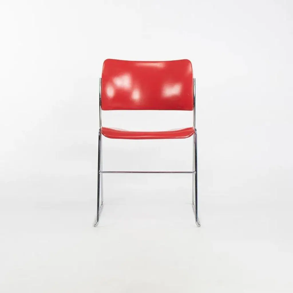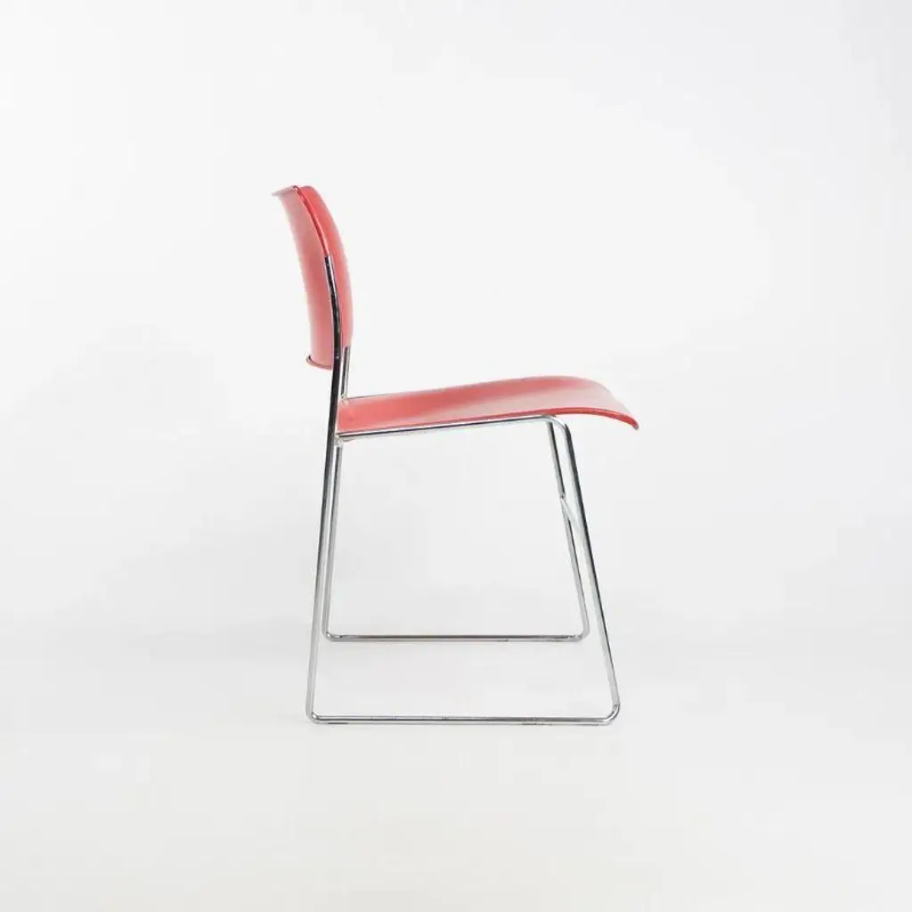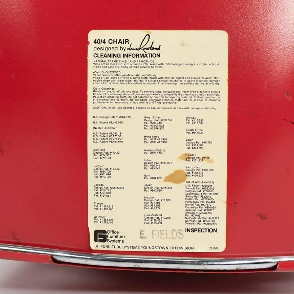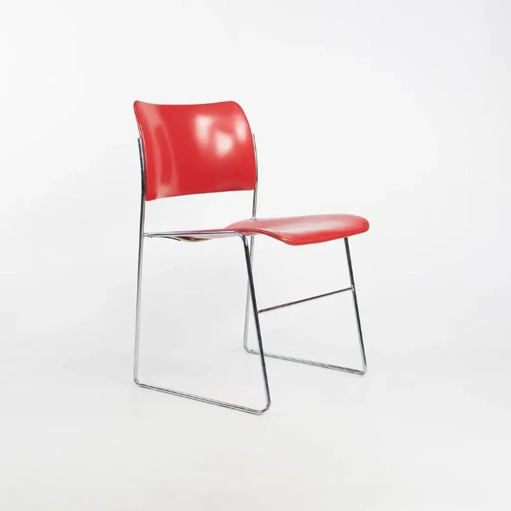 This is a single (multiple chairs are available, though the price listed is for each chair) 40/4 chair, originally designed by David Rowland in 1964. This iconic chair has been praised as one of the most ingenious modern designs of the 20th century, and has been credited for being the first truly stackable chair. Each chair has a solid steel sled base, and has a red enameled steel seat. These particular examples were manufactured by GF Business Equipment (part of General Fireproofing Co) in the 1970s. Later, the Howe corporation would come to buy the rights to produce the 40/4. The listed price includes one 40/4 chair. Multiple chairs are available. Each chair measures 21 inches in length, 19 inches in width, and 30 inches tall. The seat height is 18 inches. These chairs are in very good condition, but remain pre-owned and may show some signs of use. See photos.