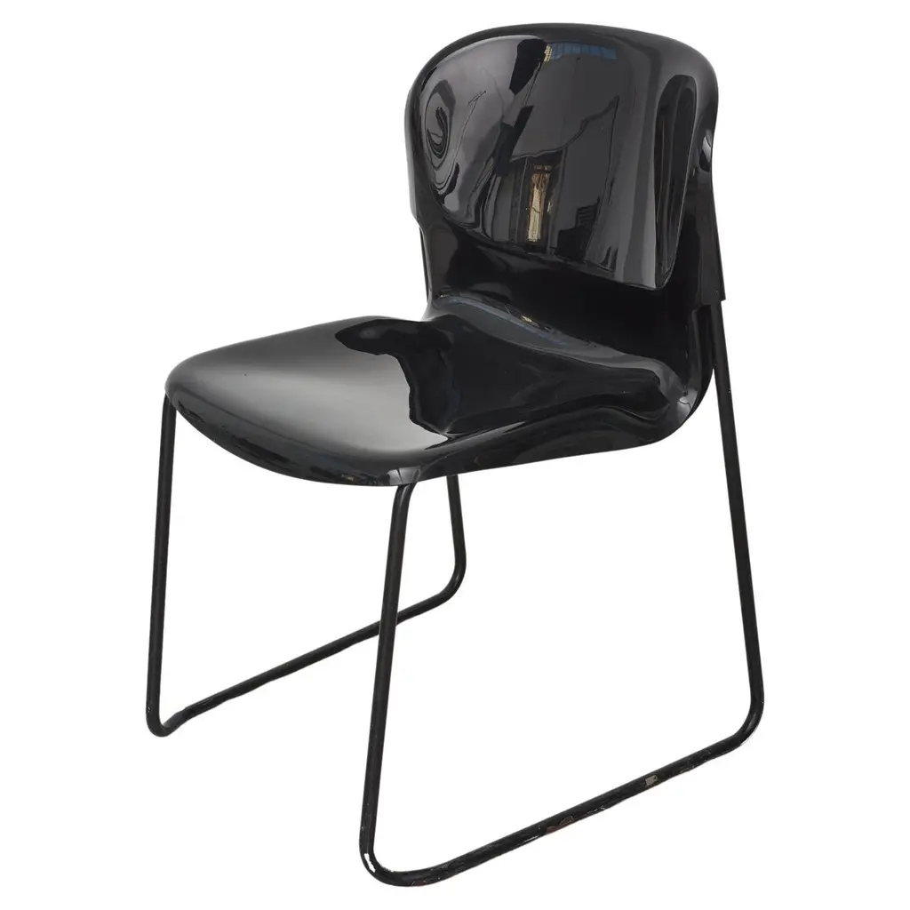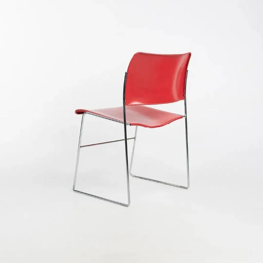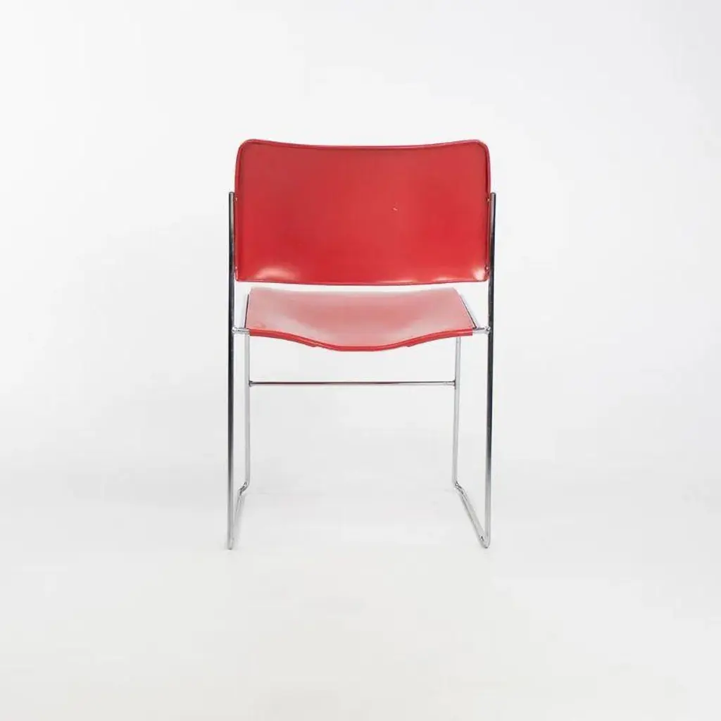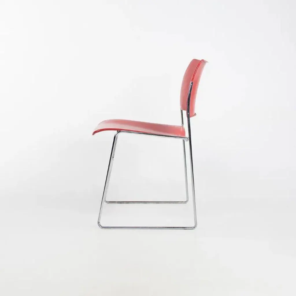 This is a single (multiple chairs are available, though the price listed is for each chair) 40/4 chair, originally designed by David Rowland in 1964. This iconic chair has been praised as one of the most ingenious modern designs of the 20th century, and has been credited for being the first truly stackable chair. Each chair has a solid steel sled base, and has a red enameled steel seat. These particular examples were manufactured by GF Business Equipment (part of General Fireproofing Co) in the 1970s. Later, the Howe corporation would come to buy the rights to produce the 40/4. The listed price includes one 40/4 chair. Multiple chairs are available. Each chair measures 21 inches in length, 19 inches in width, and 30 inches tall. The seat height is 18 inches. These chairs are in very good condition, but remain pre-owned and may show some signs of use. See photos.