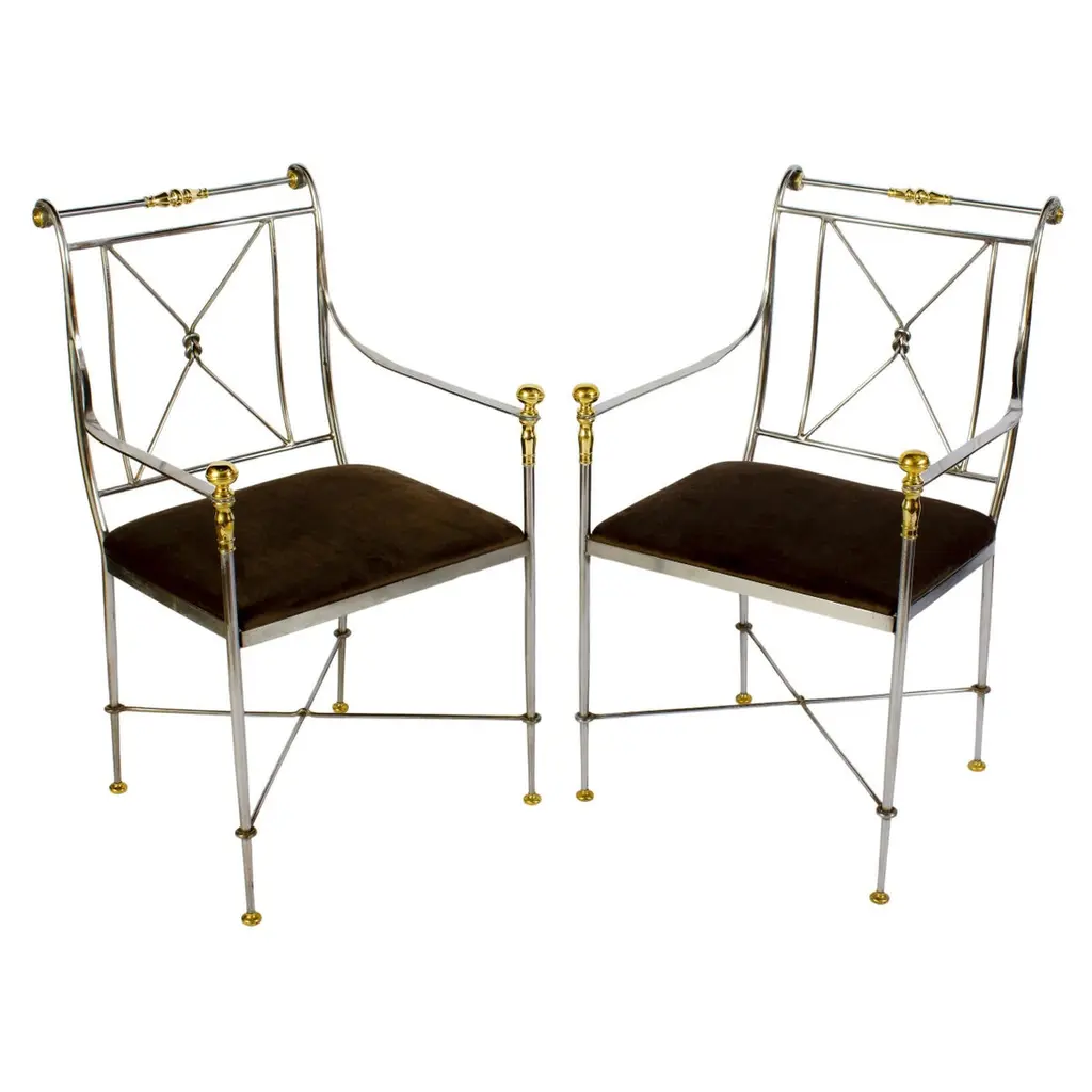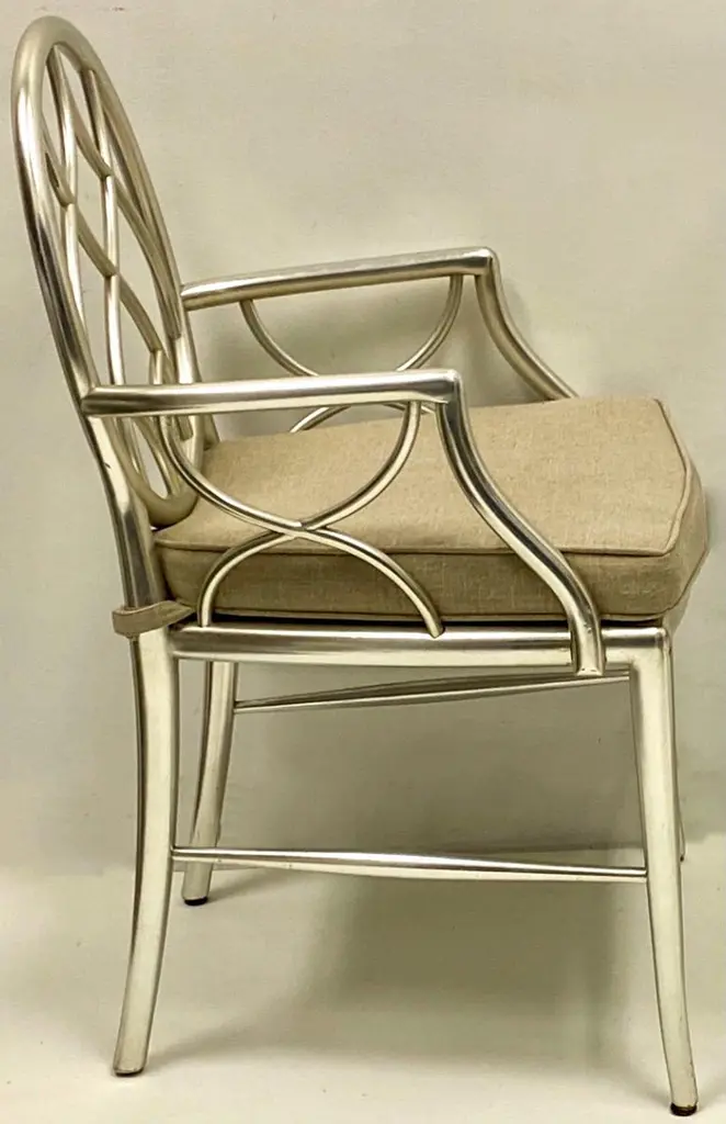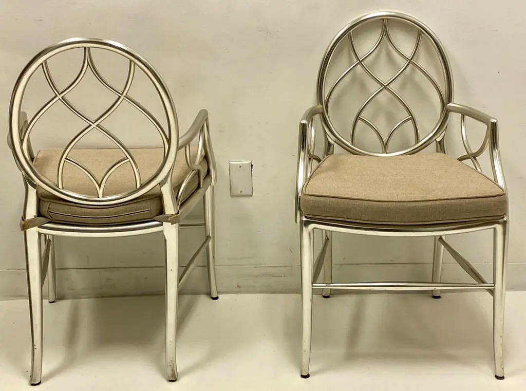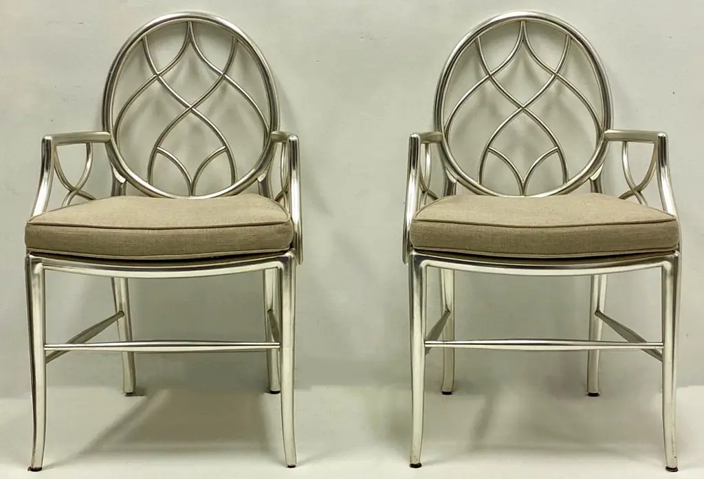 This is a chic pair of Italian neo-classical style silver leaf arm chairs. The cushions are in a neutral flax colored linen and are in very good condition, There are two pairs available. They are unmarked. Arm; 26”.