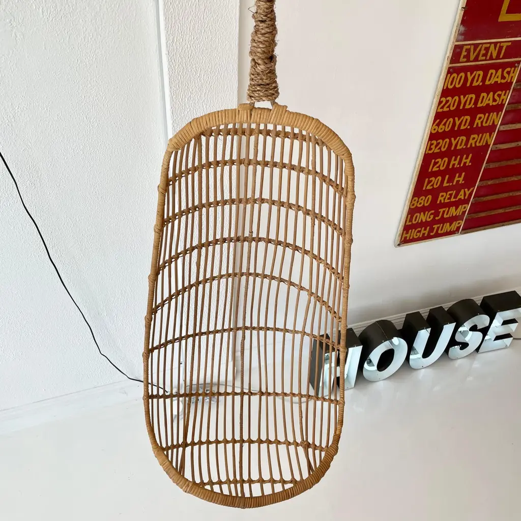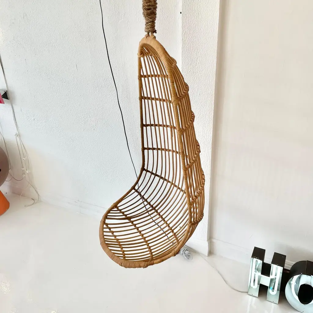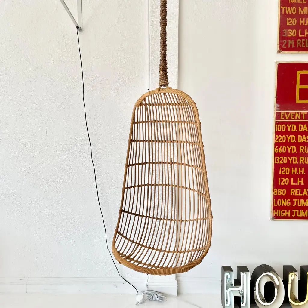 Matching pair of rare sculptural rattan and iron hanging chairs. Stunning design. Great scale. Perfect indoors or outside in a covered deck. Suspended by heavy duty chain wrapped in rope. Good vintage condition. Two available. Priced individually. Overall height of rope/chain can be adjusted in store as a courtesy before it is shipped out.