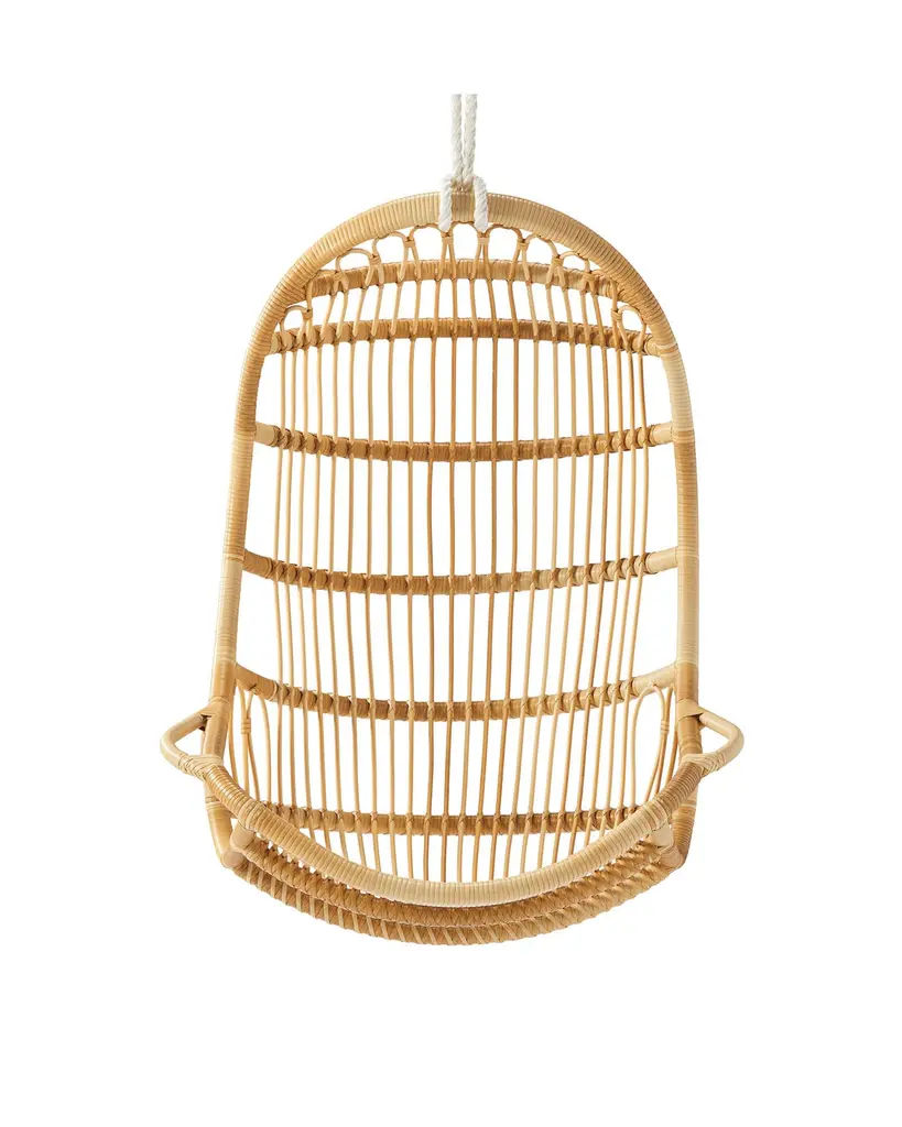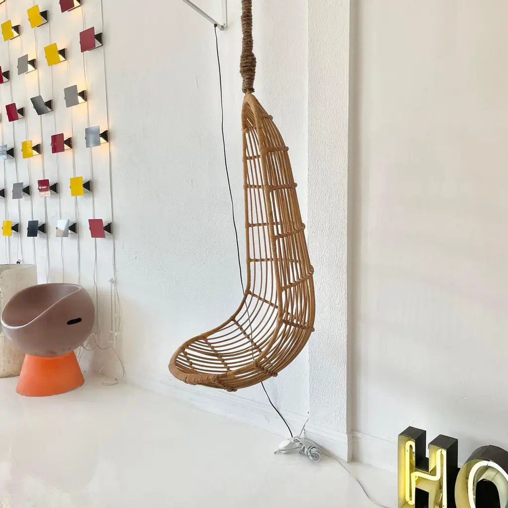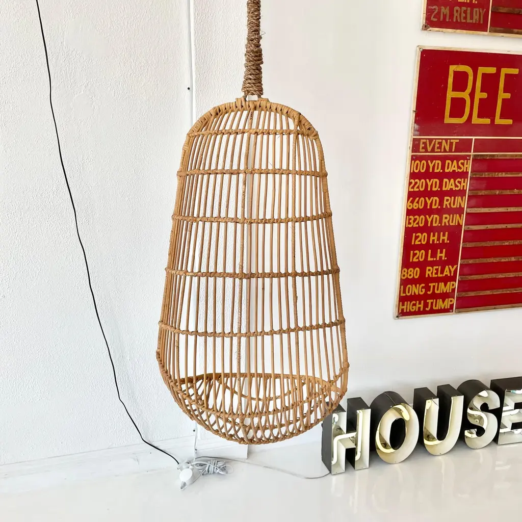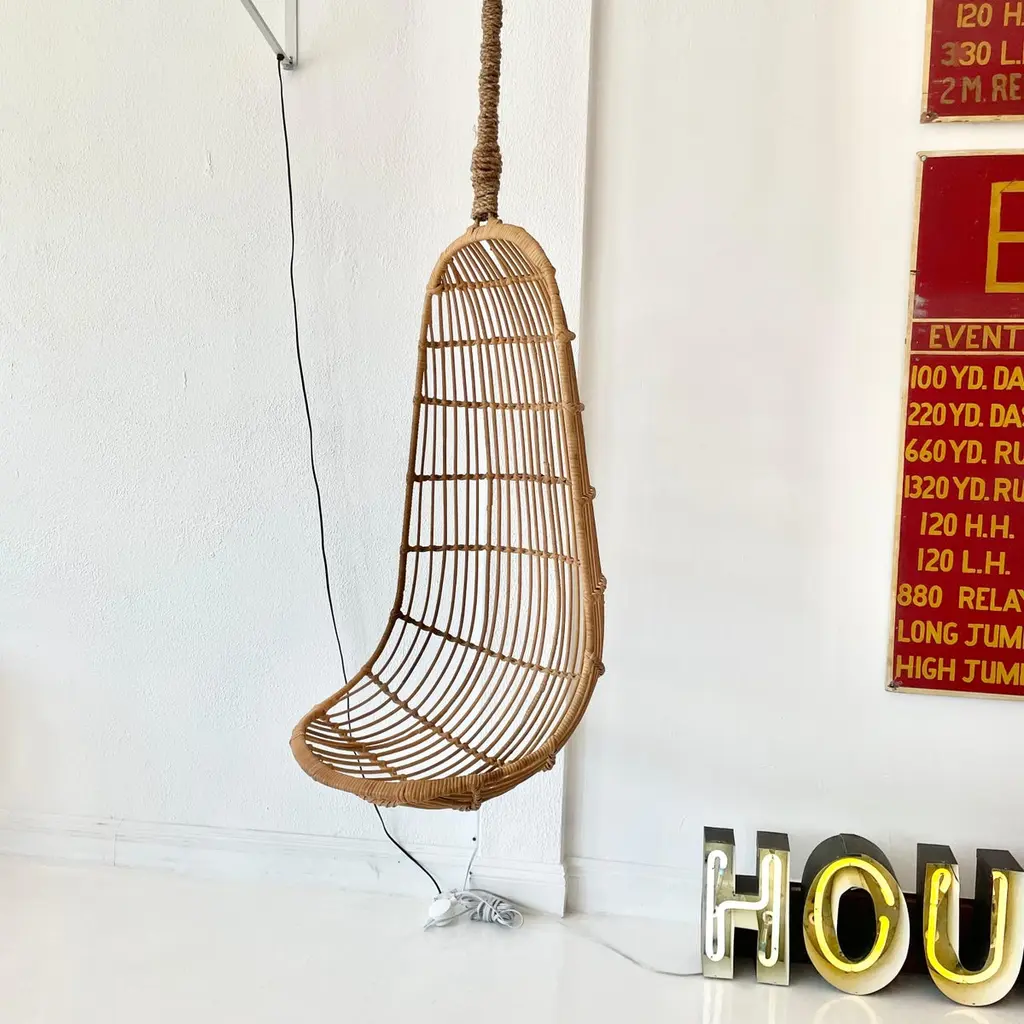 Matching pair of rare sculptural rattan and iron hanging chairs. Stunning design. Great scale. Perfect indoors or outside in a covered deck. Suspended by heavy duty chain wrapped in rope. Good vintage condition. Two available. Priced individually. Overall height of rope/chain can be adjusted in store as a courtesy before it is shipped out.