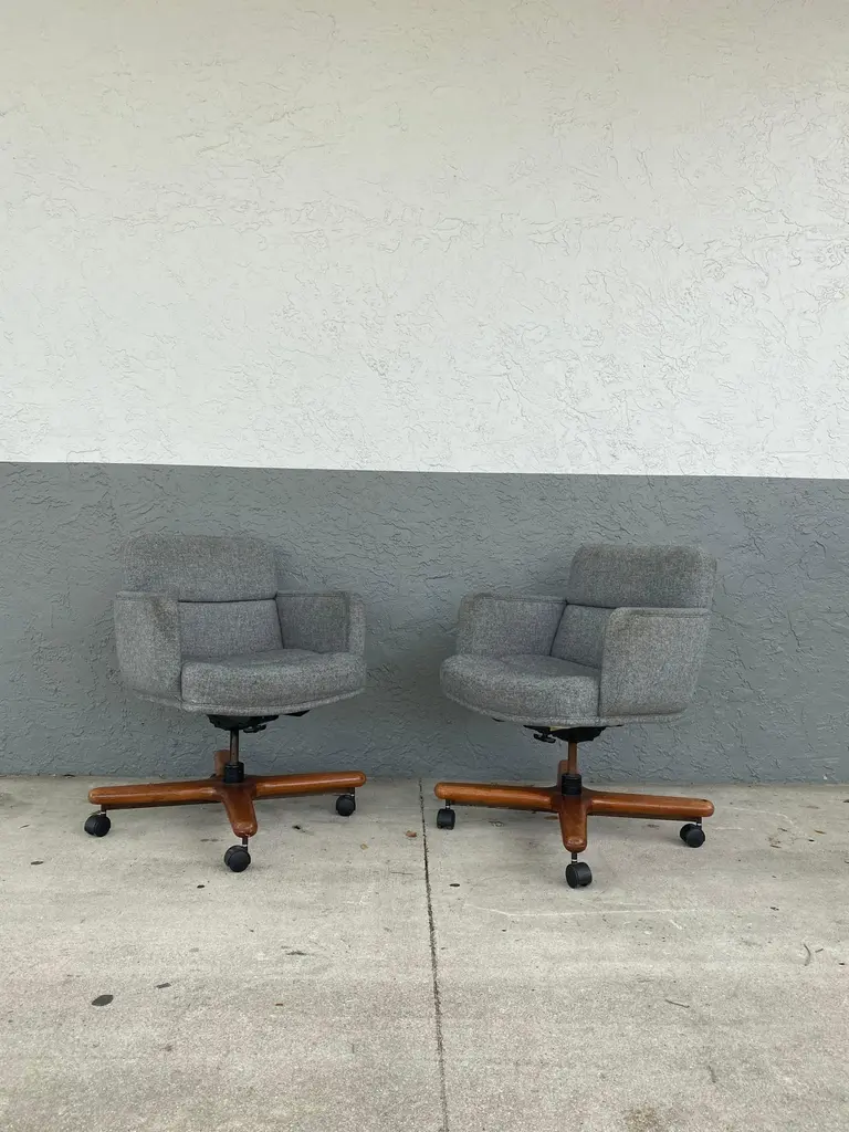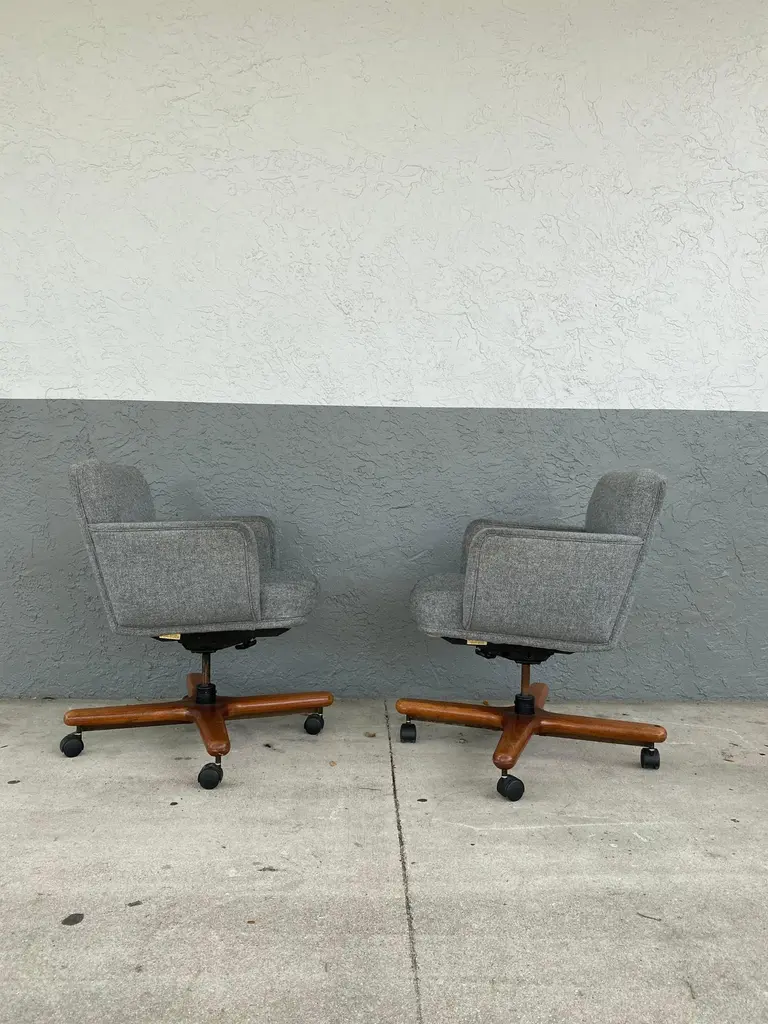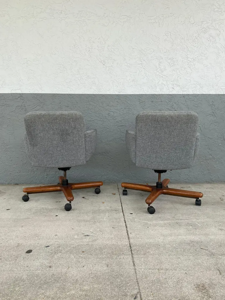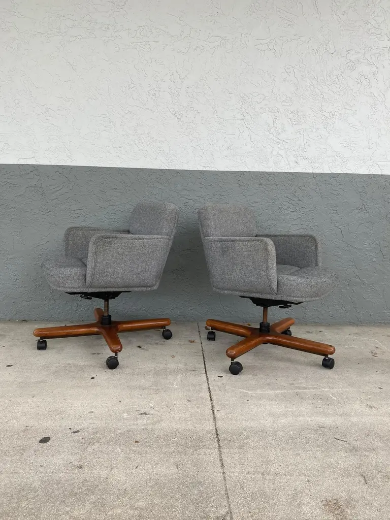 These timeless office swivel chairs are packed with personality! Outstanding design is exhibited throughout the monumental form. Post modern Style Swivel Chairs are beyond stunning. Sits on a wood swivel base. The sculptural shape also feature a comfortable sculpted barrel back tub design. Bold and striking, the pieces can be in any interior setting or capture the eye in any environment.