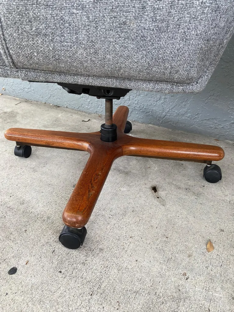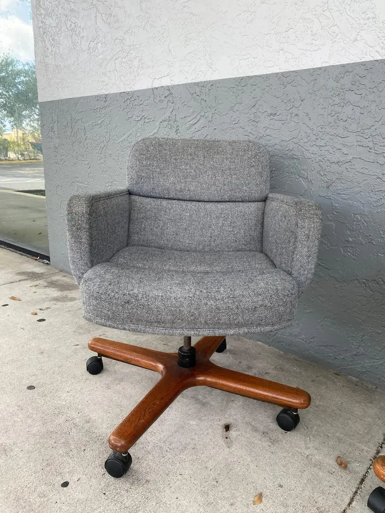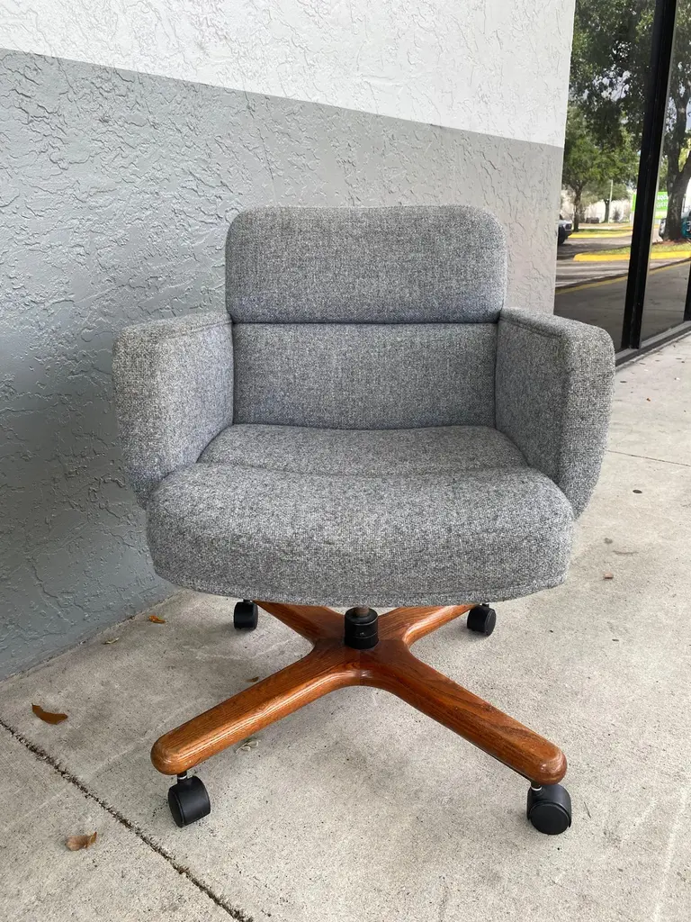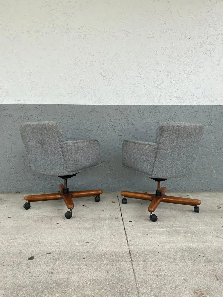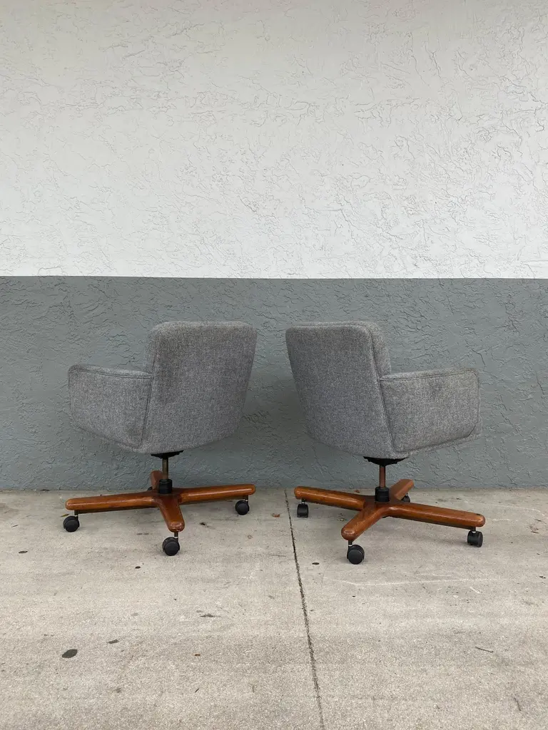 These timeless office swivel chairs are packed with personality! Outstanding design is exhibited throughout the monumental form. Post modern Style Swivel Chairs are beyond stunning. Sits on a wood swivel base. The sculptural shape also feature a comfortable sculpted barrel back tub design. Bold and striking, the pieces can be in any interior setting or capture the eye in any environment.