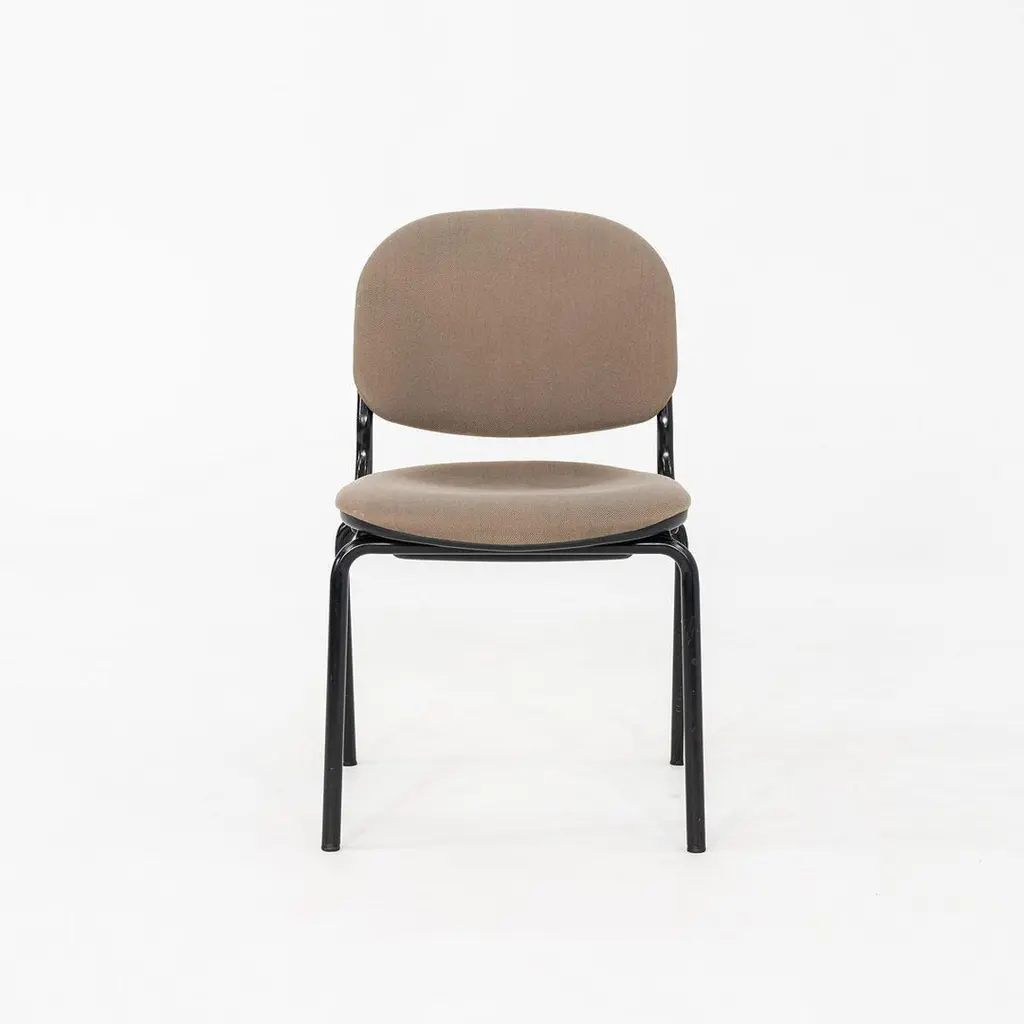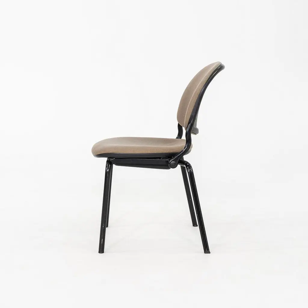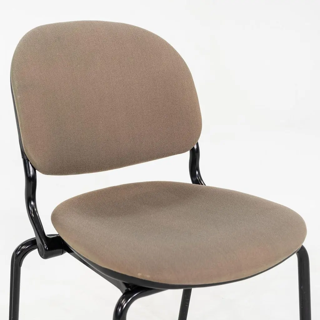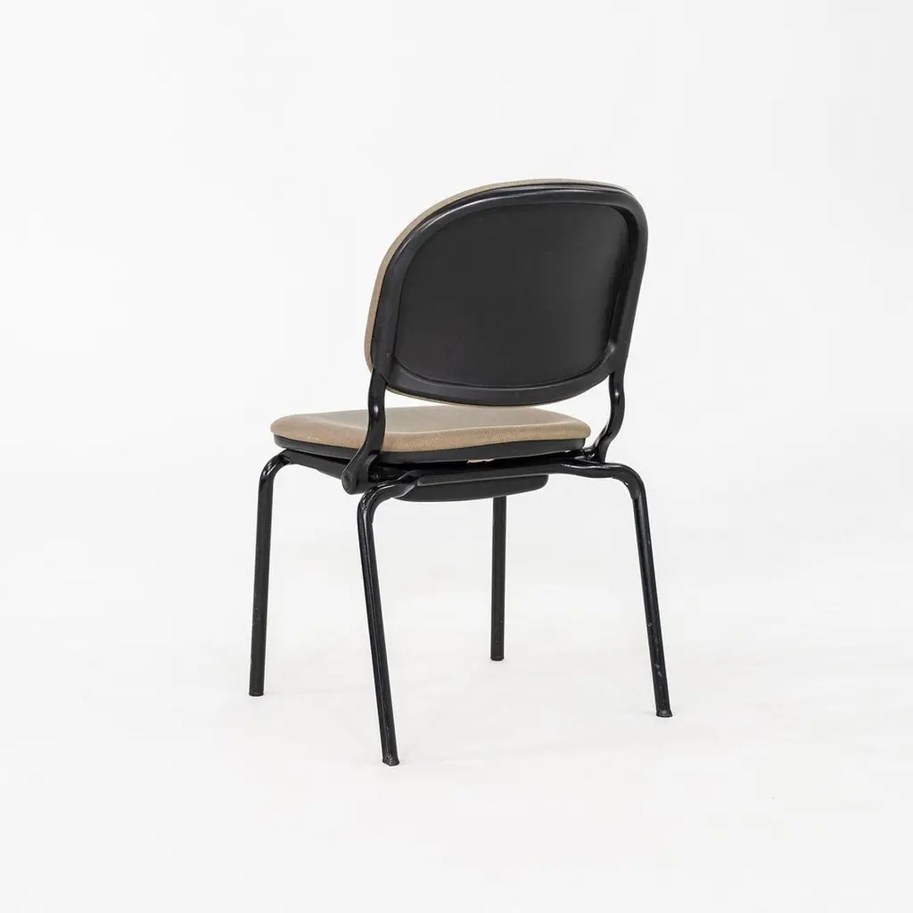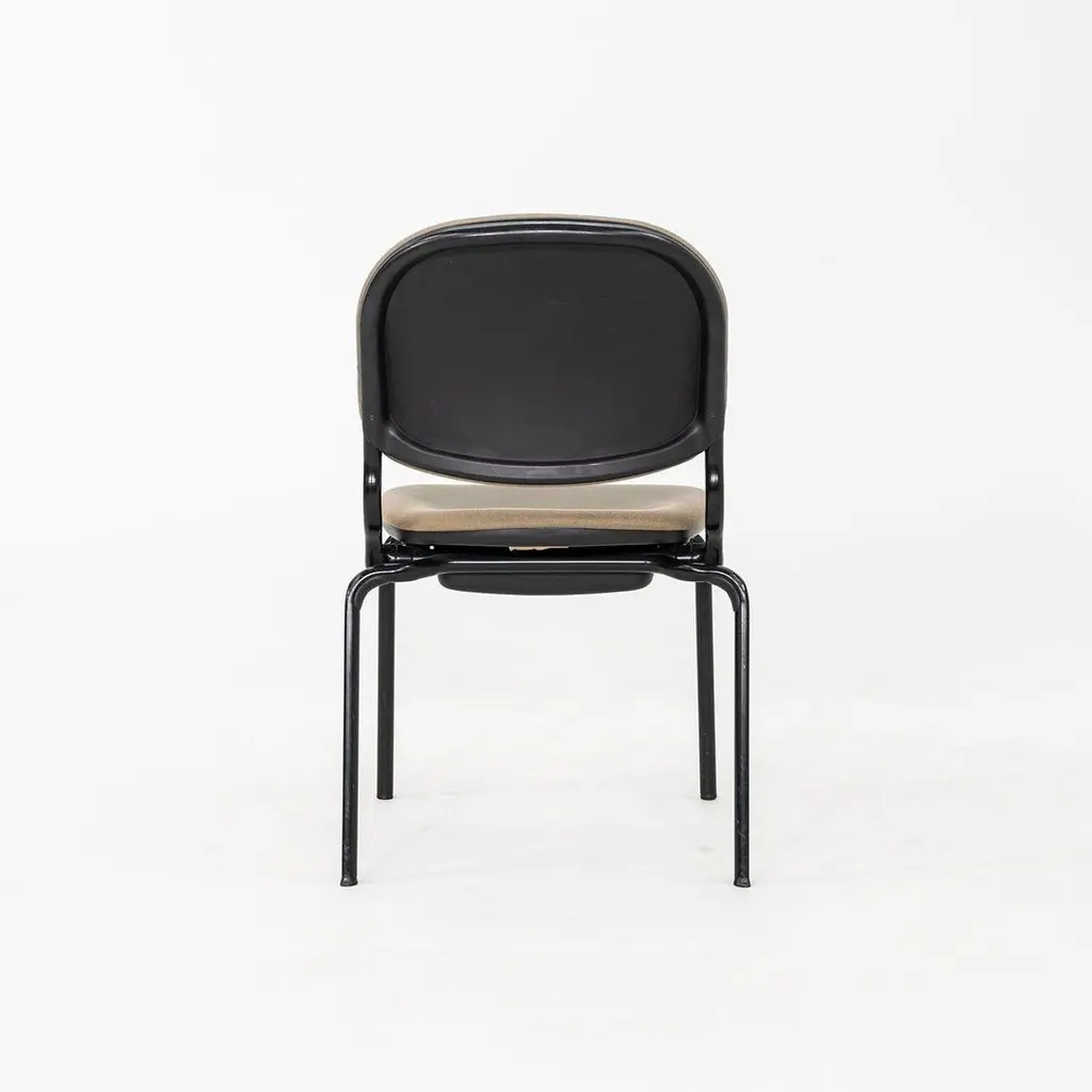 These are Torsion Stacking Chairs, originally designed by Giancarlo Piretti for Krueger Intl. These particular examples were produced in the year 1985. Their design includes a padded upholstered seat and back in a tan fabric, and they have black tubular steel frames. They easily stack on top of one another to save space whilst not in use. The listed price includes one chair and there are more than 12 available to purchase. Each chair measures 19.5 inches deep, 19.5 inches wide, and 32 inches high. They have a seat height of 17.5 inches. These pieces do show minor wear from previous use including light marks on the legs and small stains in the fabric. Overall, the chairs are in good to very good condition. Please see photos.
