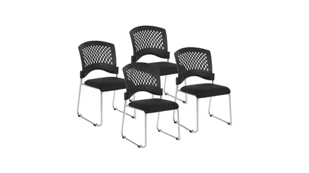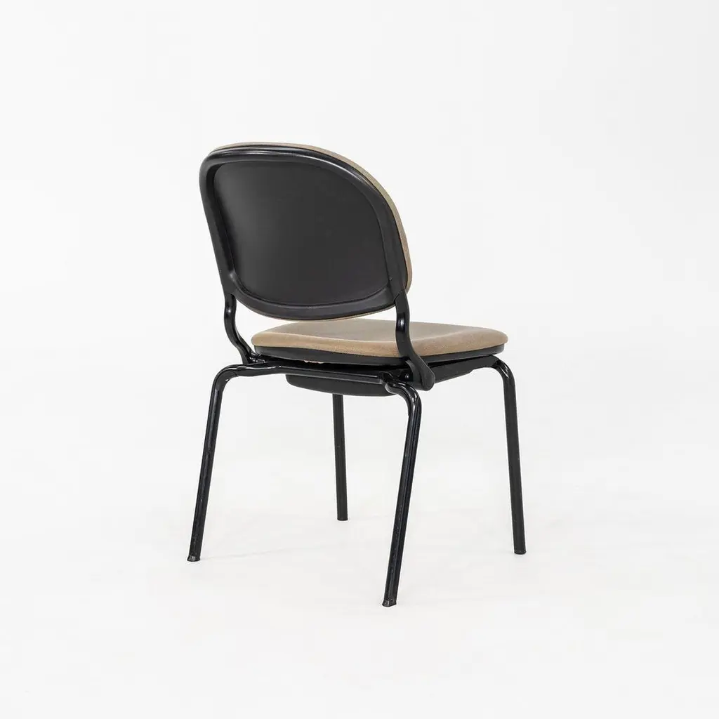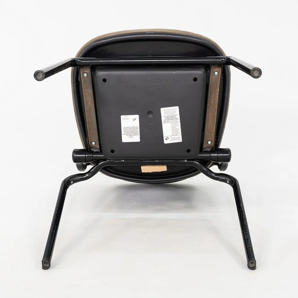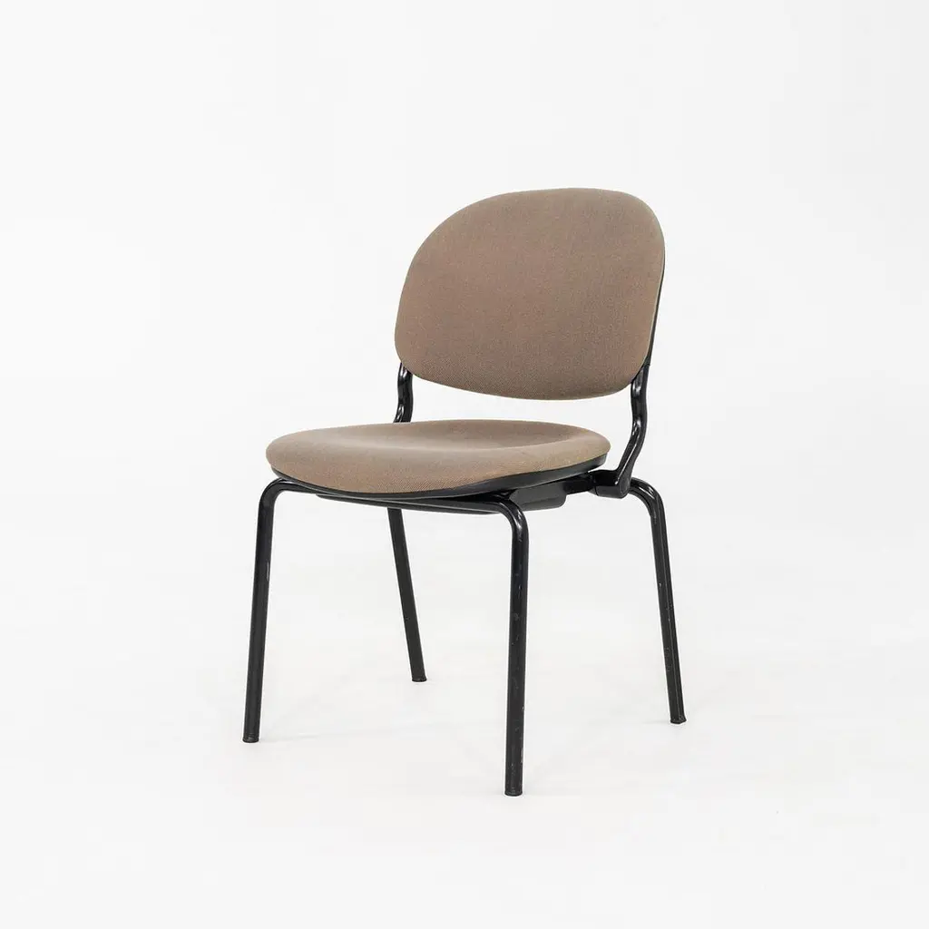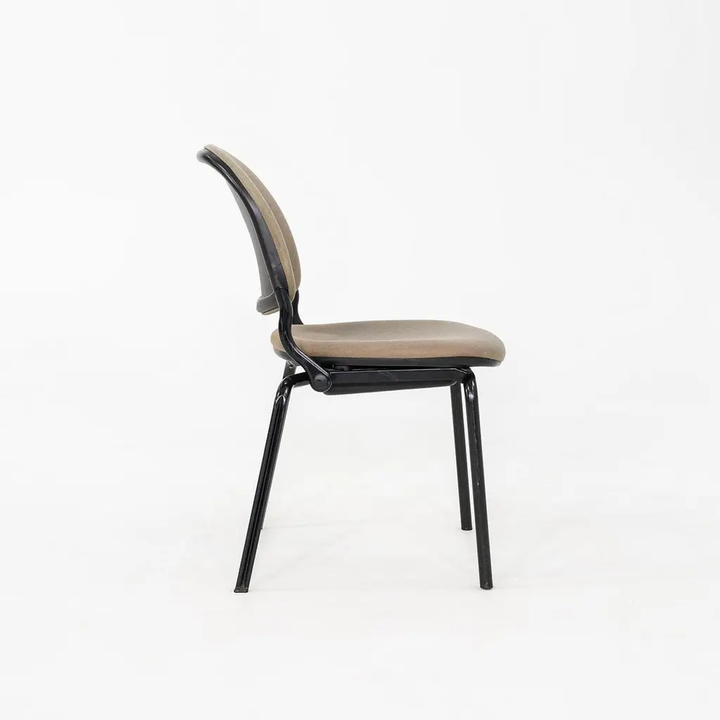 These are Torsion Stacking Chairs, originally designed by Giancarlo Piretti for Krueger Intl. These particular examples were produced in the year 1985. Their design includes a padded upholstered seat and back in a tan fabric, and they have black tubular steel frames. They easily stack on top of one another to save space whilst not in use. The listed price includes one chair and there are more than 12 available to purchase. Each chair measures 19.5 inches deep, 19.5 inches wide, and 32 inches high. They have a seat height of 17.5 inches. These pieces do show minor wear from previous use including light marks on the legs and small stains in the fabric. Overall, the chairs are in good to very good condition. Please see photos.