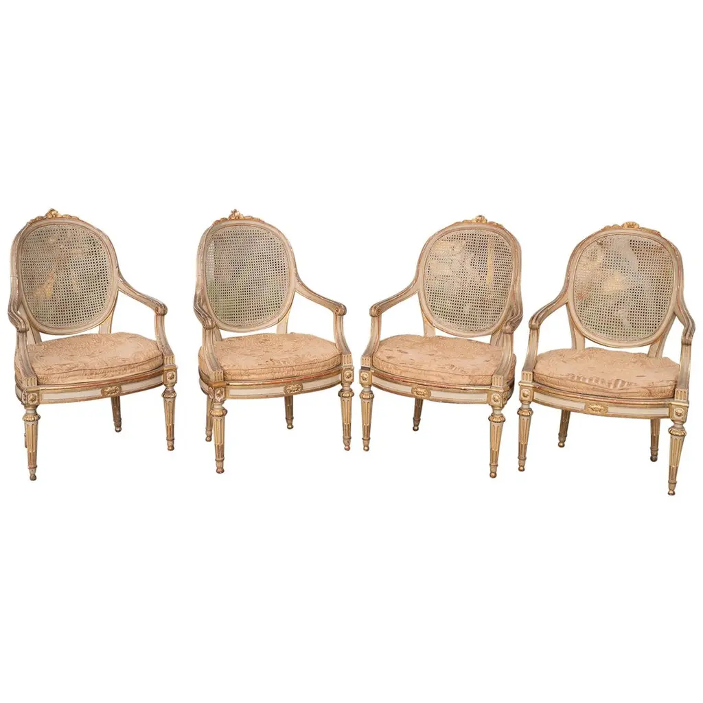 Four French chairs in hand carved walnut frame with seat and back in cane. Very good condition with no restorations. Comfortable and stable construction with cozy pillows on the seats. There are still parts of original labels under the seats.France, circa 1880