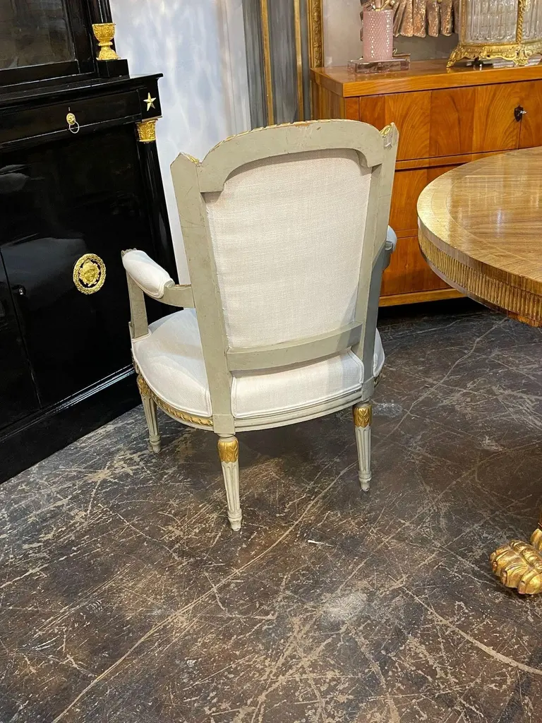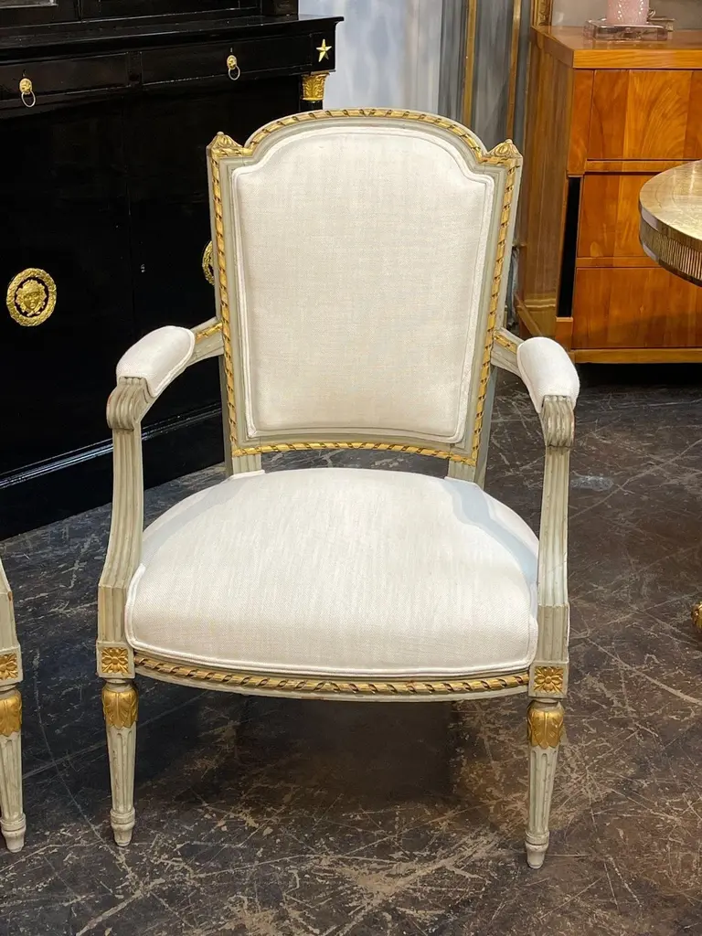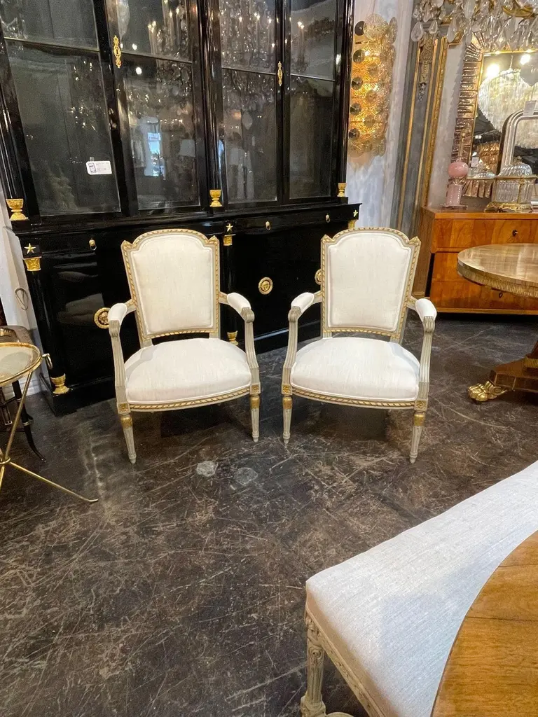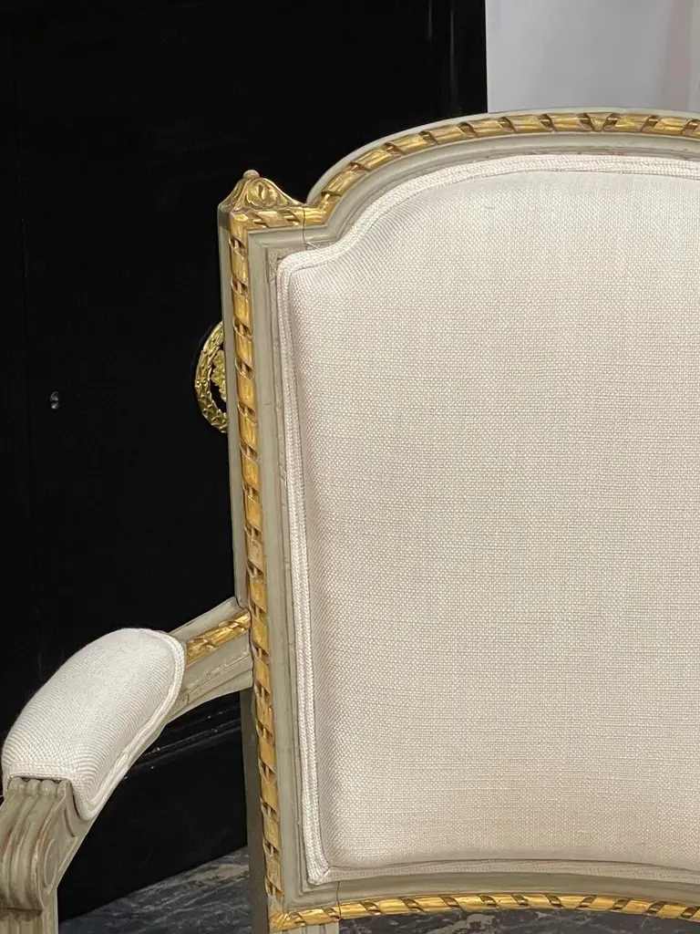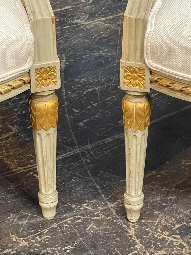 Exceptional pair of 19th century French Louis XVI carved and painted chairs with creme colored linen upholstery. Very fine carvings and beautiful patina as well. Creates an elegant look!!