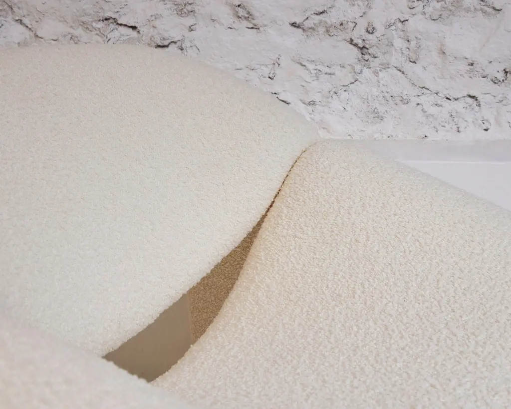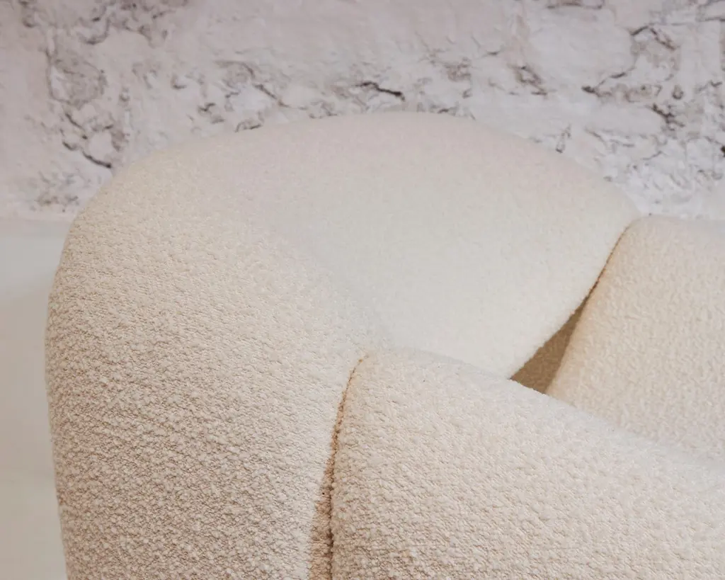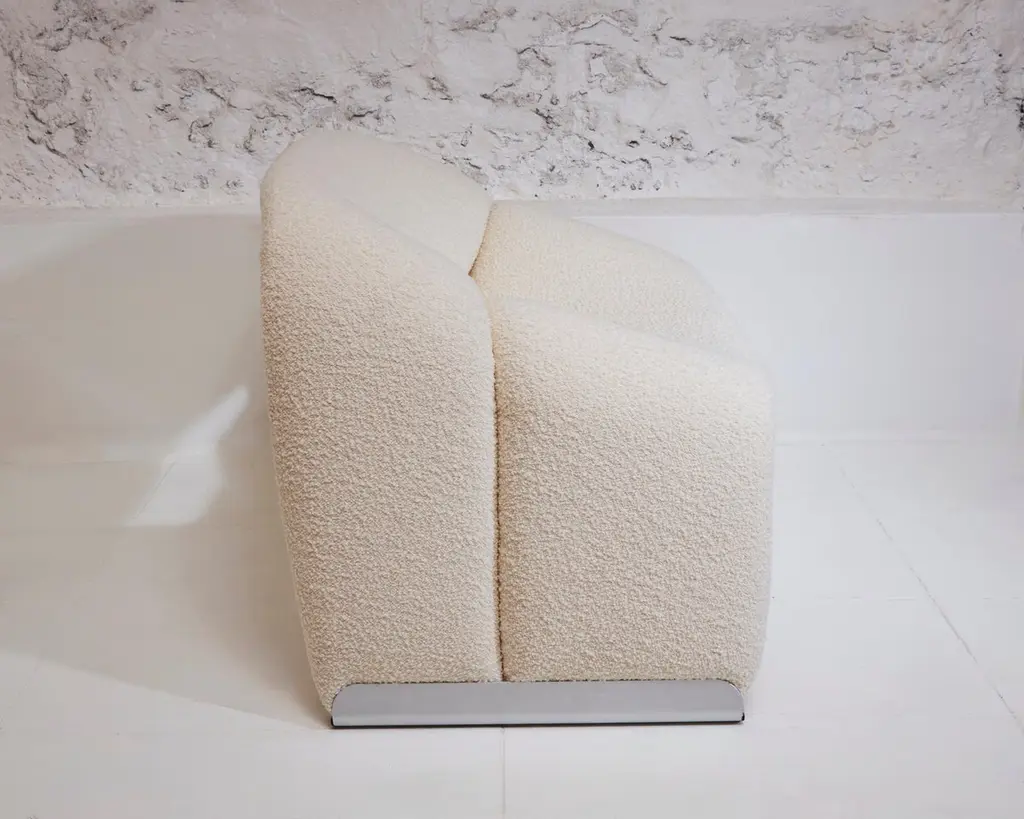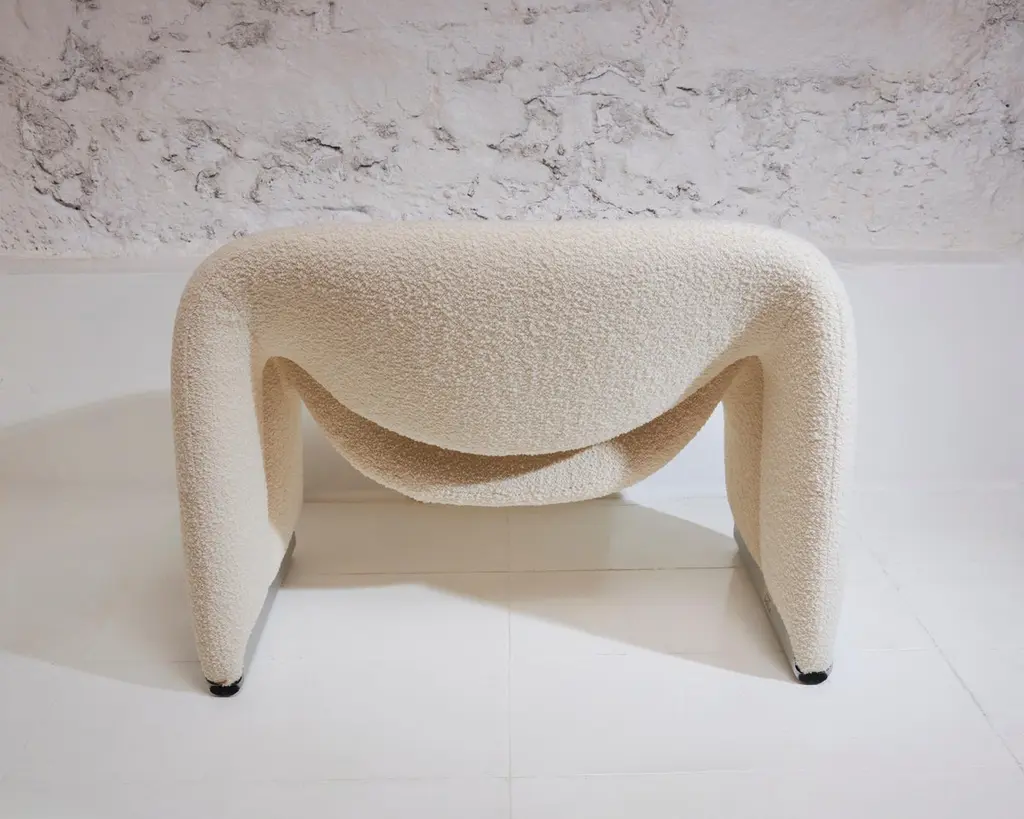 The Groovy chair, designed by Pierre Paulin, embodies the spirit of the 60's and 70's with its innovative design and iconic style. Paulin, the renowned French designer, created the Groovy chair in 1966 for Artifort, a leading furniture manufacturer known for its avant-garde designs.The Groovy chair was a departure from traditional seating, featuring a low, curvaceous form that embraced the sitter. Its distinctive shape, reminiscent of a cushion, was achieved through a unique construction method. These chairs were recently reupolstered in off-white bouclé wool.
