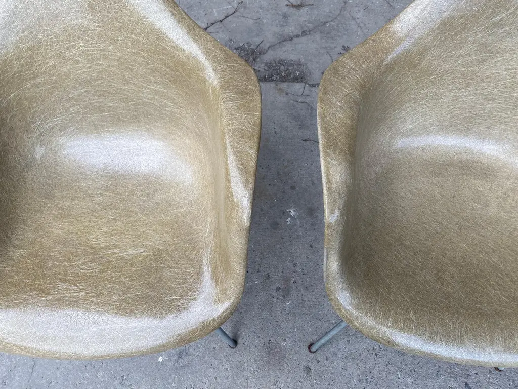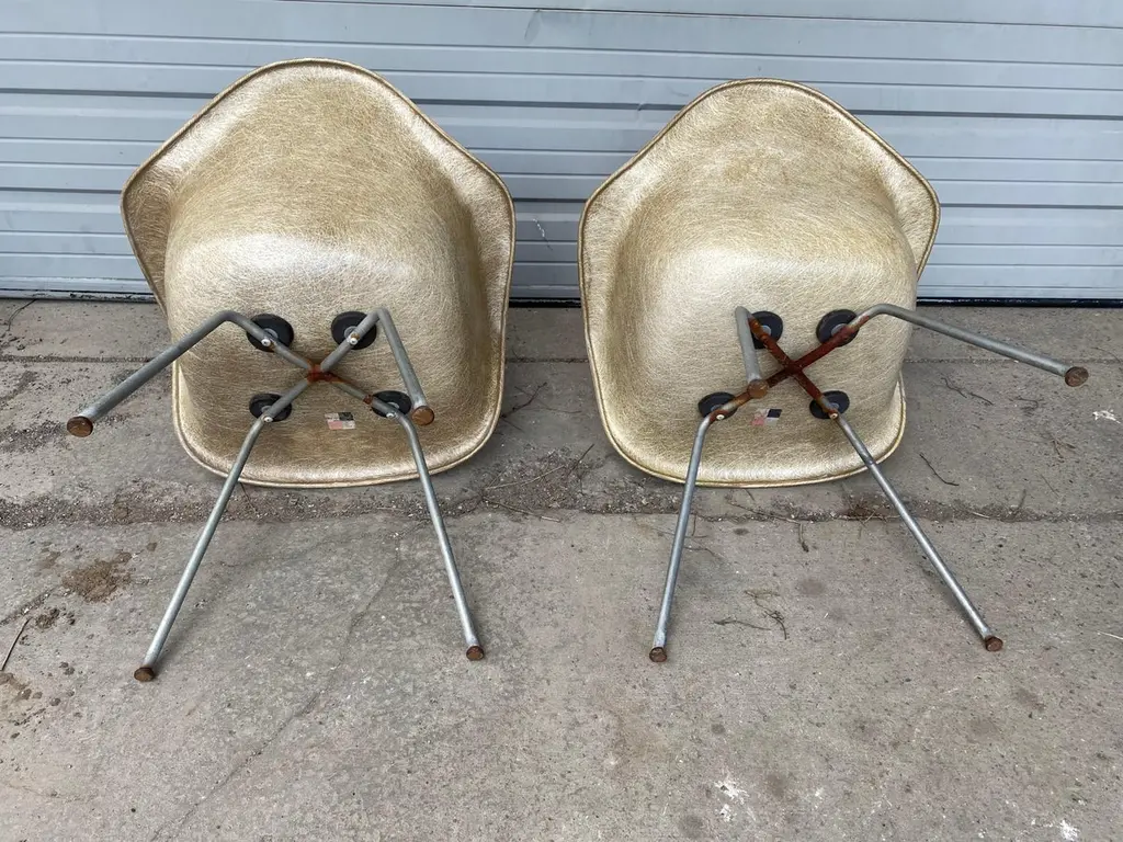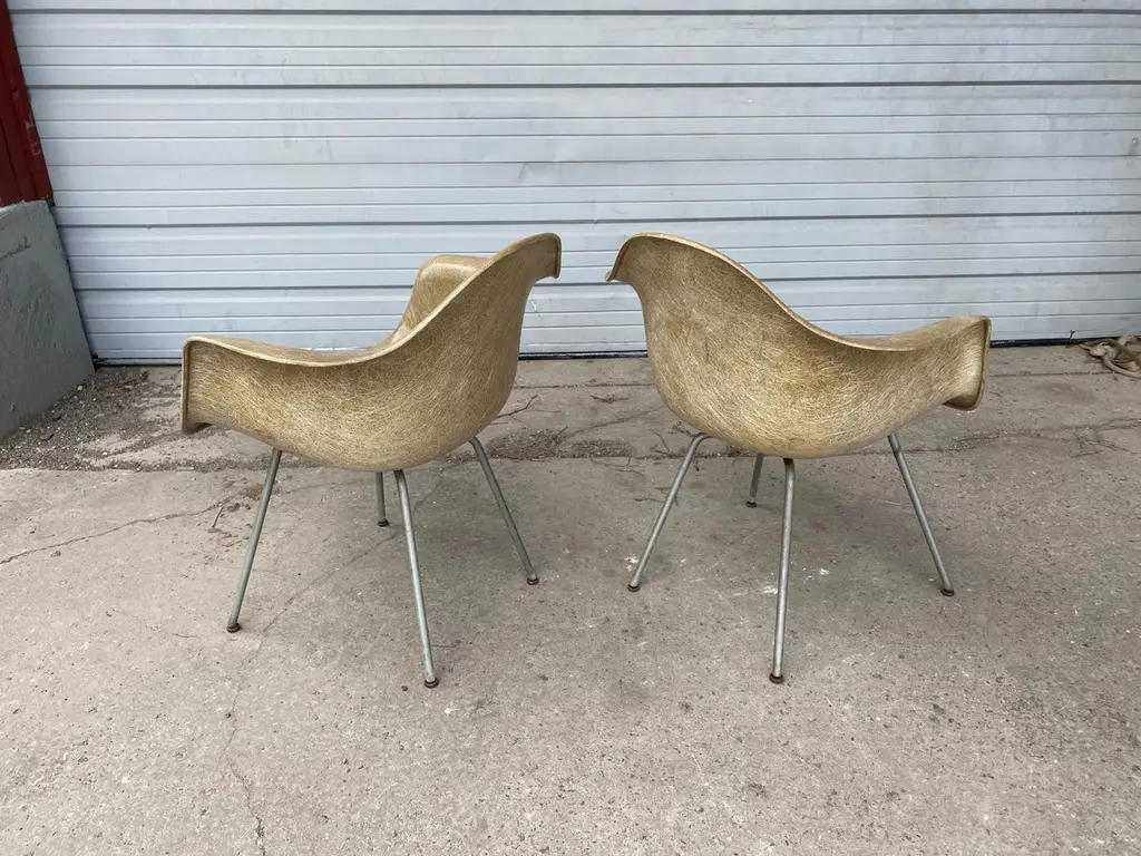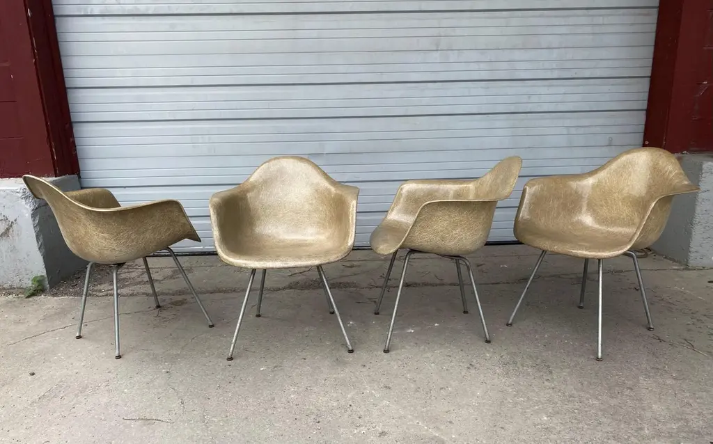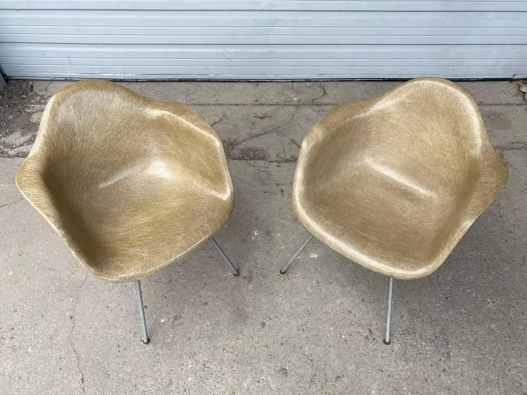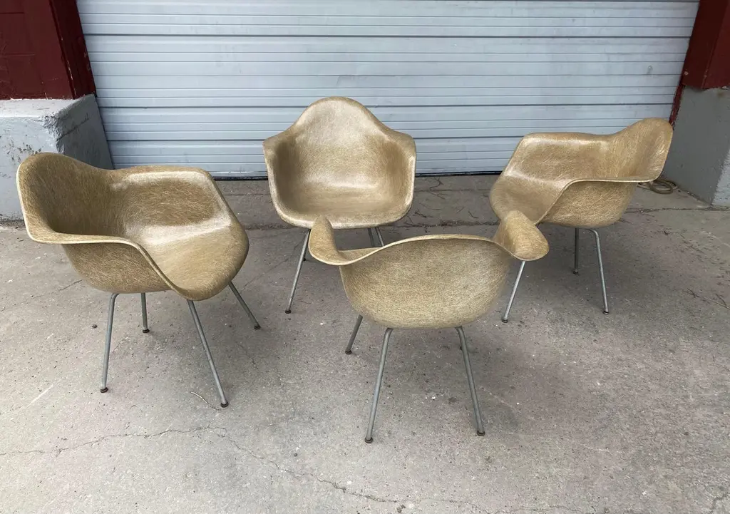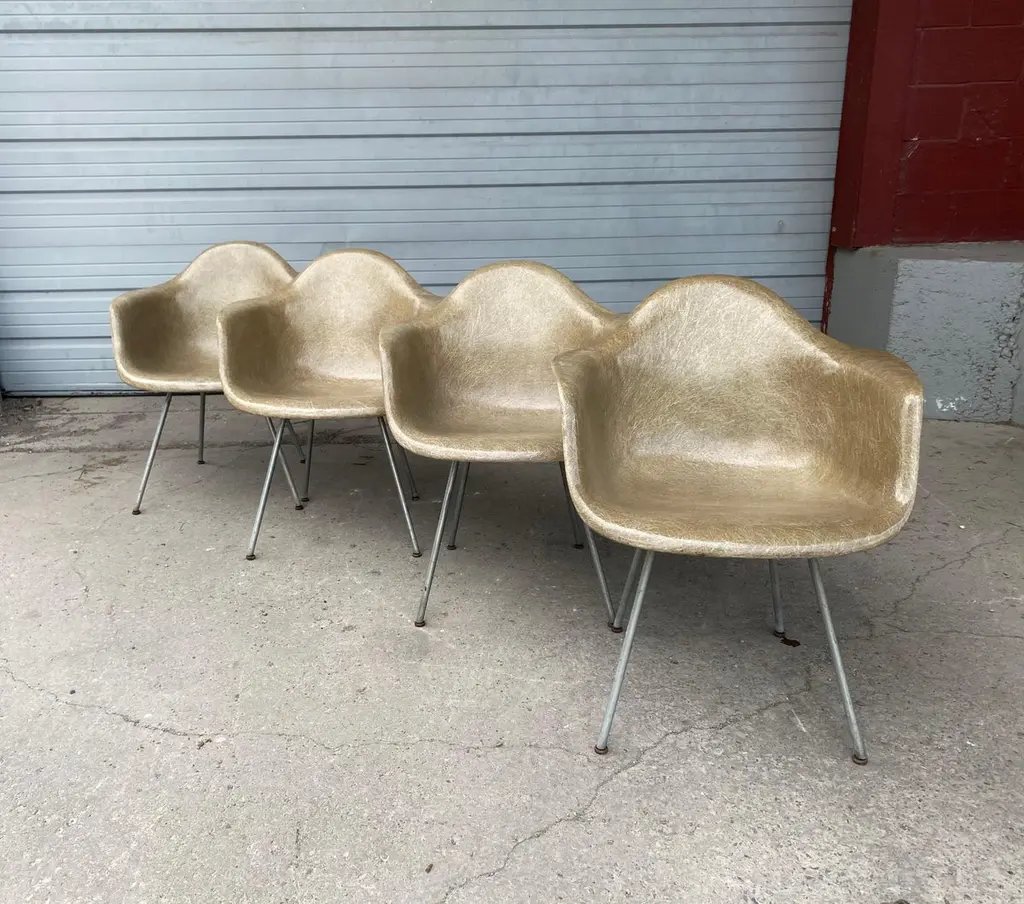 Rare, early set of 4 Charles and Ray Eames Fiberglass arm shell chairs, extremely rare "Raw Umber" color, all 4 chairs retain original checkerboard Zenith Labels, ROPE EDGE, X BASE. Large 'DOMES OF SILENCE" rubber shock mounts and all feet pads. Amazing exposed fibers, /gel coat, Nearly impossible to find one, let alone a complete matched set of 4, priced individually...Collectors dream.