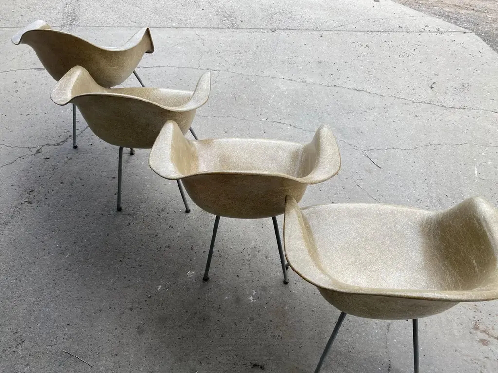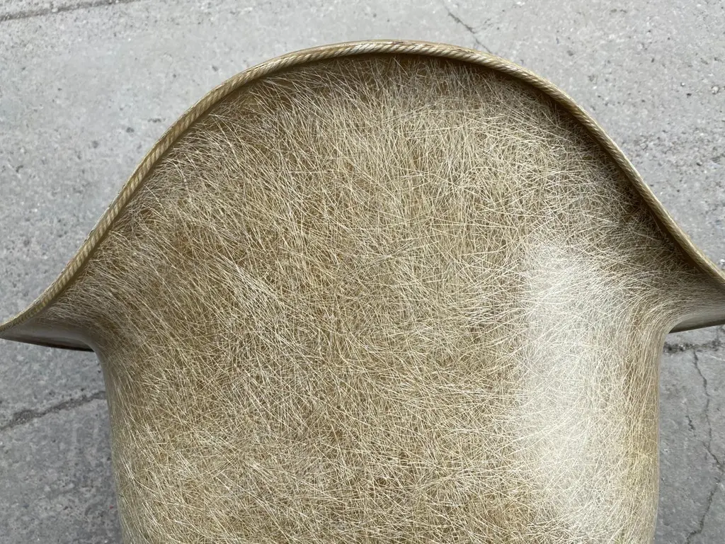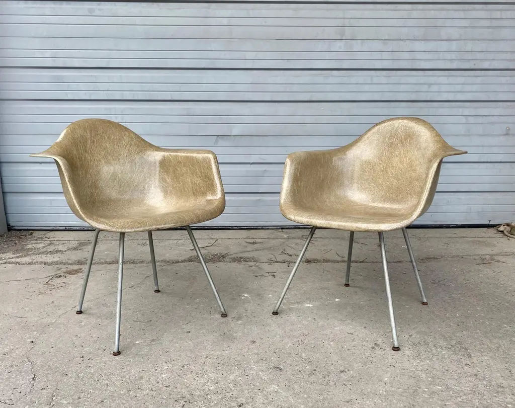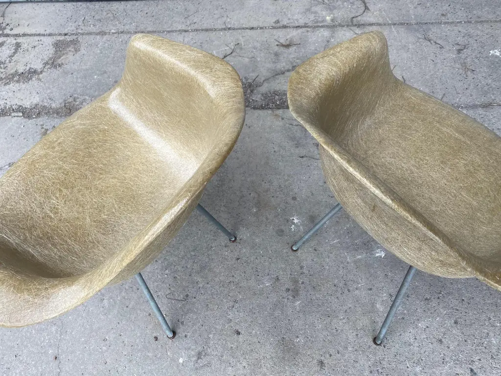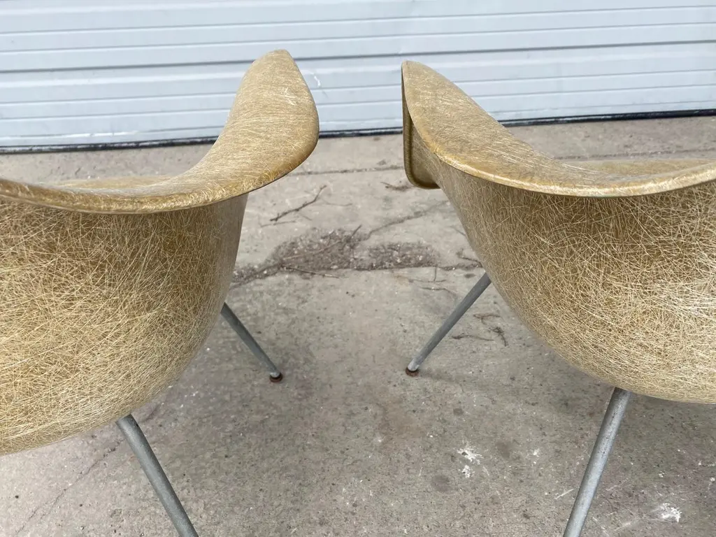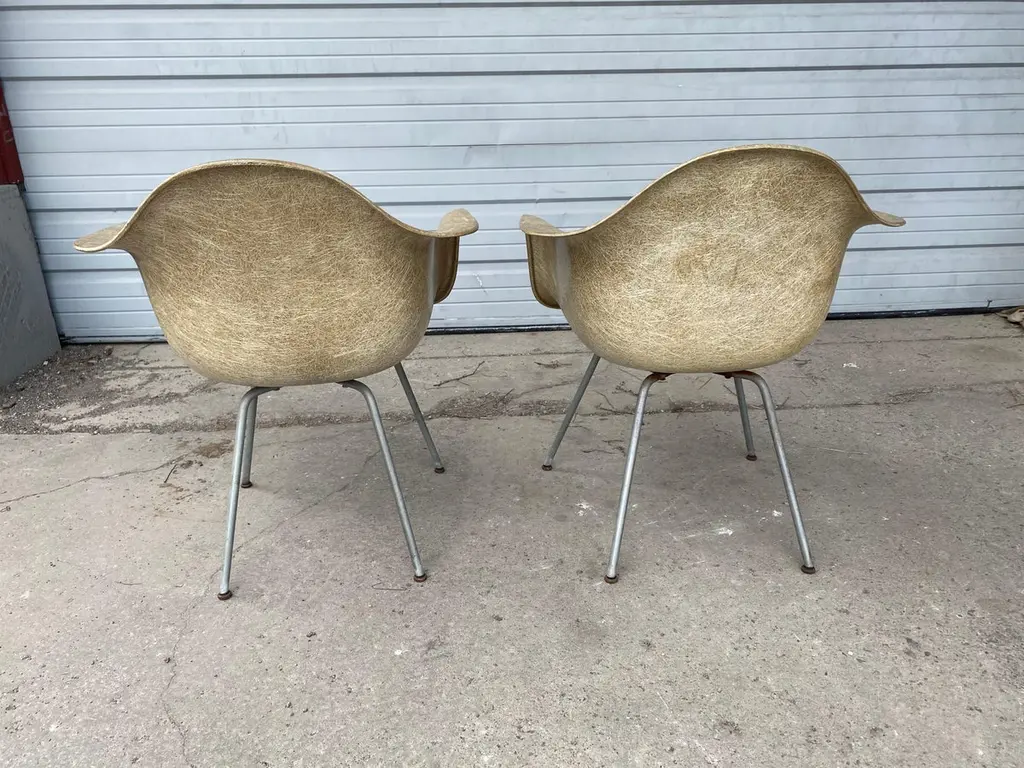 Rare, early set of 4 Charles and Ray Eames Fiberglass arm shell chairs, extremely rare "Raw Umber" color, all 4 chairs retain original checkerboard Zenith Labels, ROPE EDGE, X BASE. Large 'DOMES OF SILENCE" rubber shock mounts and all feet pads. Amazing exposed fibers, /gel coat, Nearly impossible to find one, let alone a complete matched set of 4, priced individually...Collectors dream.