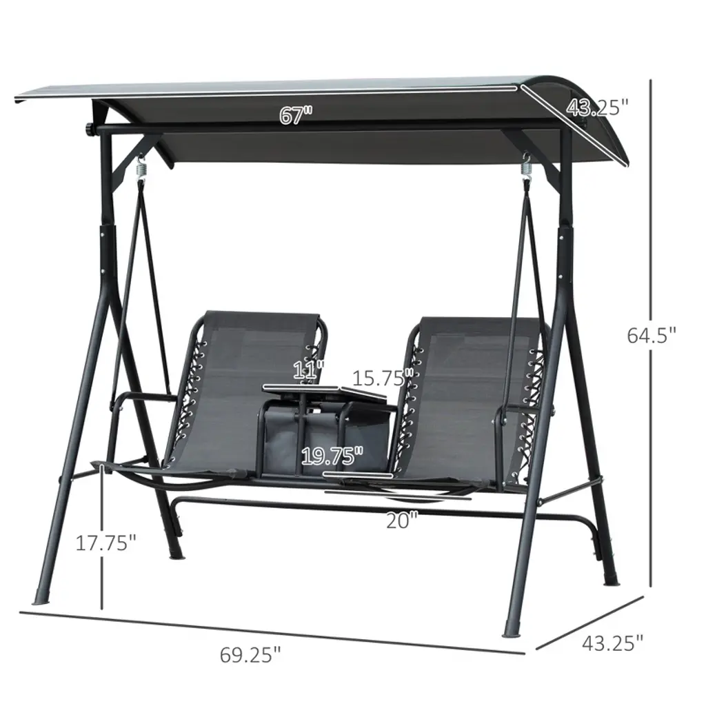 Seats 2 Adults: With a 264 lbs weight capacity per seat, this canopy porch swing offers versatile outdoor seating perfect for campfires, cookouts, or a cozy Saturday. Enjoy fresh air together with ample room for two.Tilting Sun Shade Canopy: The removable top canopy keeps you cool while blocking UV rays and stopping sunburns. It also keeps your seat clean from dust, leaves, and debris. Tilt the roof angle to eliminate glare from any direction — truly a canopy that can.Everything in Its Place: Features a central console with a tabletop, two drink holders, and hidden storage to keep outdoor essentials handy and beverages secure during leisure time.Outdoor Ready Materials: Crafted from solid steel with a strong A-frame design for durability. The breathable mesh seat stays cool and dries quickly after rain. Heavy-duty springs provide smooth, reliable rocking motion, supporting up to 528 lbs plus storage.Outdoor Swing Seat Info: Overall Dimensions: 69.25" W x 45.75" D x 64.5" H. Single Seat Size: 20" W x 19.75" D. Weight Capacity: 264 lbs per seat. Includes non-slip footpads for safety. Assembly time approximately 1 hour with 2 adults.