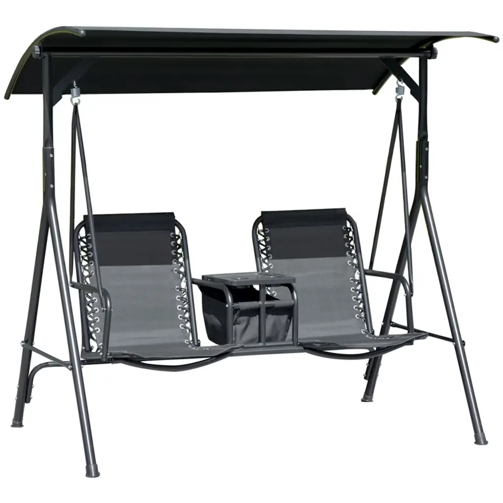 Outdoor Porch Swing Chair: Seats two adults, perfect for sunny summer days to sit back, rock, and enjoy the breeze with a friend. Ideal for patios, poolside, backyard, or balcony.Tilting Sunshade Canopy: Adjustable canopy blocks UV rays, prevents sunburns, keeps you dry in light rain, and reduces glare from any angle.Fast Drying: Made with breathable polyester mesh that drains rain and dries quickly, so you can swing comfortably even on cloudy days.Steel Patio Swing: Constructed from strong load-bearing steel with a stable "A" frame design. Anti-slip foot pads protect surfaces and keep balance.Canopy Porch Swing Info: Overall Dimensions: 67.75" L x 43.25" W x 61" H. Seat Dimensions: 52" W x 17.25" D x 18" H. Weight Capacity: 440 lbs. Assembly required.