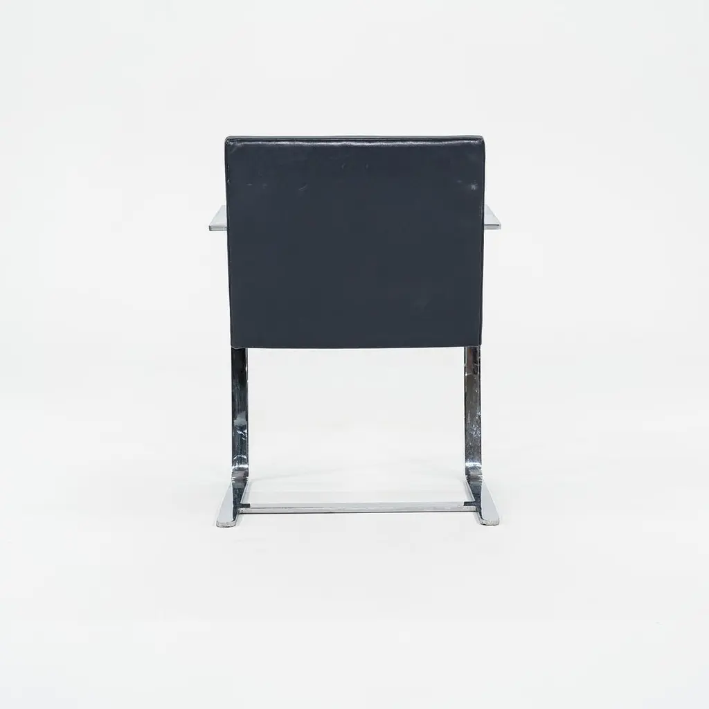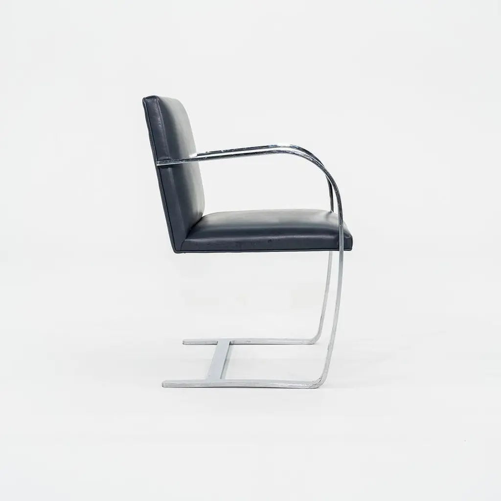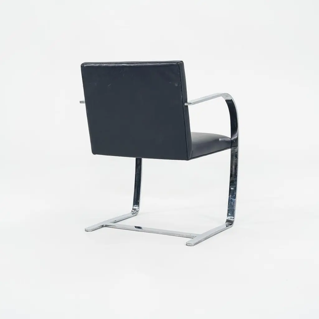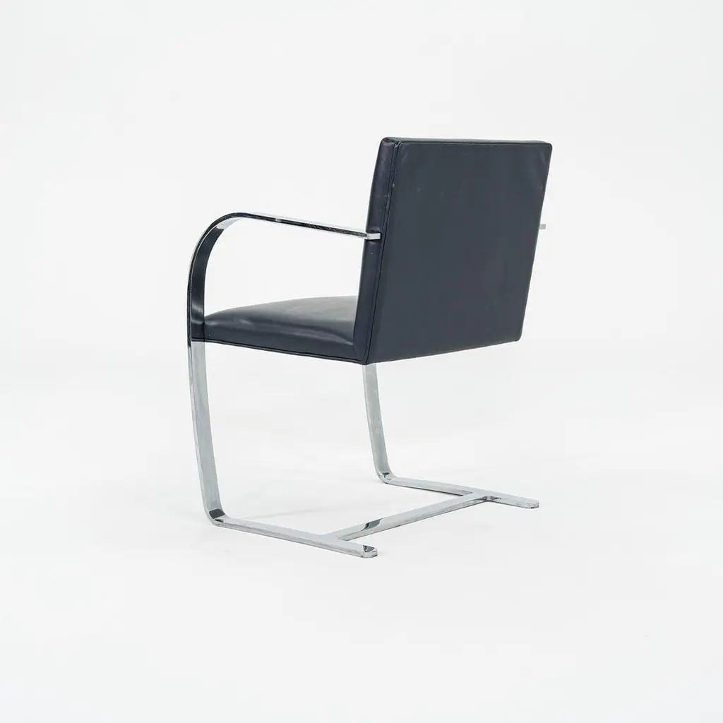 This is a Flat Bar Brno Armchair, Model 255, initially designed by Mies van der Rohe in 1930. These examples were manufactured by Knoll in the 2000s, and the listed price includes one chair. We have several of these pieces available for purchase in this colorway. They feature a cantilevered frame and have upholstered seats in high-end dark blue (looks black in some light) Italian leather. The frames are chromed steel. Each chair measures 23 inches deep, 23 inches wide, and 31 inches tall. They have an arm height of 28 inches, and a seat height of 17 inches. These chairs have been previously used, having come to us from a corporate environment. They show some wear and patina to the leather. The leather appears black in some light, and navy blue in other light. It's possible that the leather was midnight blue and has darkened with age, or that the black leather has lightened with age. There are some light scratches and scuffs on the arms and the bases. Overall, this set is in good condition with some wear. Please see photos.