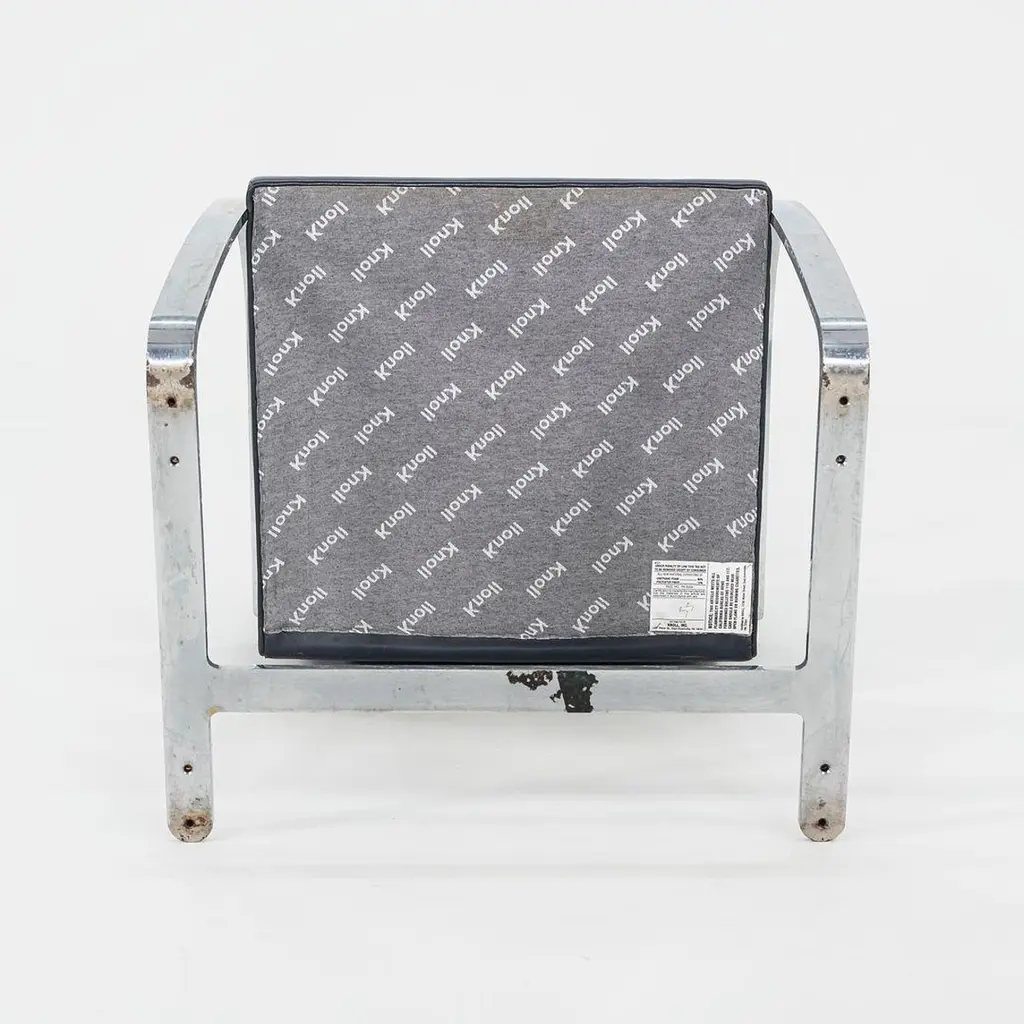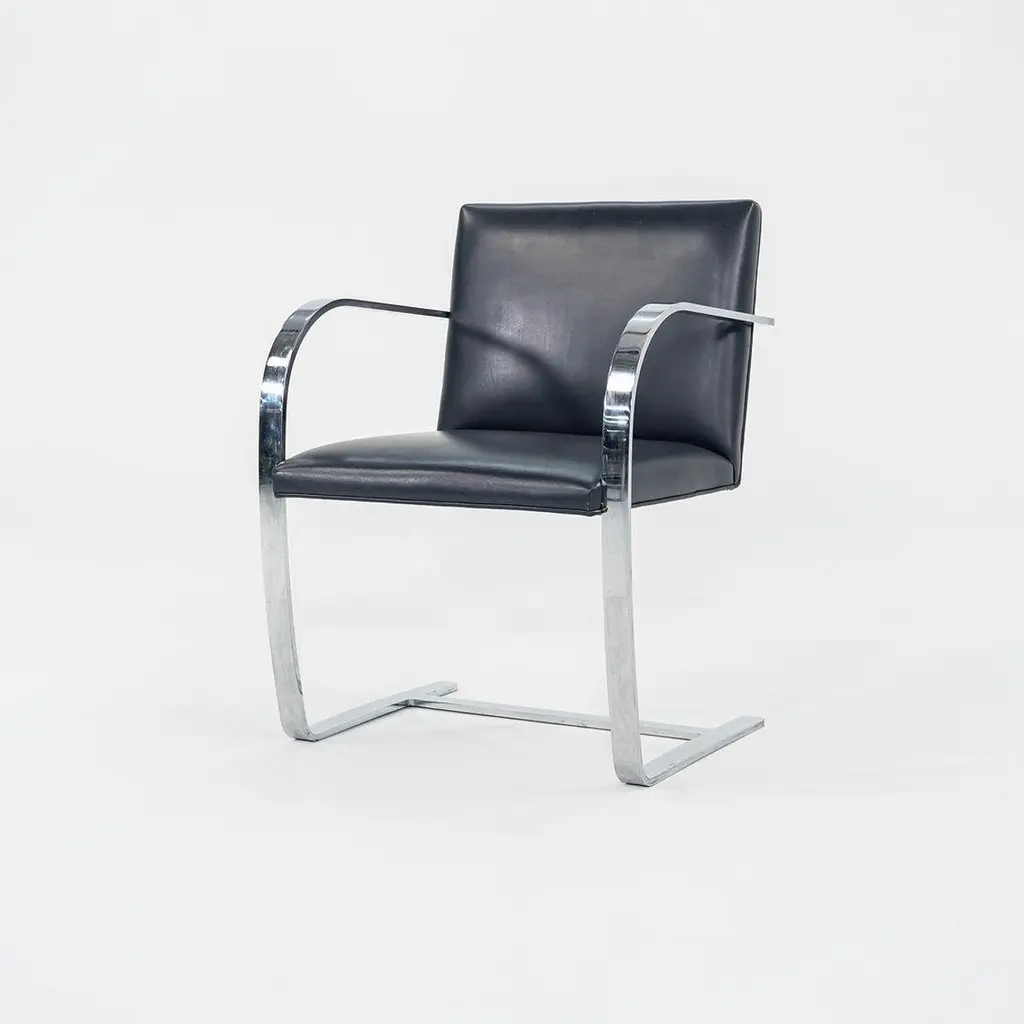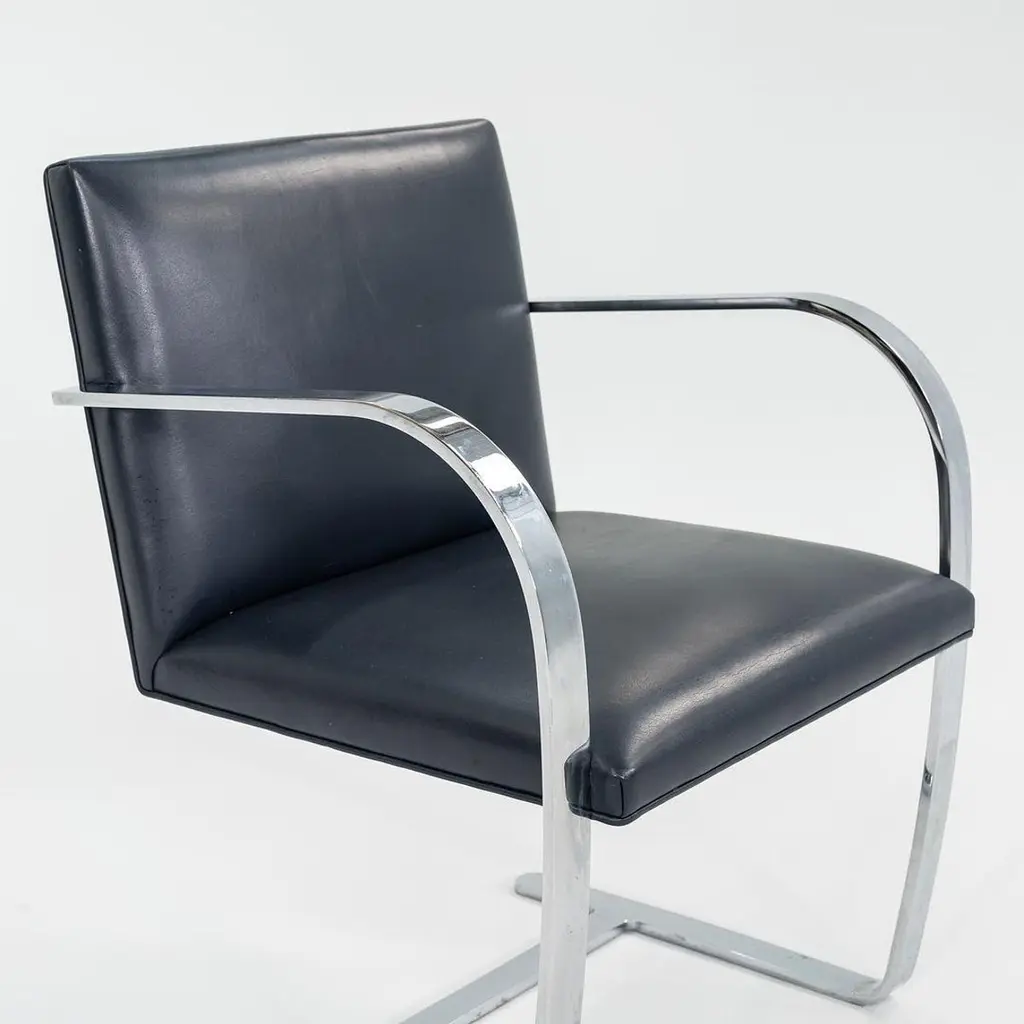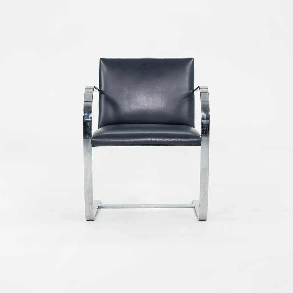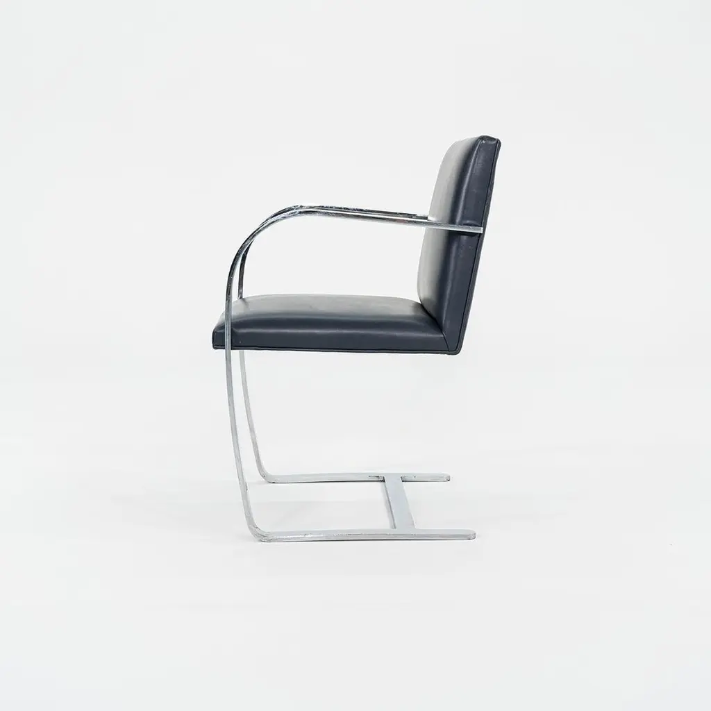 This is a Flat Bar Brno Armchair, Model 255, initially designed by Mies van der Rohe in 1930. These examples were manufactured by Knoll in the 2000s, and the listed price includes one chair. We have several of these pieces available for purchase in this colorway. They feature a cantilevered frame and have upholstered seats in high-end dark blue (looks black in some light) Italian leather. The frames are chromed steel. Each chair measures 23 inches deep, 23 inches wide, and 31 inches tall. They have an arm height of 28 inches, and a seat height of 17 inches. These chairs have been previously used, having come to us from a corporate environment. They show some wear and patina to the leather. The leather appears black in some light, and navy blue in other light. It's possible that the leather was midnight blue and has darkened with age, or that the black leather has lightened with age. There are some light scratches and scuffs on the arms and the bases. Overall, this set is in good condition with some wear. Please see photos.