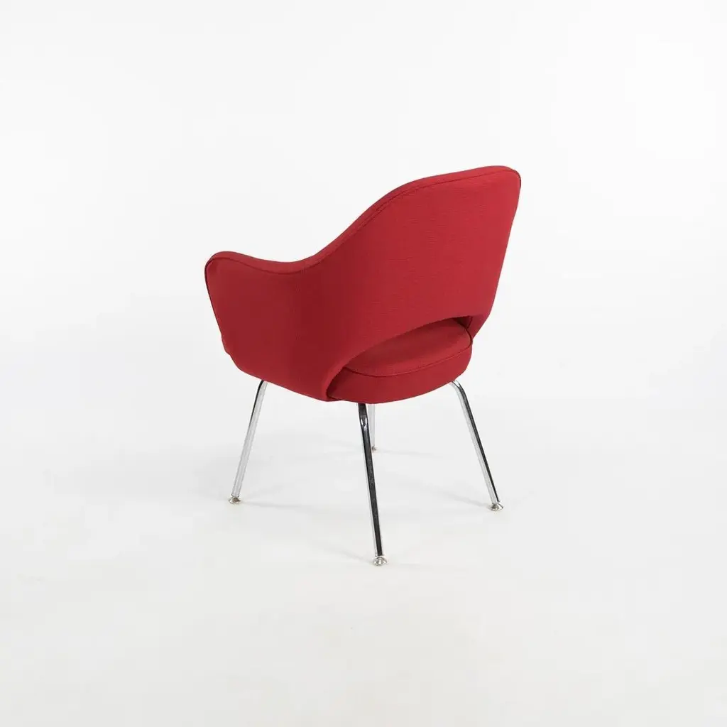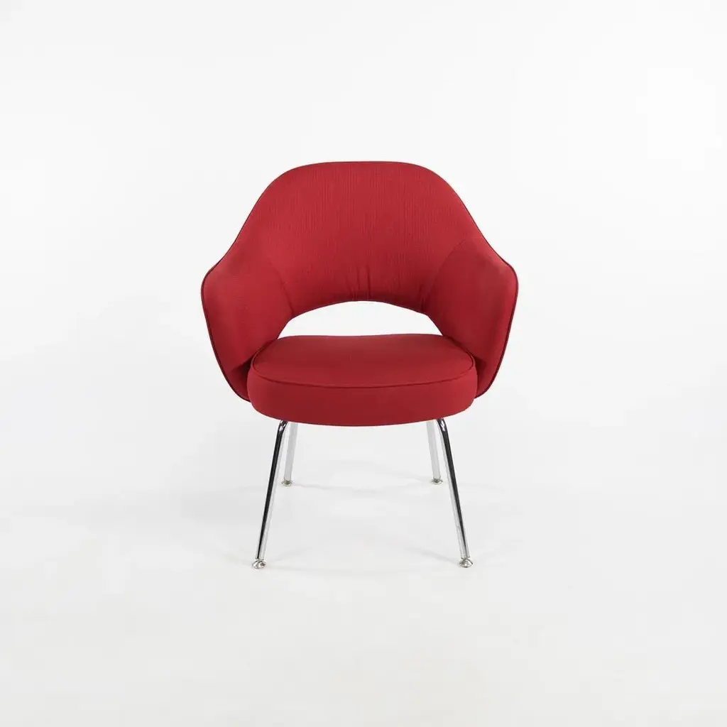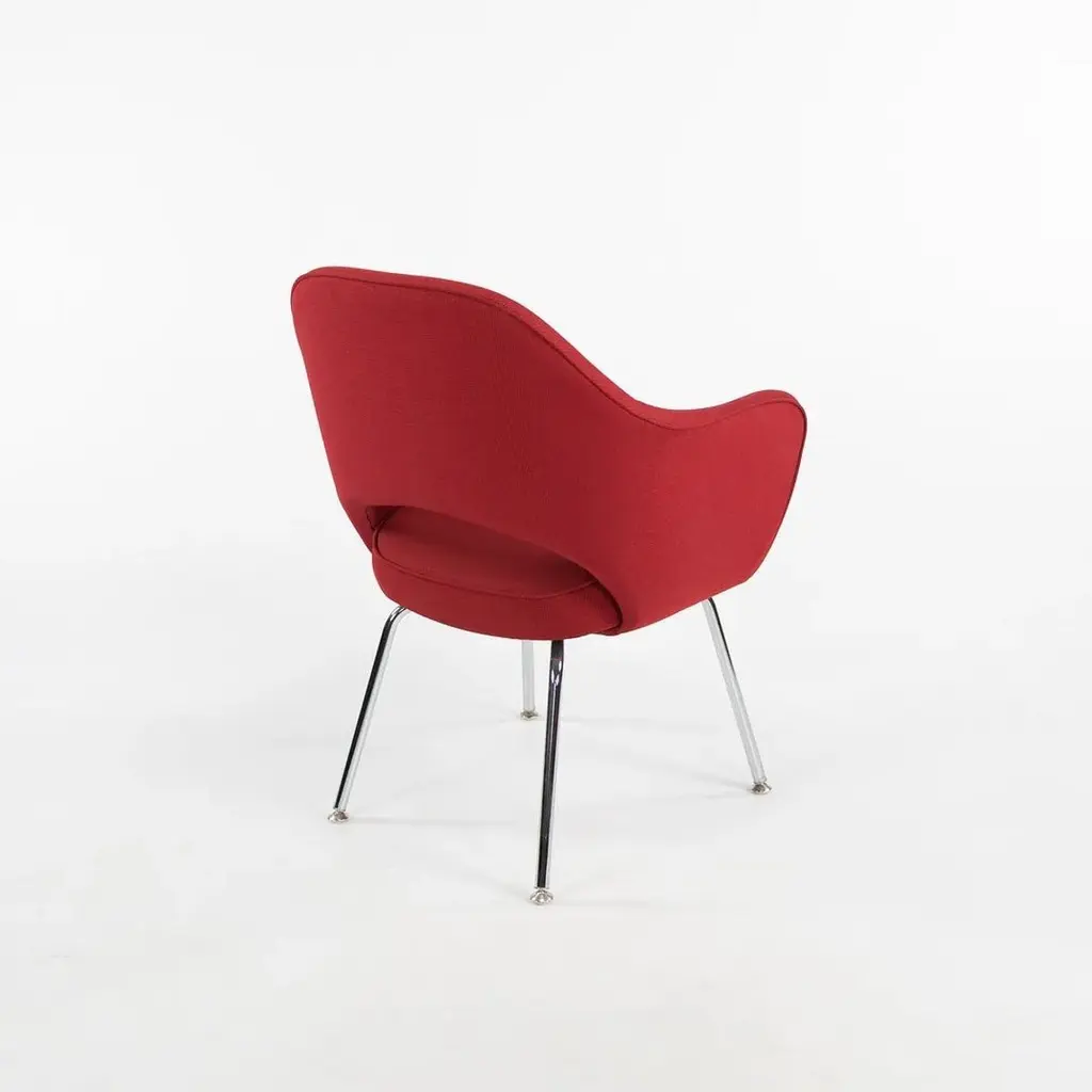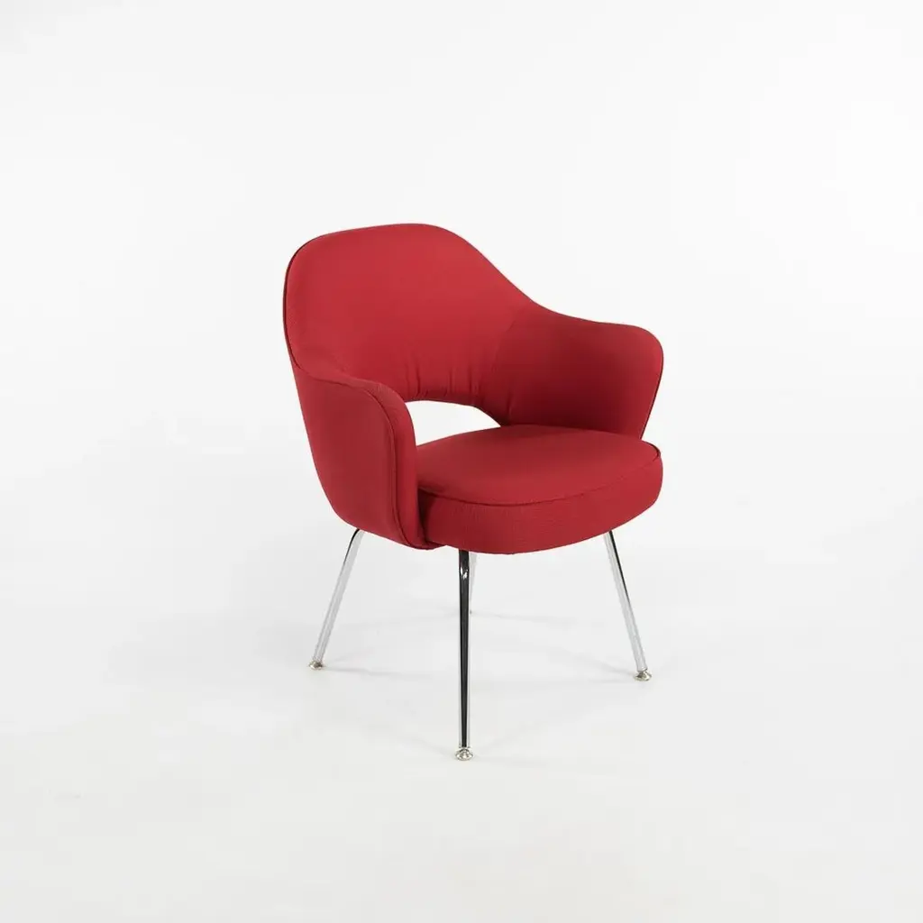 This is a Saarinen Executive Arm Chair, Model 71A, designed in 1948 by Eero Saarinen and produced by Knoll. This particular example was produced in the 2010s. The design features chromed-steel tubular legs, and has an upholstered seat and back. The listed price includes one chair, and we have several chairs available for individual purchase.Each chair measures 26 inches wide, 24.75 inches deep, and 31.5 inches high. The seat height is 18 inches. There is minor light scratching apparent on the chromed- steel bases. The original red fabric is in good condition with slight signs of age. Overall, these pieces are in very good condition with light wear from use. Please see photos.