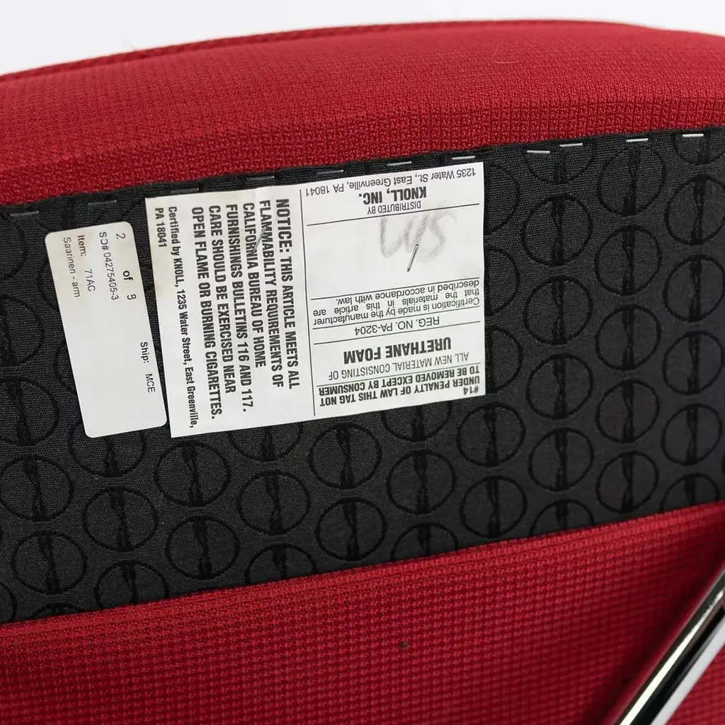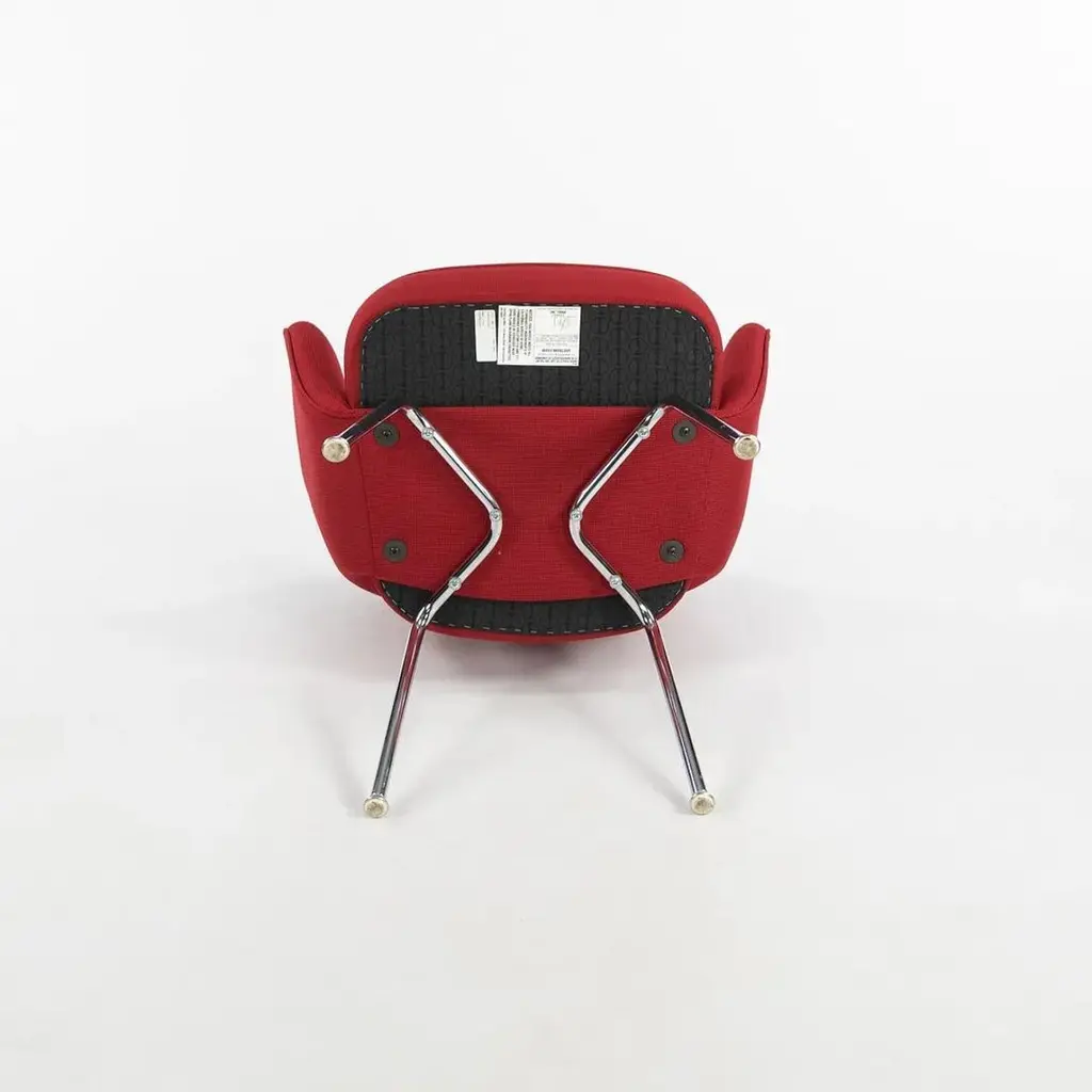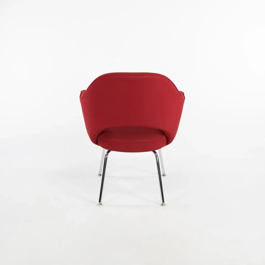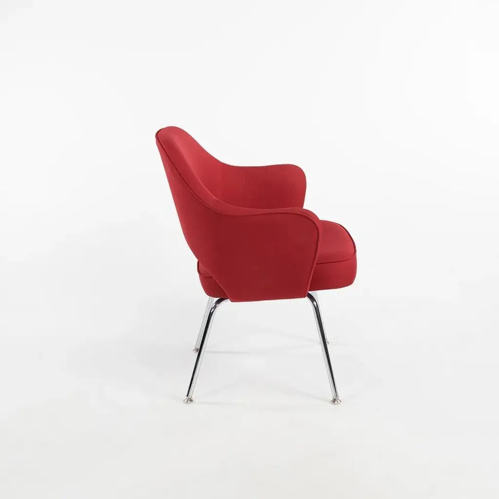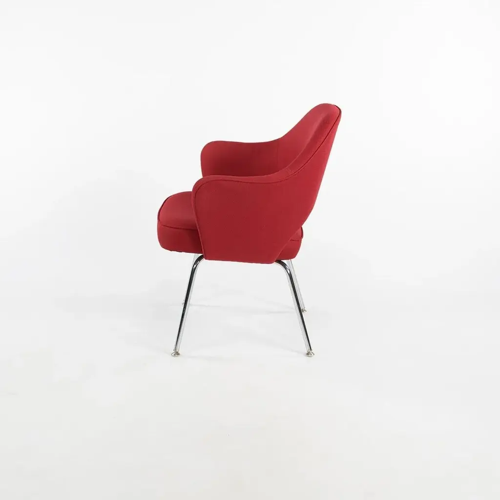 This is a Saarinen Executive Arm Chair, Model 71A, designed in 1948 by Eero Saarinen and produced by Knoll. This particular example was produced in the 2010s. The design features chromed-steel tubular legs, and has an upholstered seat and back. The listed price includes one chair, and we have several chairs available for individual purchase.Each chair measures 26 inches wide, 24.75 inches deep, and 31.5 inches high. The seat height is 18 inches. There is minor light scratching apparent on the chromed- steel bases. The original red fabric is in good condition with slight signs of age. Overall, these pieces are in very good condition with light wear from use. Please see photos.