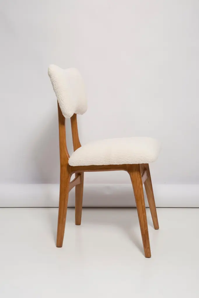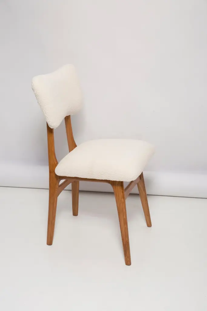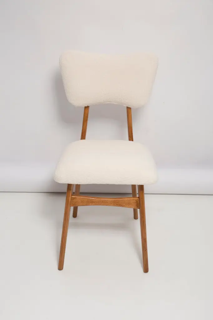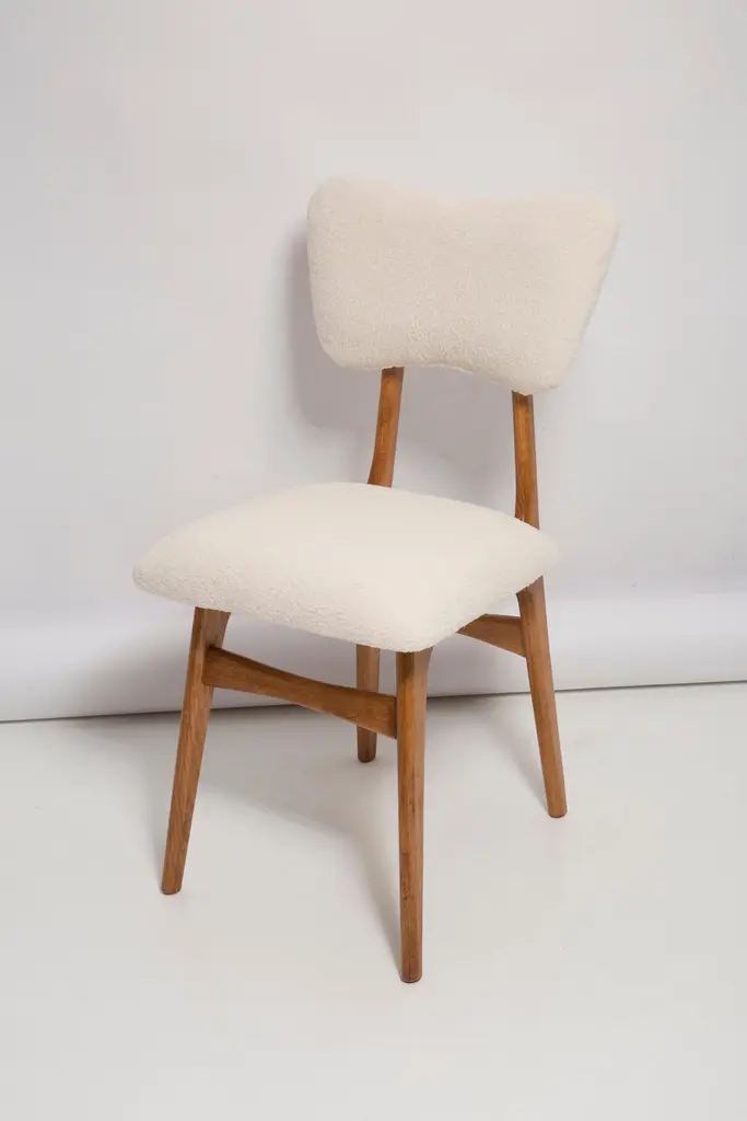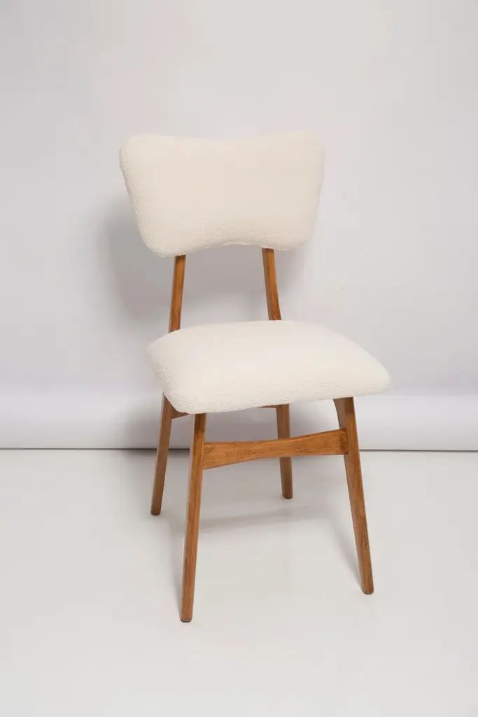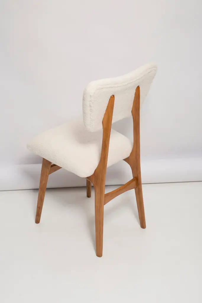 Chair designed by Prof. Rajmund Halas. Made of beechwood in medium oak color. Chair is after a complete upholstery renovation; the woodwork has been refreshed. Seat and back is dressed in crème, durable and pleasant to the touch bouclé fabric (color 01). Chair is stabile and very shapely. They were produced in former furniture factory in Goleniów in the 1960s. We can prepare this chair in every color of wood and fabric also in bigger sets. Please check the last picture with bouclé and wood color samples.