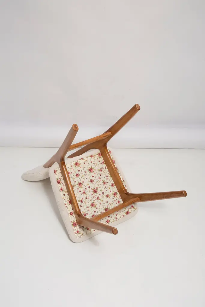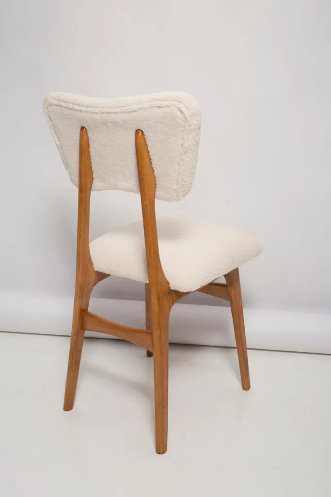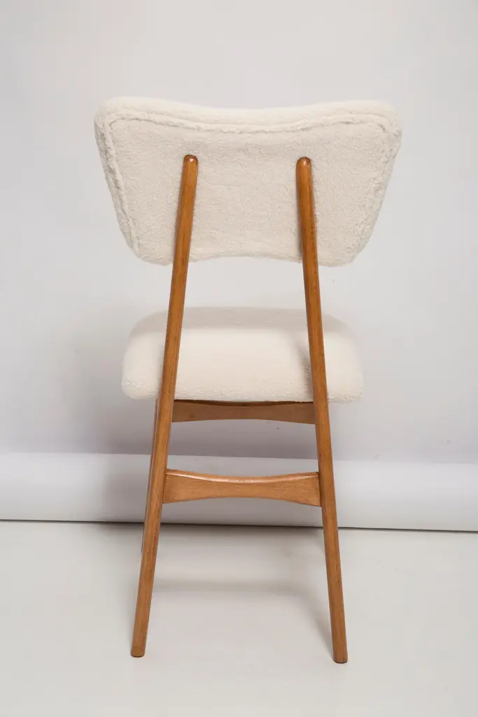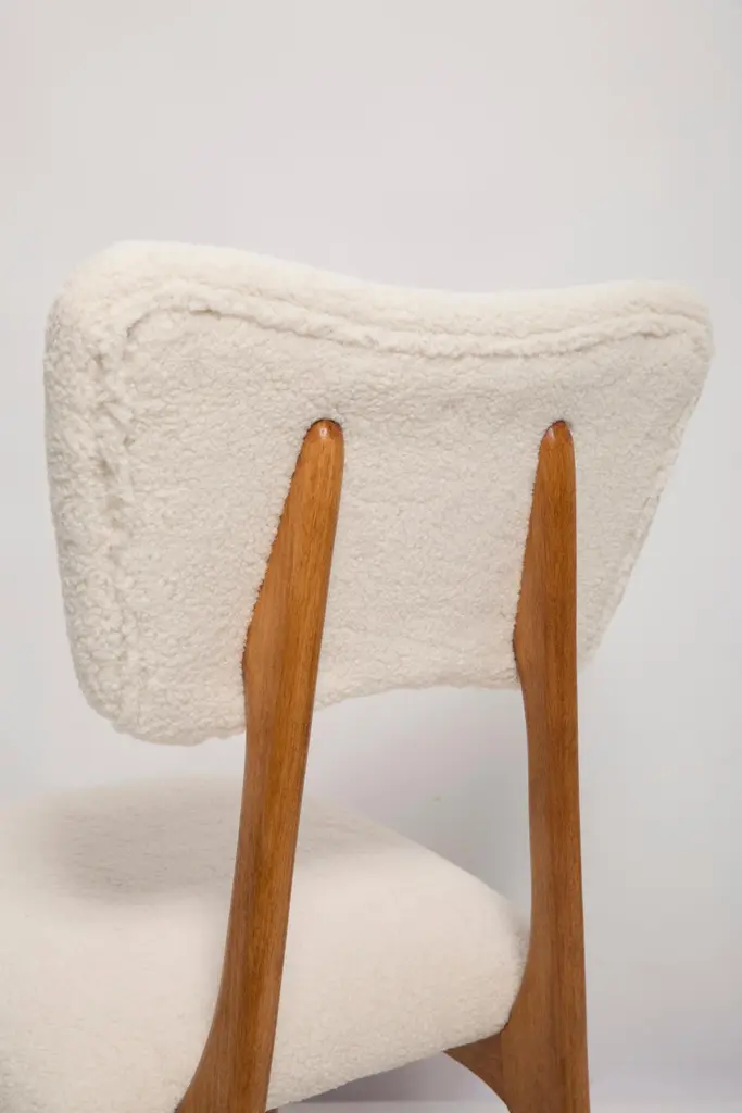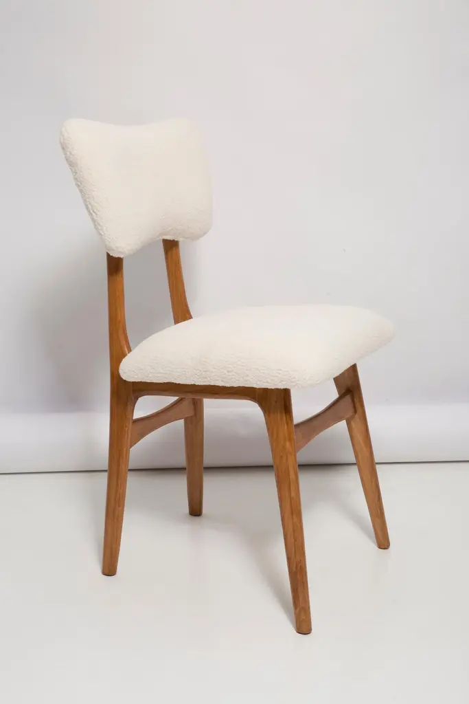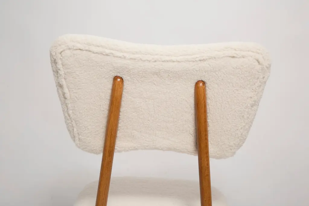 Chair designed by Prof. Rajmund Halas. Made of beechwood in medium oak color. Chair is after a complete upholstery renovation; the woodwork has been refreshed. Seat and back is dressed in crème, durable and pleasant to the touch bouclé fabric (color 01). Chair is stabile and very shapely. They were produced in former furniture factory in Goleniów in the 1960s. We can prepare this chair in every color of wood and fabric also in bigger sets. Please check the last picture with bouclé and wood color samples.