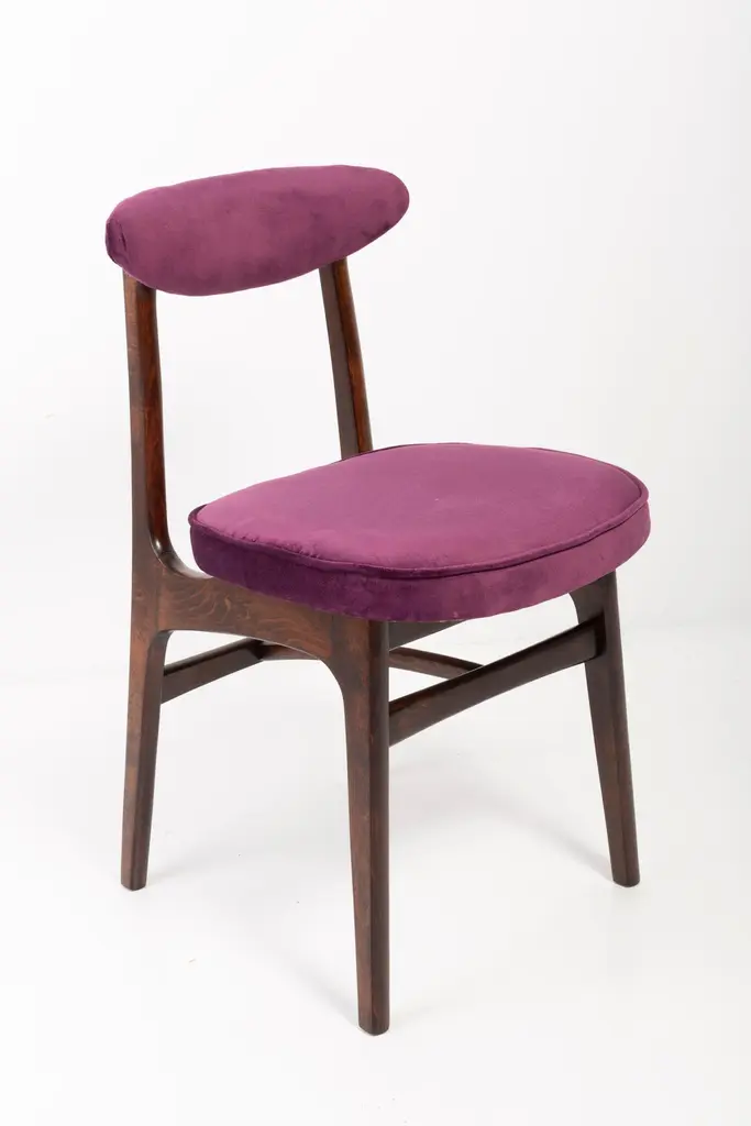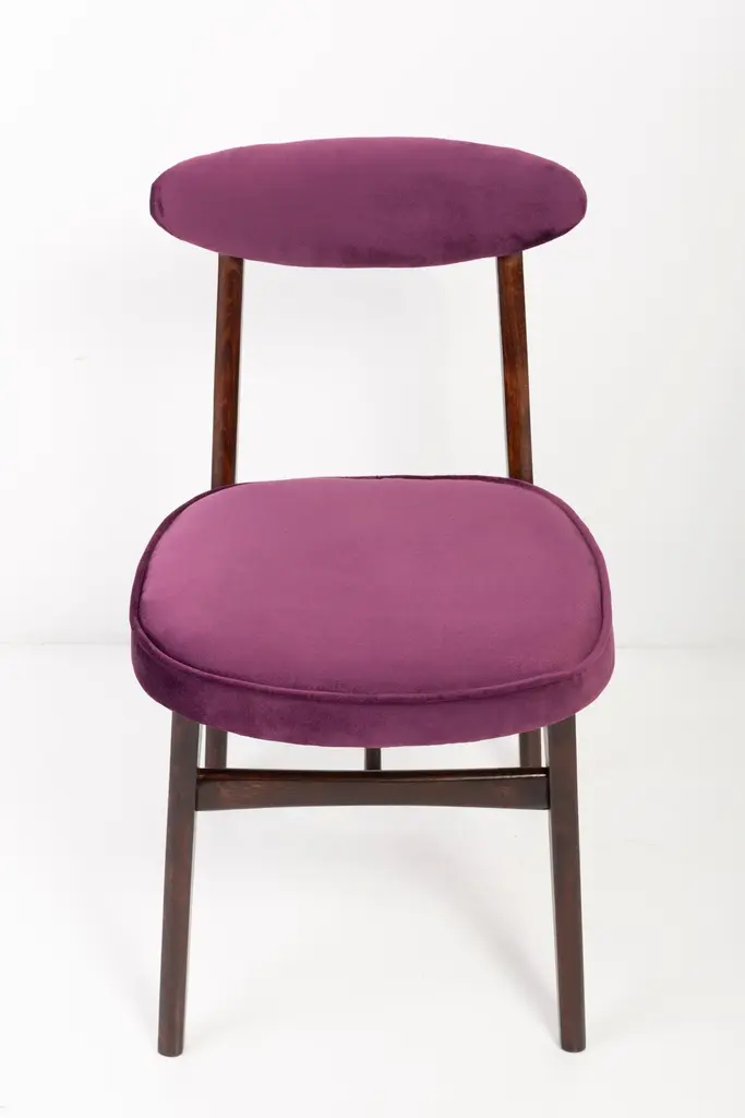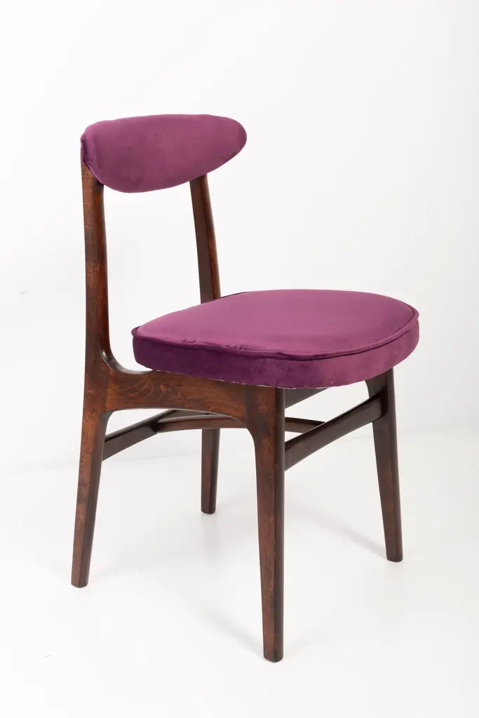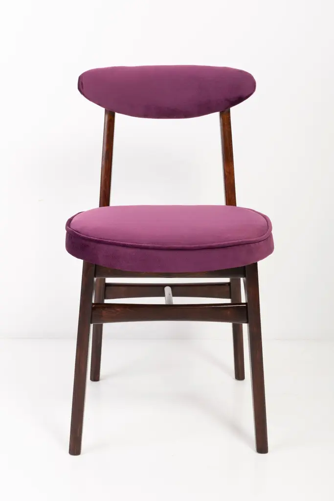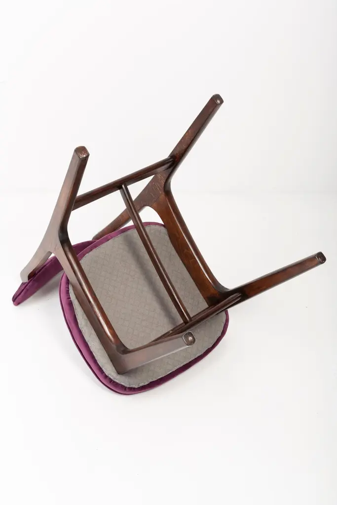 Chair designed by Prof. Rajmund Halas. It has been made of beechwood. Chair is after undergone a complete upholstery renovation, the woodwork has been refreshed. Seats and backs were dressed in a plum (color 969), durable and pleasant to the touch velvet fabric. The chair is stabile and very shapely. Chair was produced in former furniture factory in Goleniów in the 1960s. We can prepare also set of four, six or eight chairs in other fabric. Check the last picture with velvet colors.