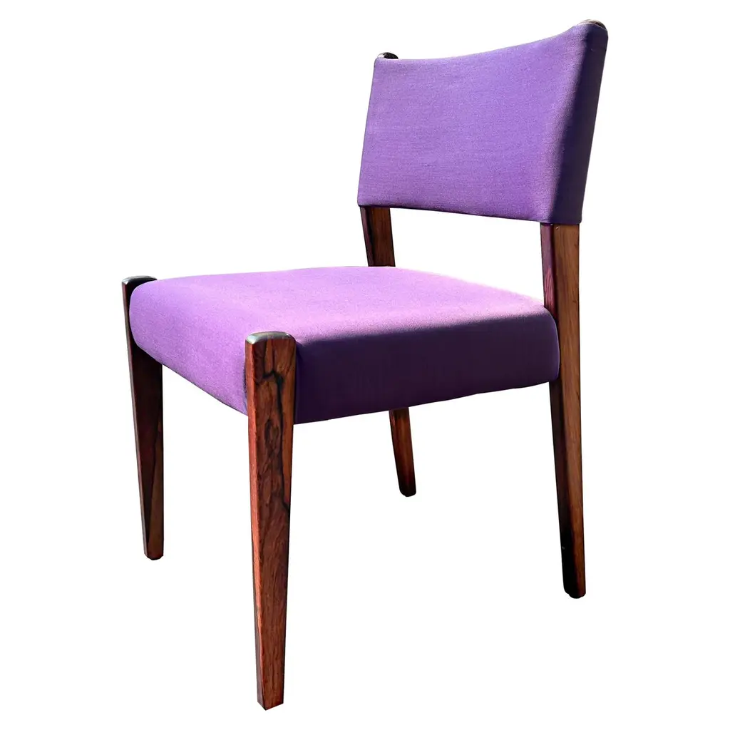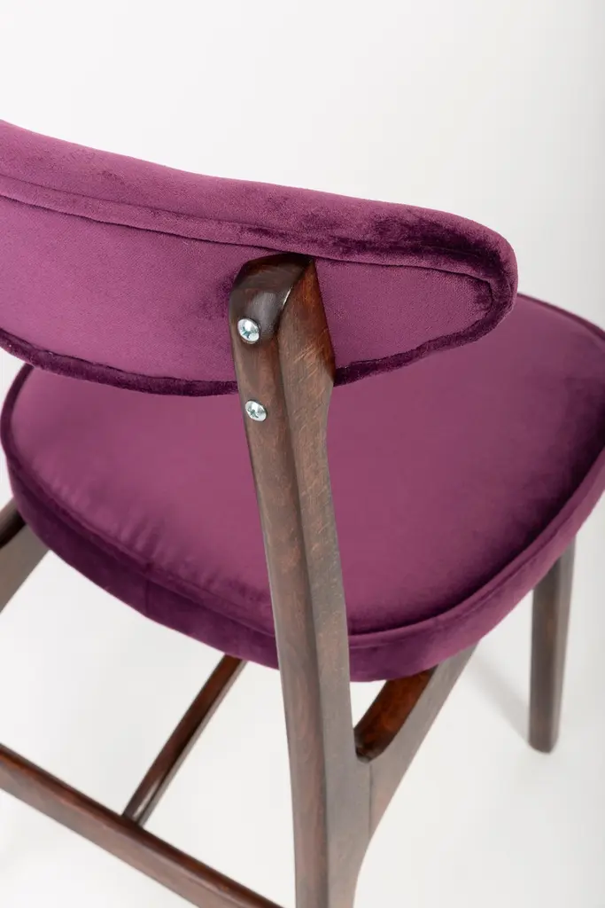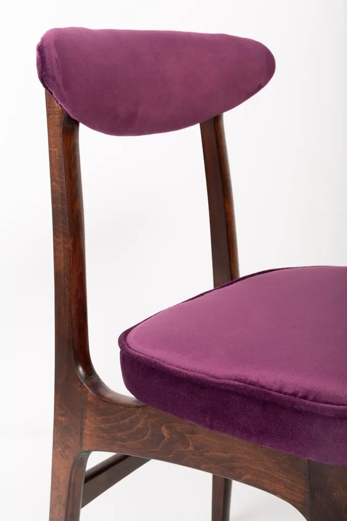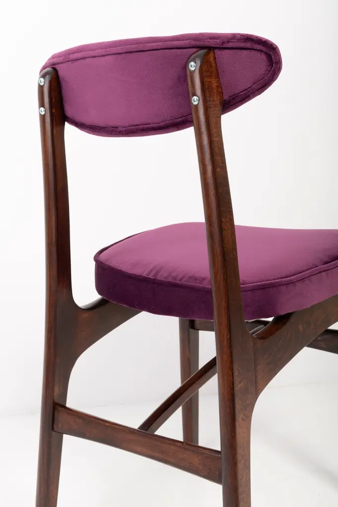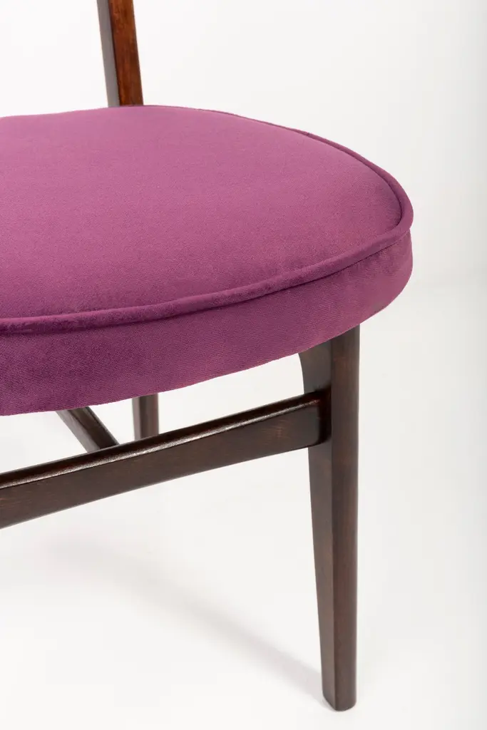 Chair designed by Prof. Rajmund Halas. It has been made of beechwood. Chair is after undergone a complete upholstery renovation, the woodwork has been refreshed. Seats and backs were dressed in a plum (color 969), durable and pleasant to the touch velvet fabric. The chair is stabile and very shapely. Chair was produced in former furniture factory in Goleniów in the 1960s. We can prepare also set of four, six or eight chairs in other fabric. Check the last picture with velvet colors.