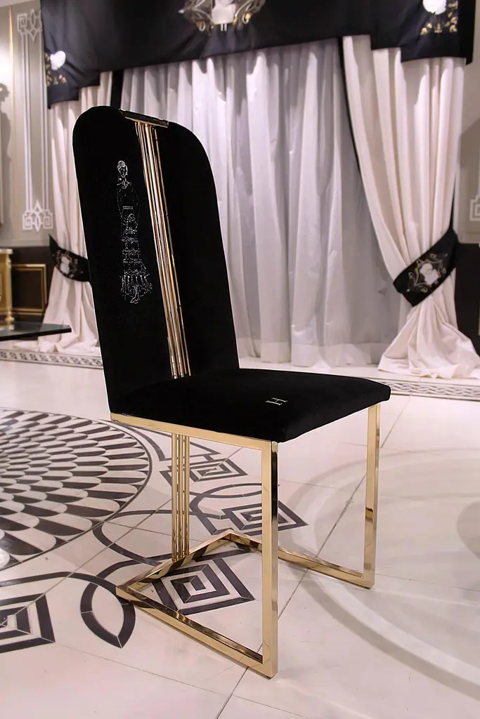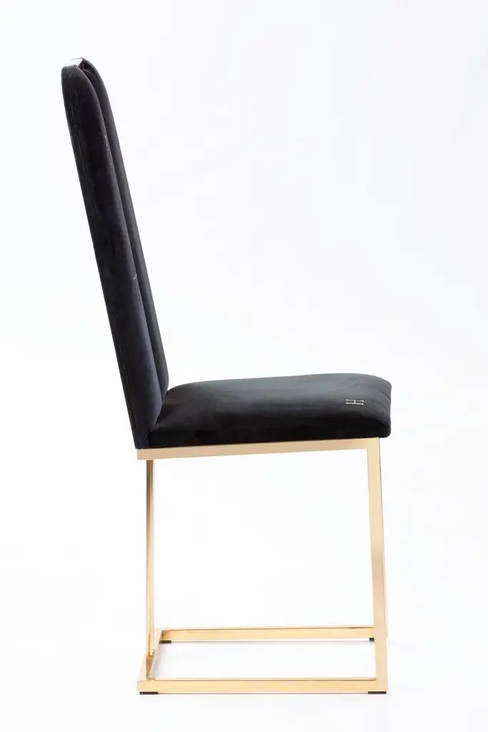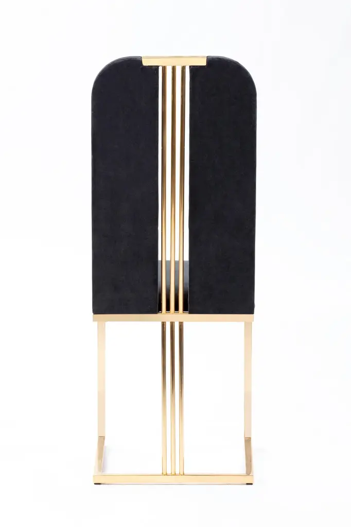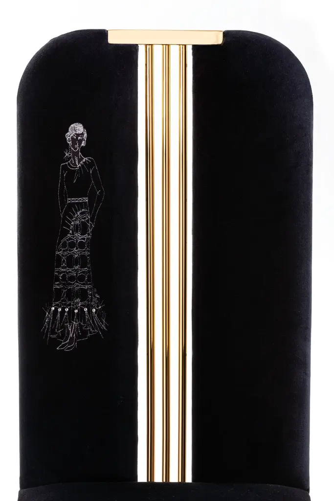 Inspired by the elegant designs of the 30s and 40s, this chair in gold galvanised brass, whose back three-rod structure continues till the top. The striking velvet covering the unified back and seat cushions is preciously adorned with a "daisy" embroidery and Swarovski crystals applications dedicated to Eileen Gray, with an H embroidered in a corner of the seat. The timeless Hollywood charm of this chair makes this piece functional and sophisticated.FeaturesGold galvanised brass chair with upholstered black velvet seat and backrest, silver embroidery with Swarovski crystal applications.DesignerHebanon Studio, product design studio behind the century-old company Hebanon Fratelli Basile - 1830.Our creations are born from the observation of People. We try to interpret their desires and emotions, evolution and dynamism. Our vocation is to give people a small moment of wonder. Because the moments that amaze us, make our days interesting and bring us back to a state of serenity.LanguageOur language stems from our cultural heritage coming from the Kingdom of the two Sicilies and from cabinetmaking of which we have internalized the discipline, technique and vision. - The carvings: they become elements that sculpt the air and dictate the rhythm of space; a game of seduction between opposites: hot and cold, masculine and feminine, natural and precious materials, pure and primary shapes alternating with organic forms of nature.- The inlays: they lose the only decorative value, acquiring in themselves the narrative value of the object; perspectives, optical illusions, sometimes provocative, sometimes sensual, sometimes ethereal and elusive, natural materials and textures that anthropomorphize nature.The Company identity42 are the wooden species kept in our vault of centuries-old veneers, 5 of which are endangered; 2 are the result of anomalies: woods tell as much about humanity as people do.In Hebanon Fratelli Basile 1830 we operate with respect for man and the environment,using only non-toxic products for human health, formaldehyde free, wood with forest certifications and recovering processing waste as a source of complementary energy.All products are 100% certified Designed and manufactured in Italy, branded and identified by an identification number and holographic mark that guarantee their uniqueness and originality in the world.Prices do not include shipping from Italy.
