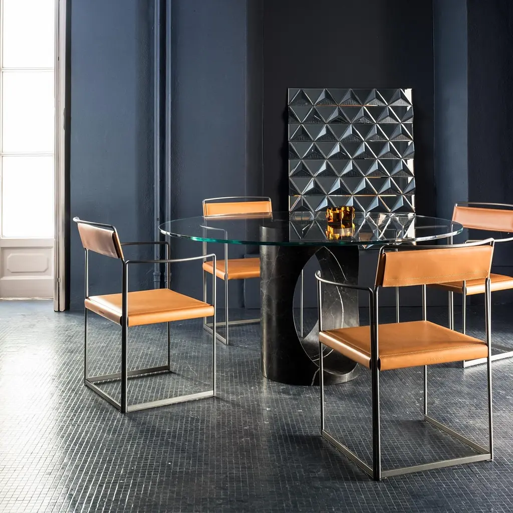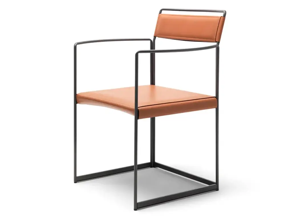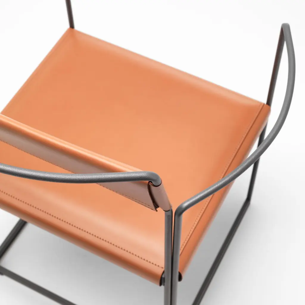 New Outline was developed by maximizing the integration of form and function while using minimum material. The steel rod frames define a contour that is slender and light, becoming armrests and backrest as a simple and fluid line. The fully removable seat pan and backrest are made of rich cow-hide. Hidden elastic belts allow them to flex with the weight of the body without stretching thus preventing them from losing their shape and structural property. Familiarity and innovation. Cow hide seat and backrest available in over 20 colors, internal elastic straps, cadet gray painted steel structure. Other colours available upon request.