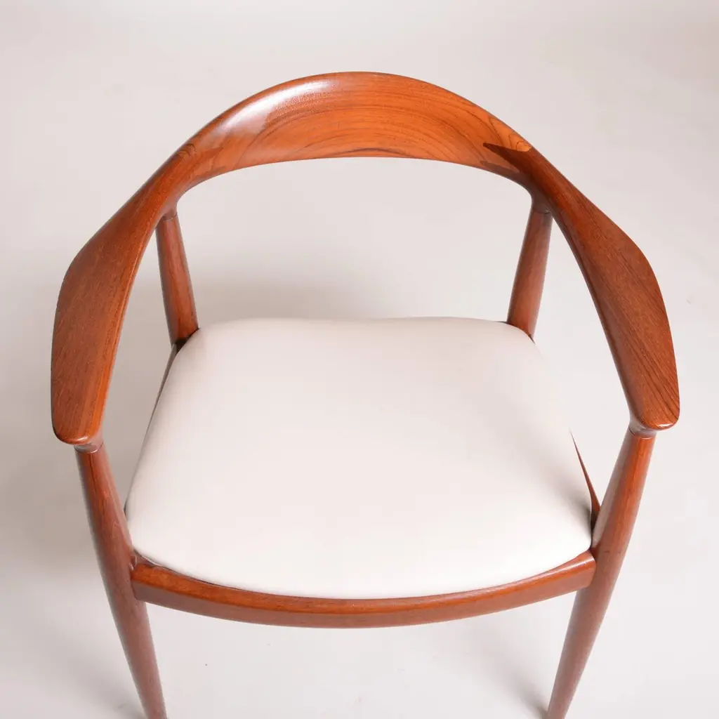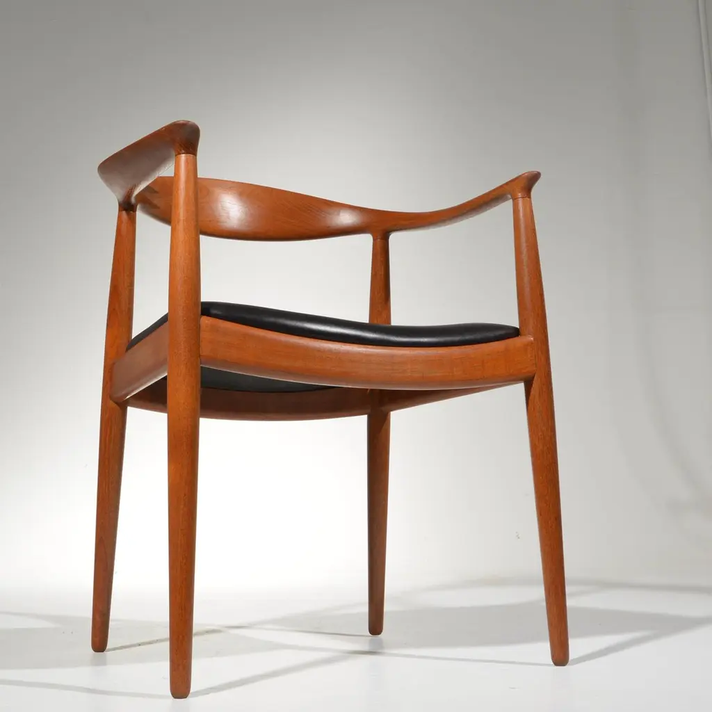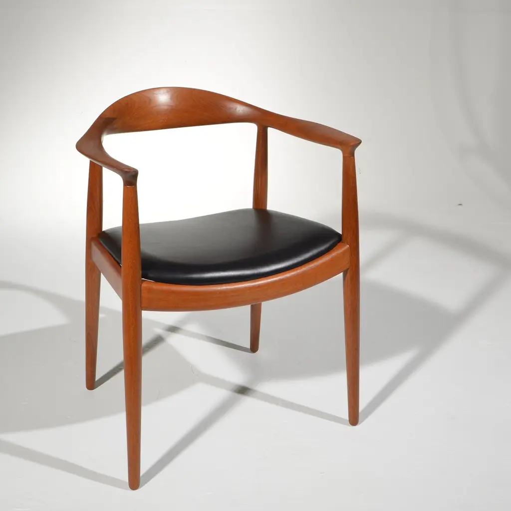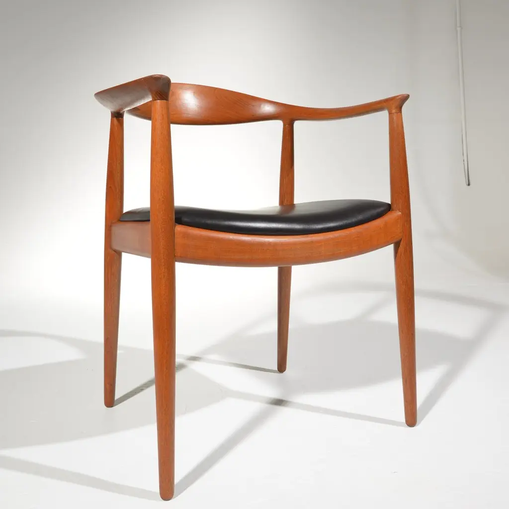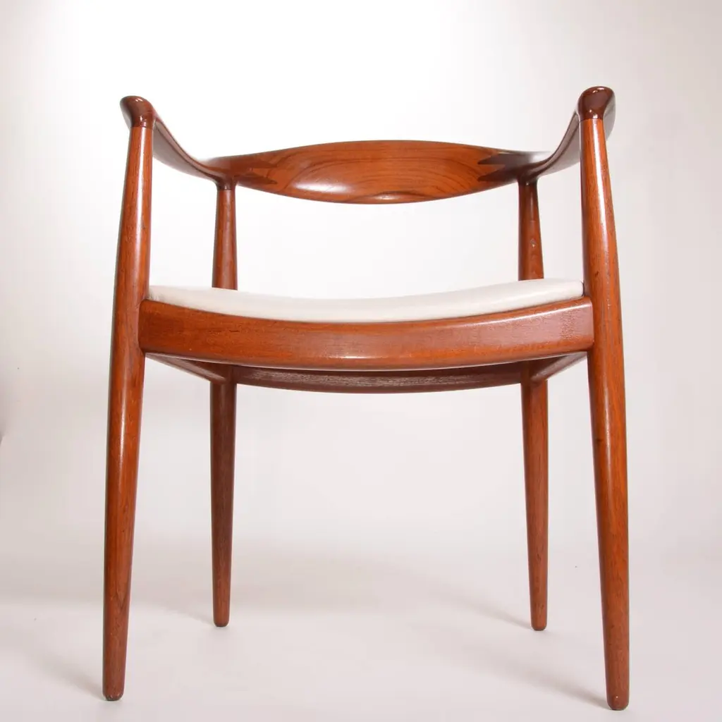 We are excited to offer 4 early Hans Wegner JH-503 chairs designed in 1949 and Produced by Johannes Hansen. Fully restored solid old growth teak construction. Stamped with the maker's mark. Currently we have 10 upholstered in black leather and one in white leather.