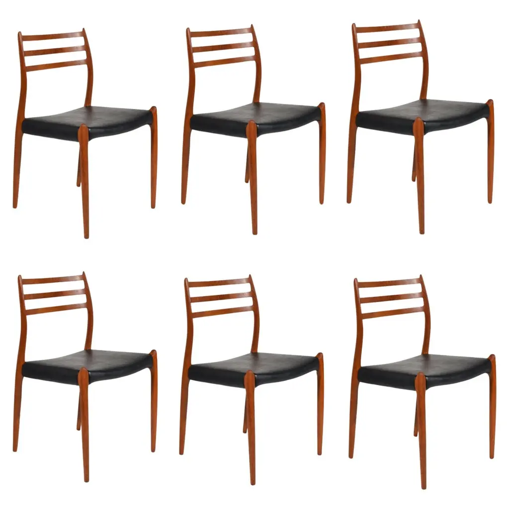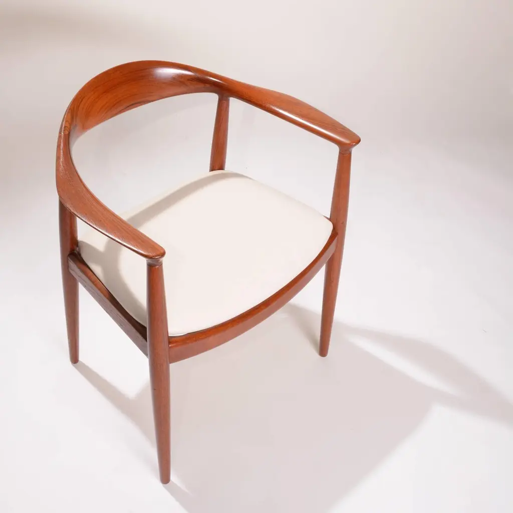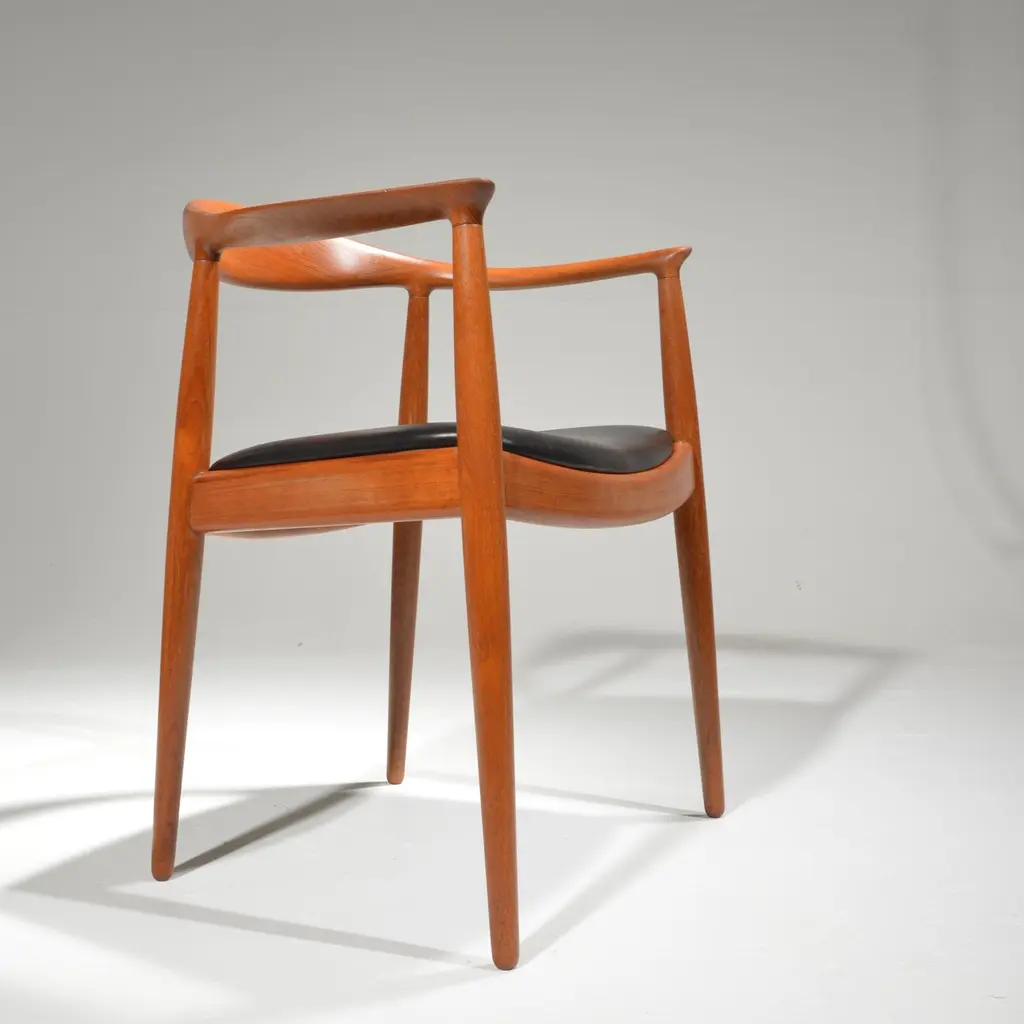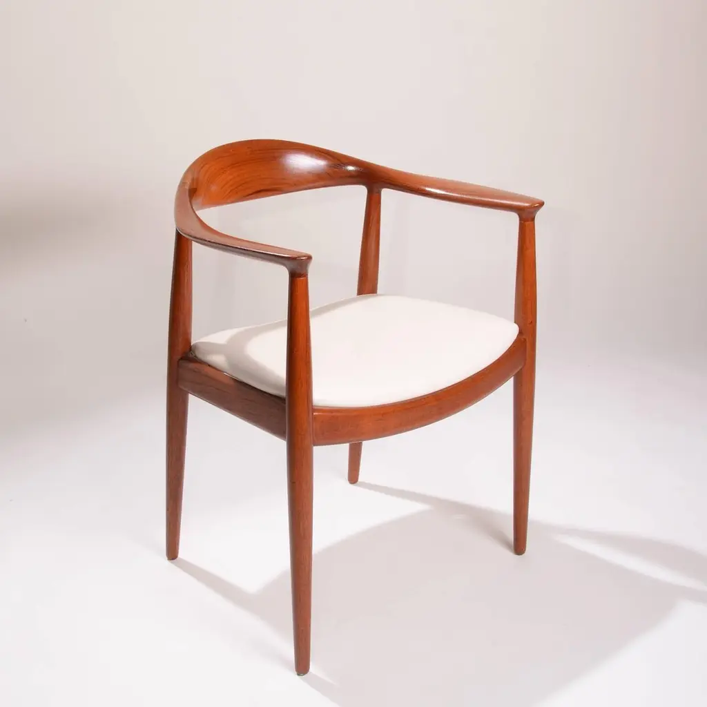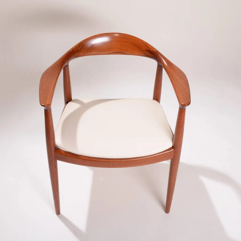 We are excited to offer 4 early Hans Wegner JH-503 chairs designed in 1949 and Produced by Johannes Hansen. Fully restored solid old growth teak construction. Stamped with the maker's mark. Currently we have 10 upholstered in black leather and one in white leather.