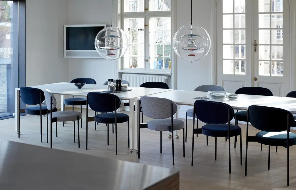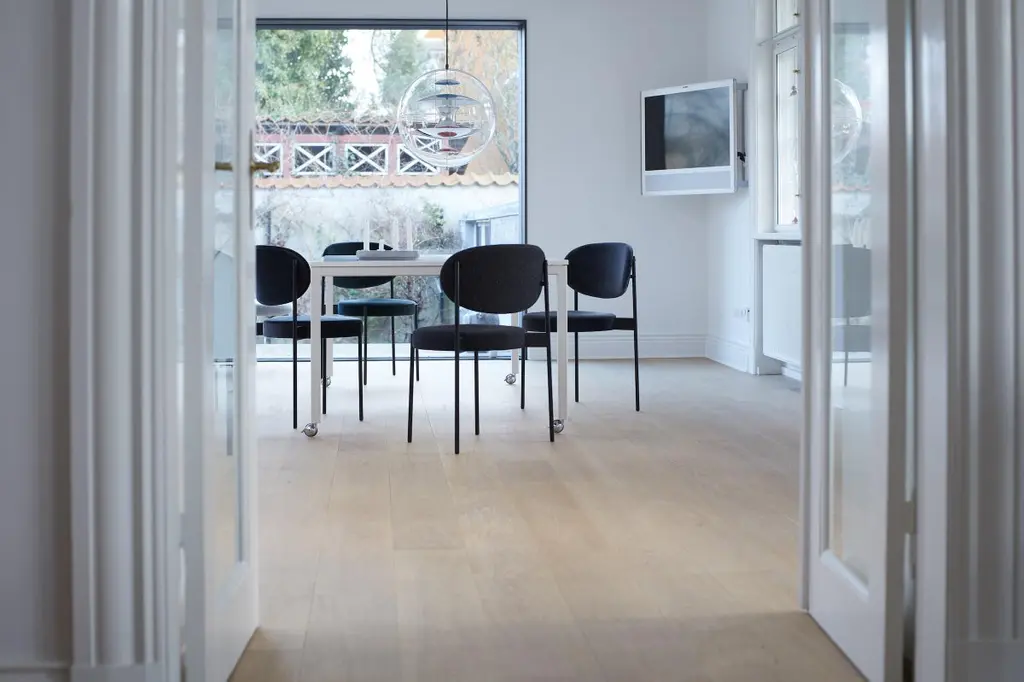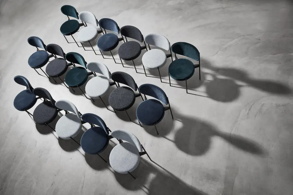 Fully upholstered stacking chair with black painted metal frame and felt feet.It is the Raf Simons designed fabric, Harald from Kvadrat, color code 182.CAL117 compliant foam can be made by request. Extra production time will be 5-6 weeks.