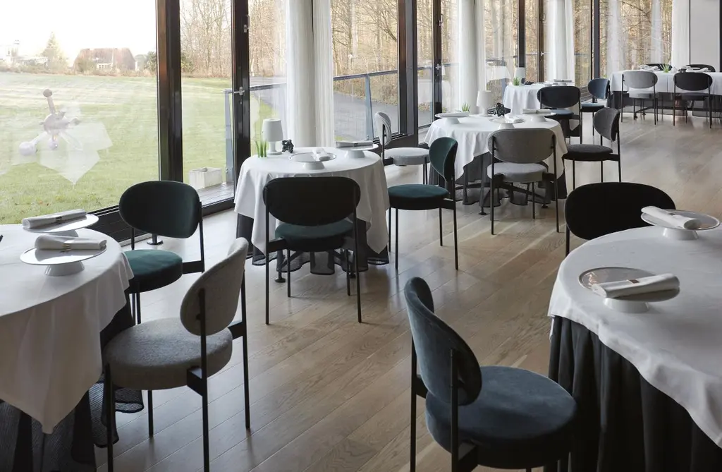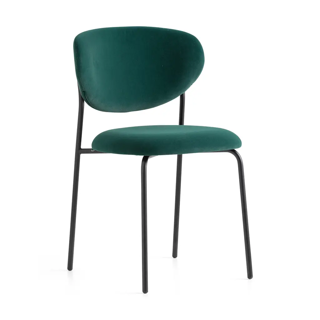 Fully upholstered stacking chair with black painted metal frame and felt feet.It is the Raf Simons designed fabric, Harald from Kvadrat, color code 982.CAL117 compliant foam can be made by request. Extra production time will be 5-6 weeks.