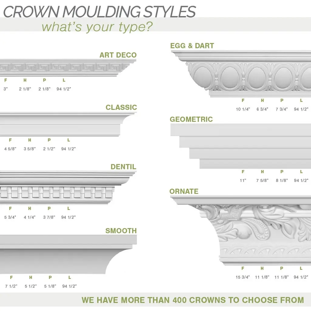 Beautiful crown moulding is a great way to separate and define each room. With each design modeled after traditional plaster type mouldings, our lightweight polyurethane mouldings give the same rich detail, yet at a fraction of the cost. Most moulding profiles can be partnered with our do-it-yourself corner blocks that means no miter cutting for you, and most rooms can be completed in hours instead of days. Another benefit of polyurethane is it will not rot or crack, and is impervious to insect manifestations. It comes to you factory primed and ready for your paint, faux finish, gel stain, marbleizing and more.•Modeled after original historical patterns and designs•Solid urethane for maximum durability and detail•Lightweight for quick and easy installation•Factory primed and ready for paint or faux finish•Can be cut, drilled, glued, or screwed•Can be used on the interior or exterior