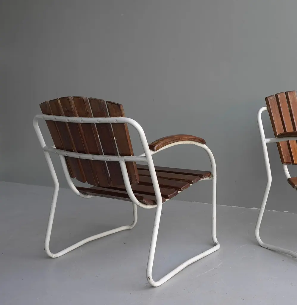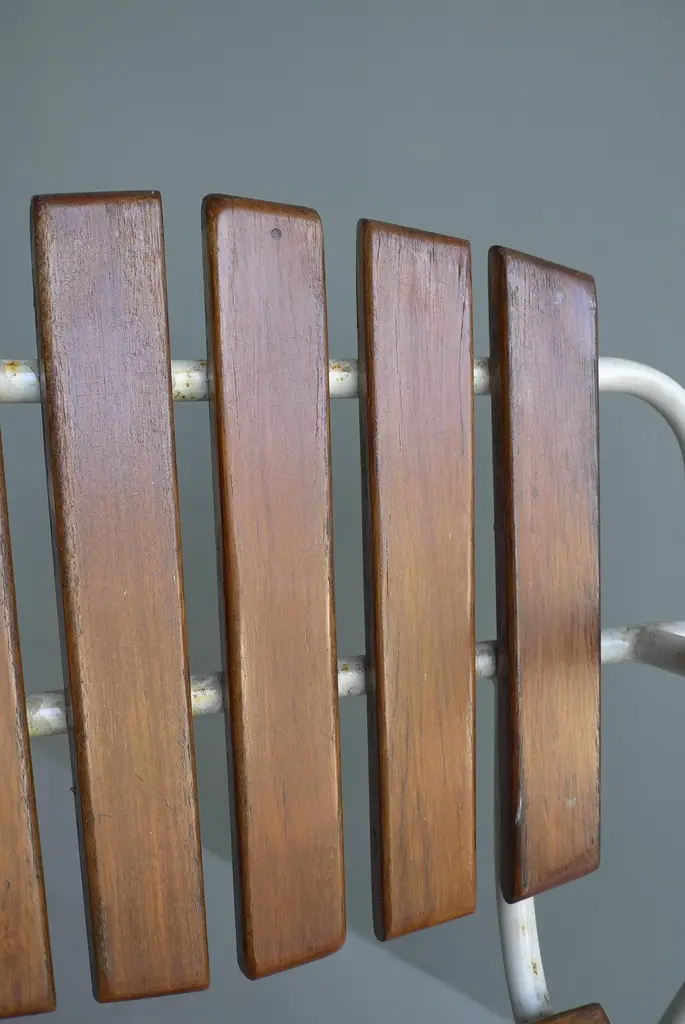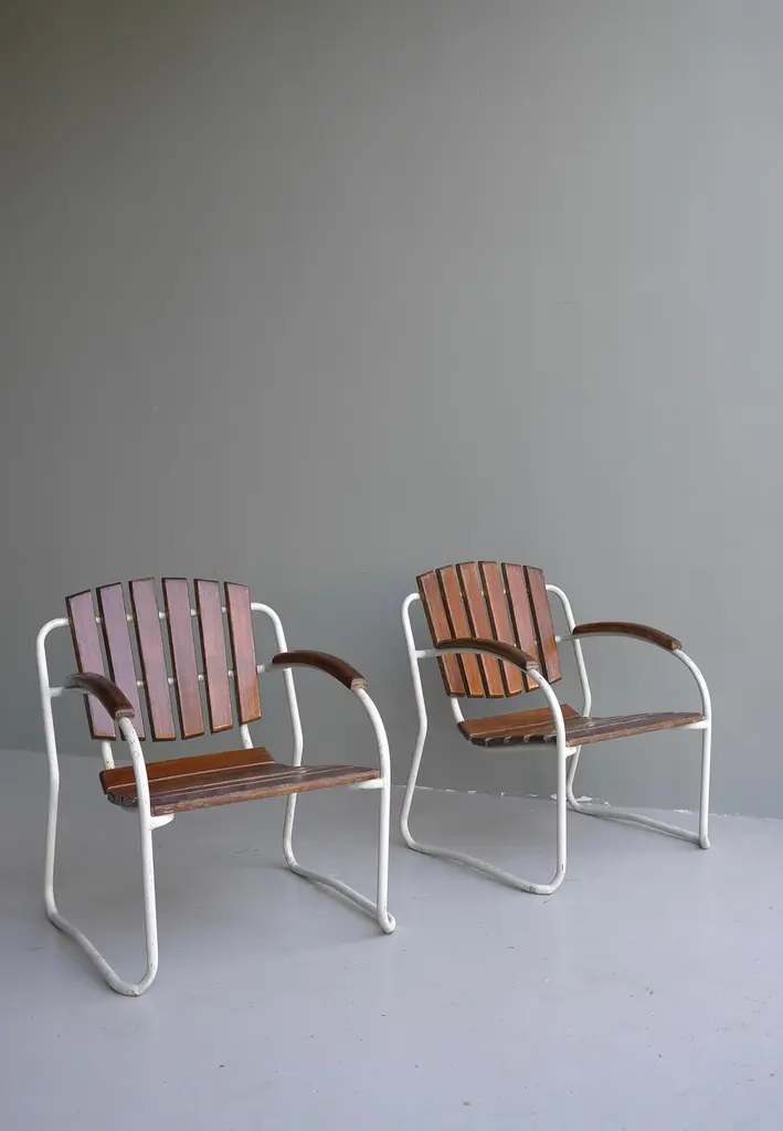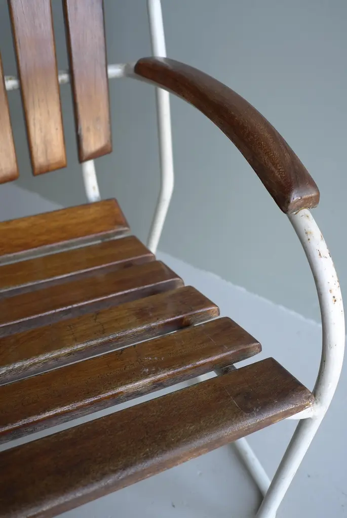 Tubular frame and slatwood stackable garden chairs, 1930'sWe have 4 pieces available.