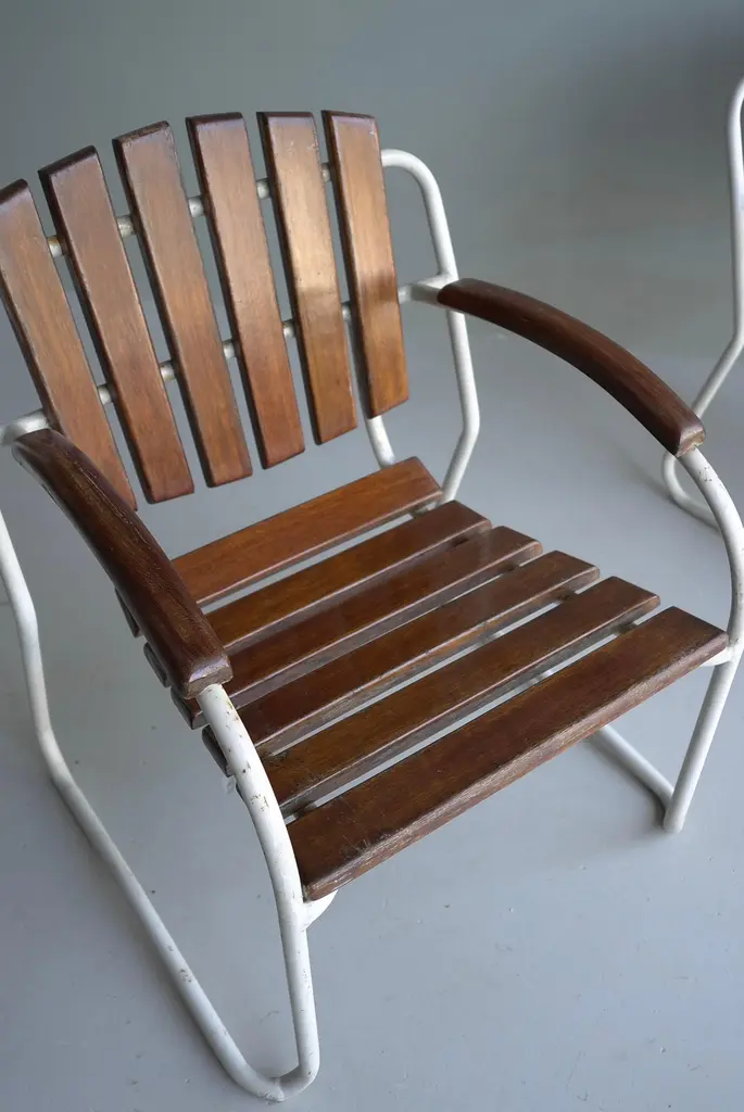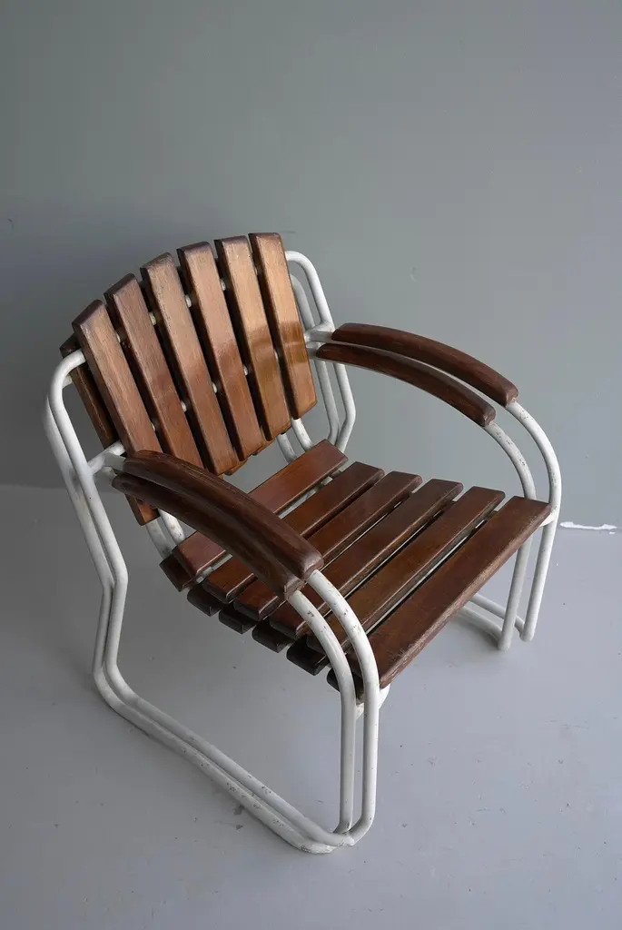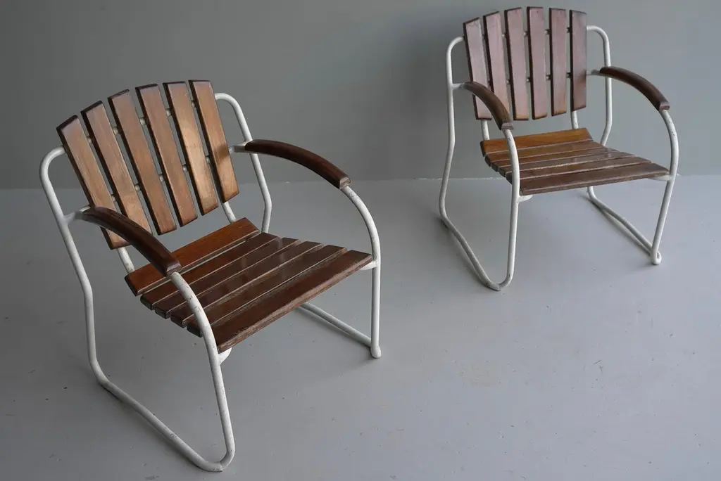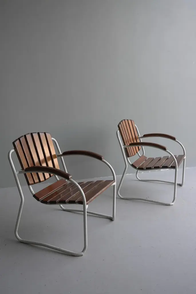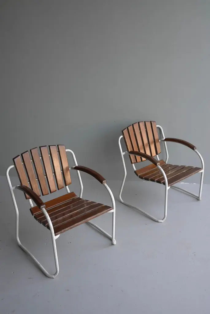 Tubular frame and slatwood stackable garden chairs, 1930'sWe have 4 pieces available.
