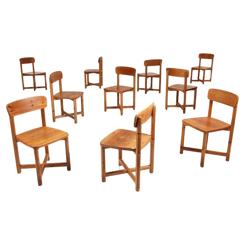 6 Brutalist Mountain Chairs, In Pine Circa 1950