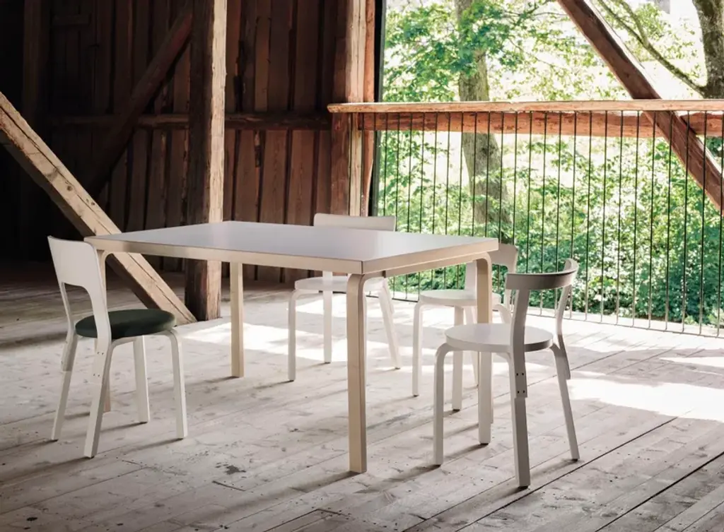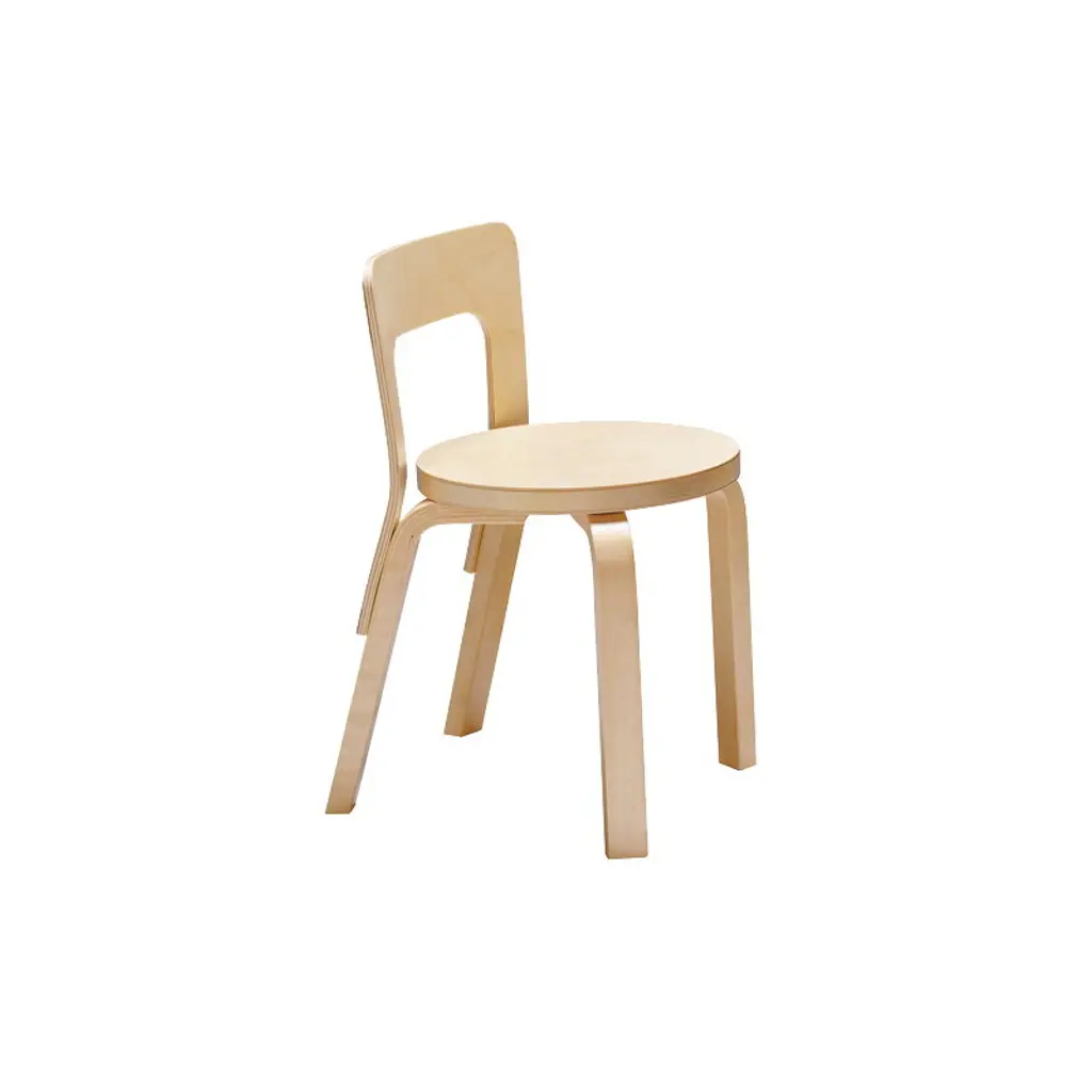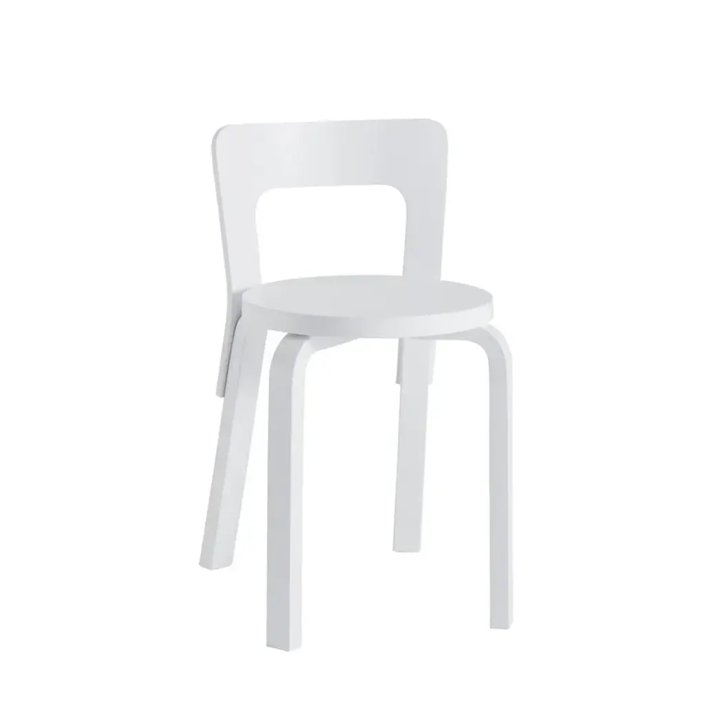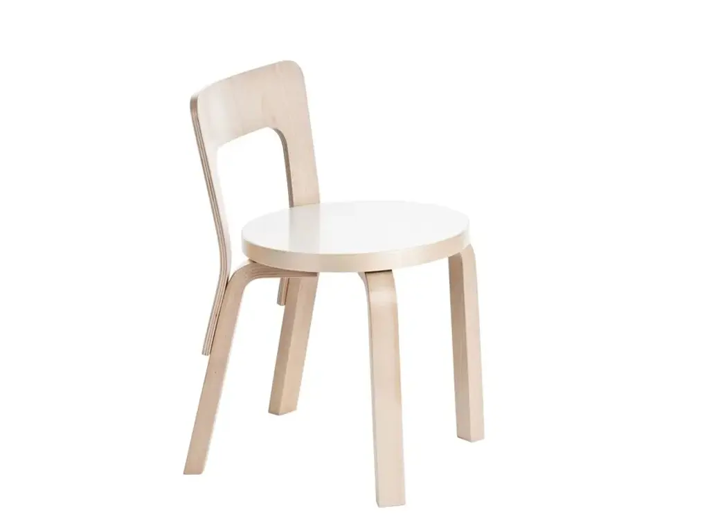 Clean lines and a simple structure define the design of Chair 65. A low, rectangular backrest is formed from a single piece of birch plywood and has a slight curve that forms naturally to the back, offering comfort and support. The height of the backrest allows for the chair to be pushed under a table or desk. The distinctive circular seat and L-shaped legs are part of Alvar Aalto’s standardised system of components. Available in a variety of colours and finishes, Chair 65 also has a smaller sibling, Children’s Chair NE65, which is suitable for children.Legs and seat edge-band: Solid birchSeat: birch (clear, black or white lacquer), HPL IKI white, black linoleum.