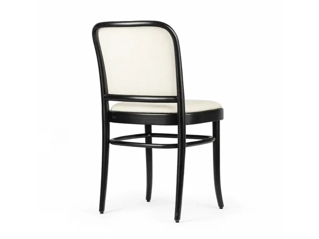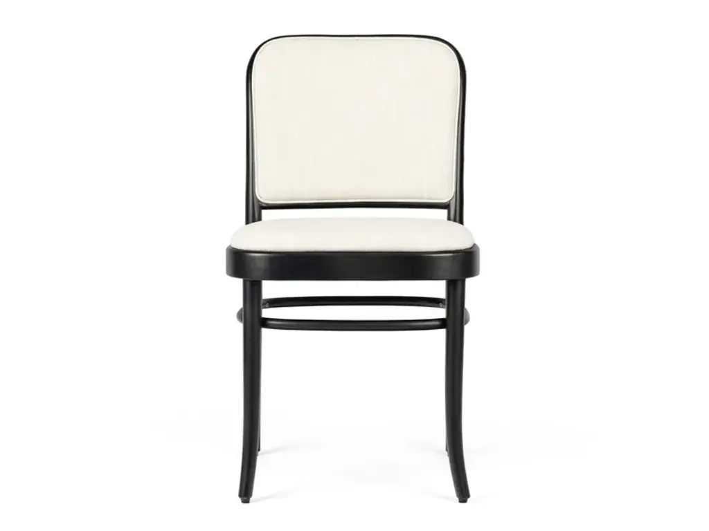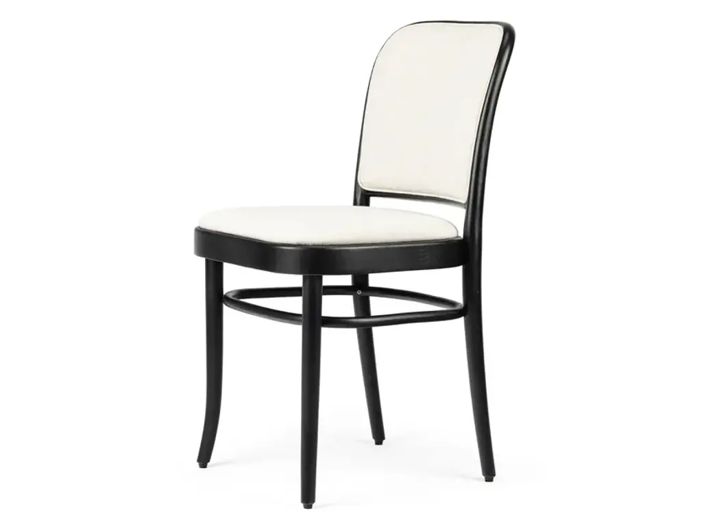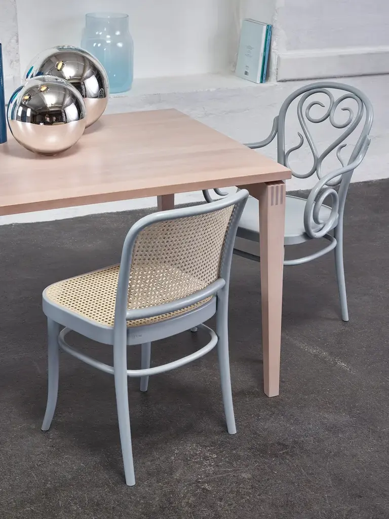811 is a wooden chair by Ton A.S.The armchair, inspired by a model from 1930 by Josef Hoffmann, blends his interest in Art Nouveau and simple shapes with manufacturing processes applied in Bystrice pod Hostynem since 1861. The armchair is therefore more geometrical, but bears the clear features of the manual bending technique of TON. This armchair variant combines an upholstered seat with a woven cane backrest.