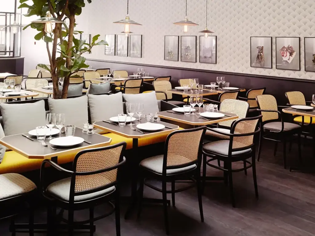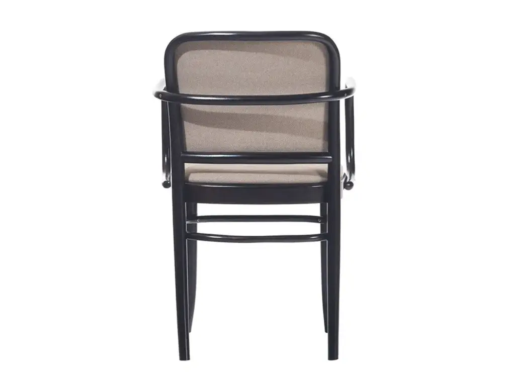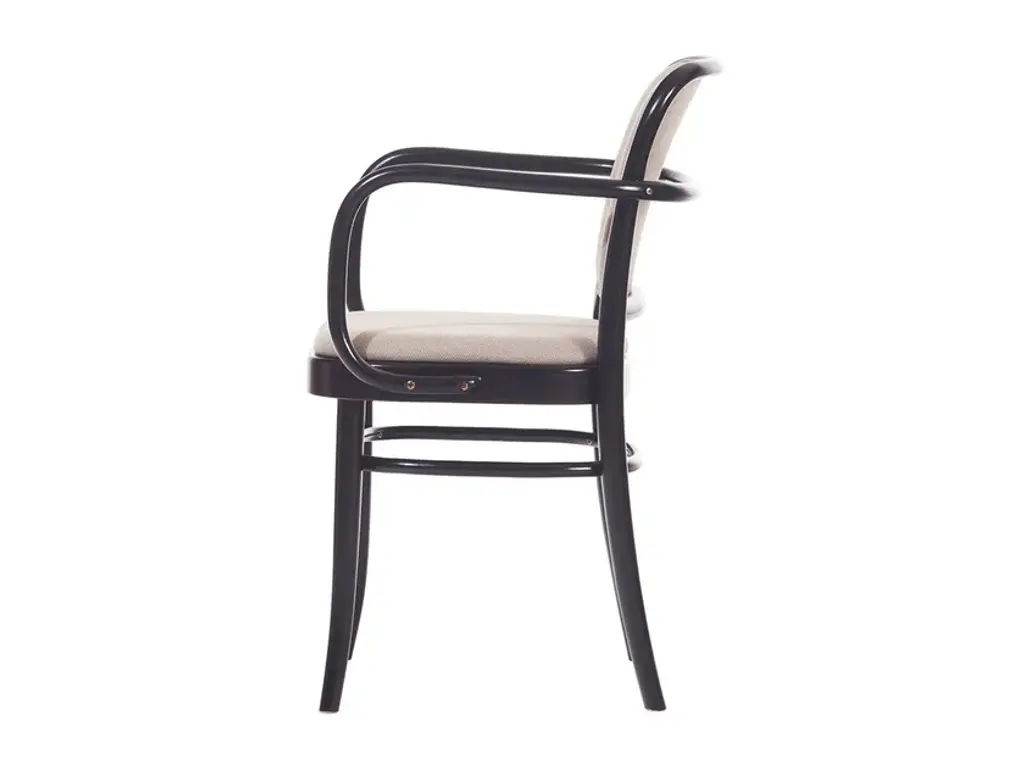 811 is a wooden chair by Ton A.S.The armchair, inspired by a model from 1930 by Josef Hoffmann, blends his interest in Art Nouveau and simple shapes with manufacturing processes applied in Bystrice pod Hostynem since 1861. The armchair is therefore more geometrical, but bears the clear features of the manual bending technique of TON. This armchair variant combines an upholstered seat with a woven cane backrest.