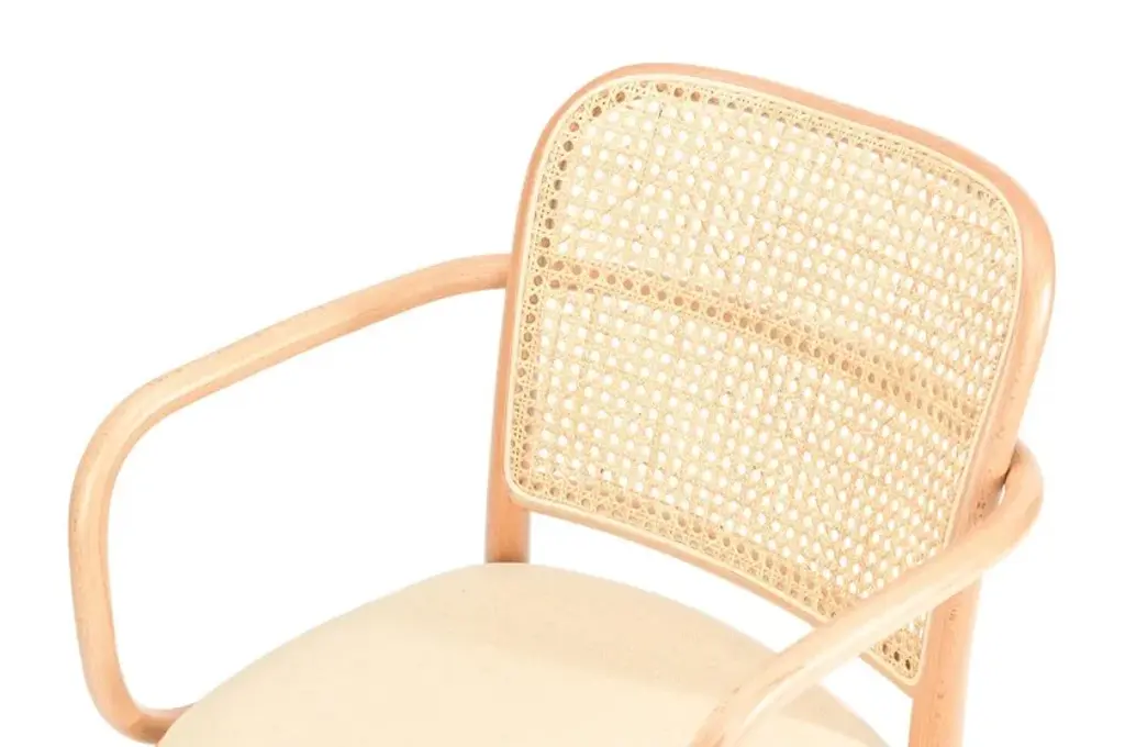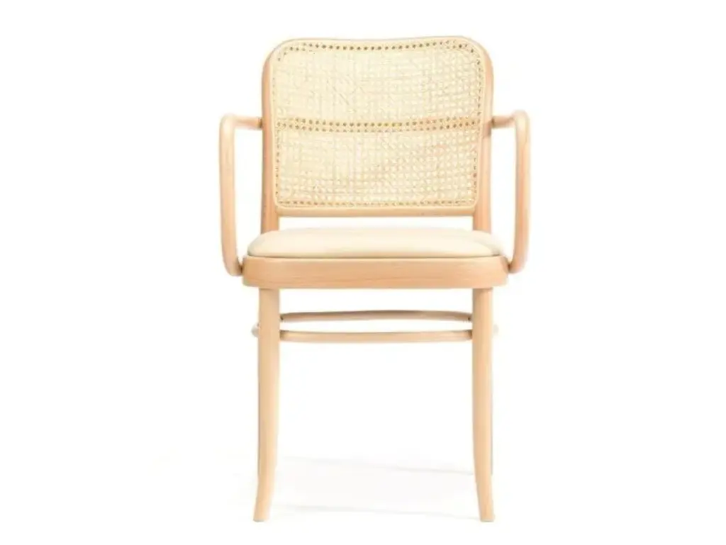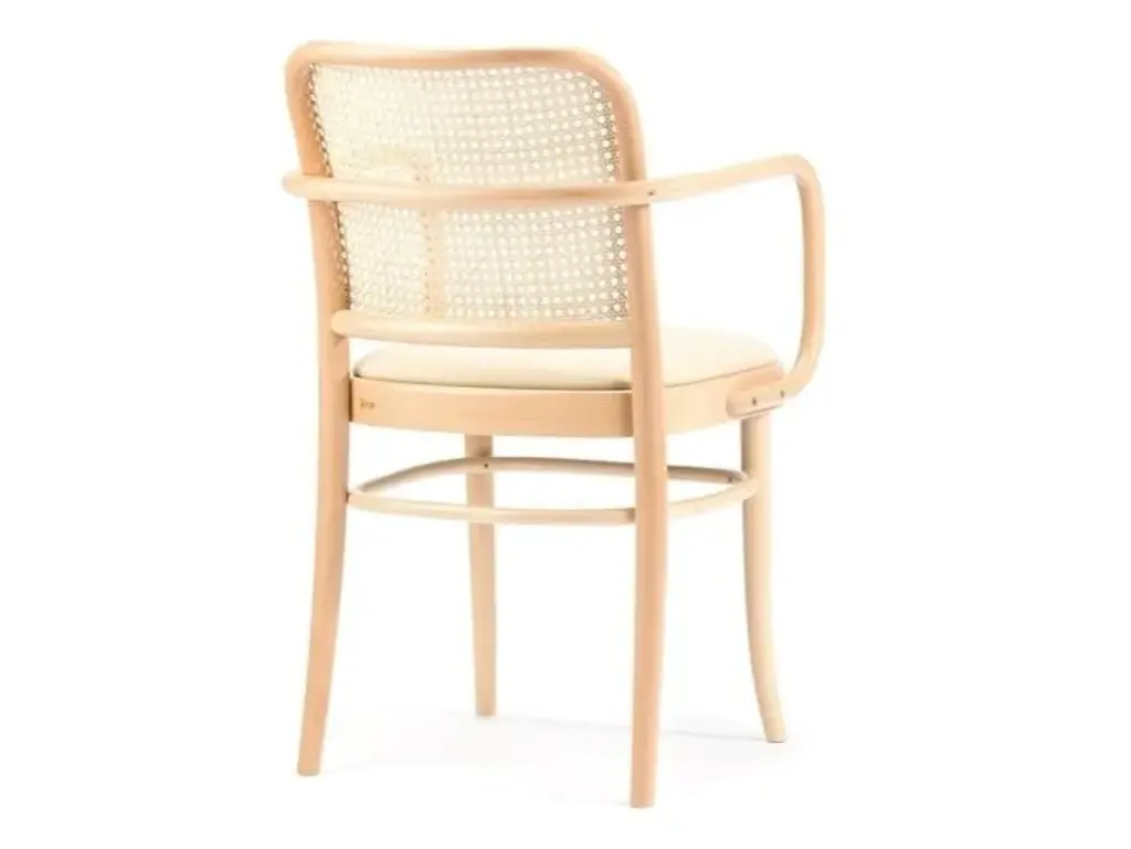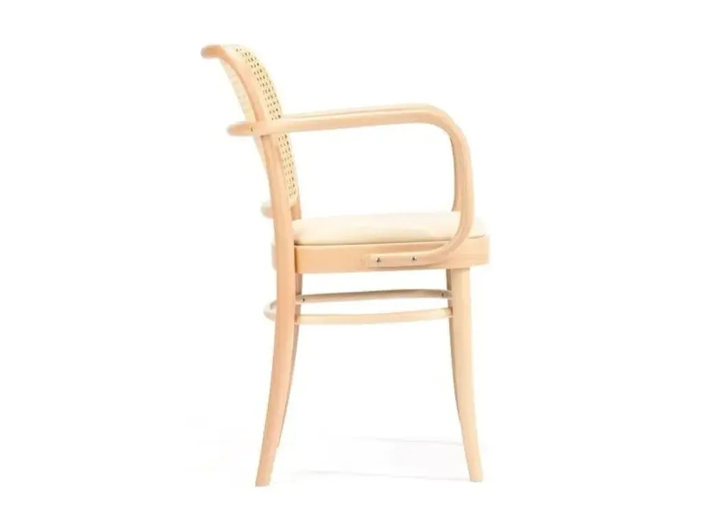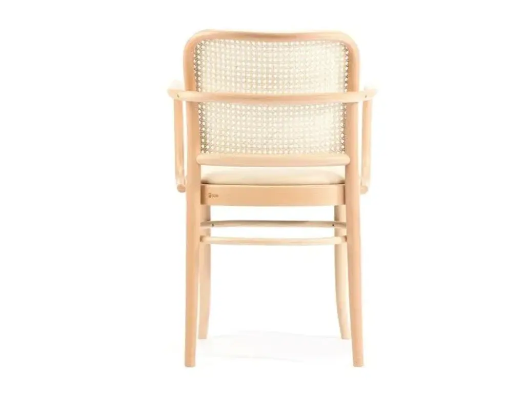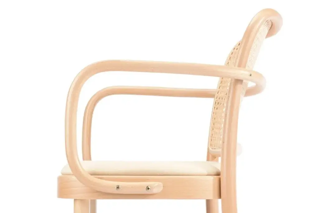 811 is a wooden chair by Ton A.S.The armchair, inspired by a model from 1930 by Josef Hoffmann, blends his interest in Art Nouveau and simple shapes with manufacturing processes applied in Bystrice pod Hostynem since 1861. The armchair is therefore more geometrical, but bears the clear features of the manual bending technique of TON. This armchair variant combines an upholstered seat with a woven cane backrest.