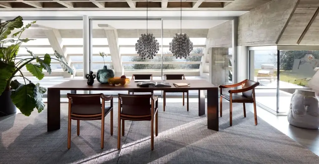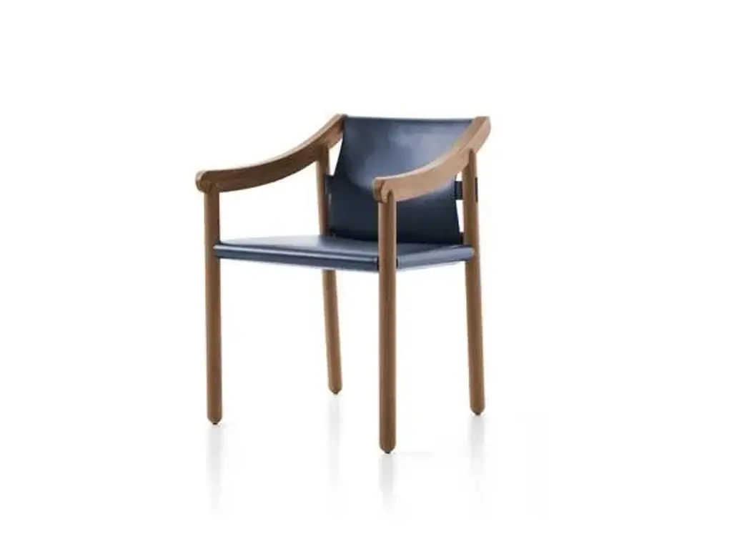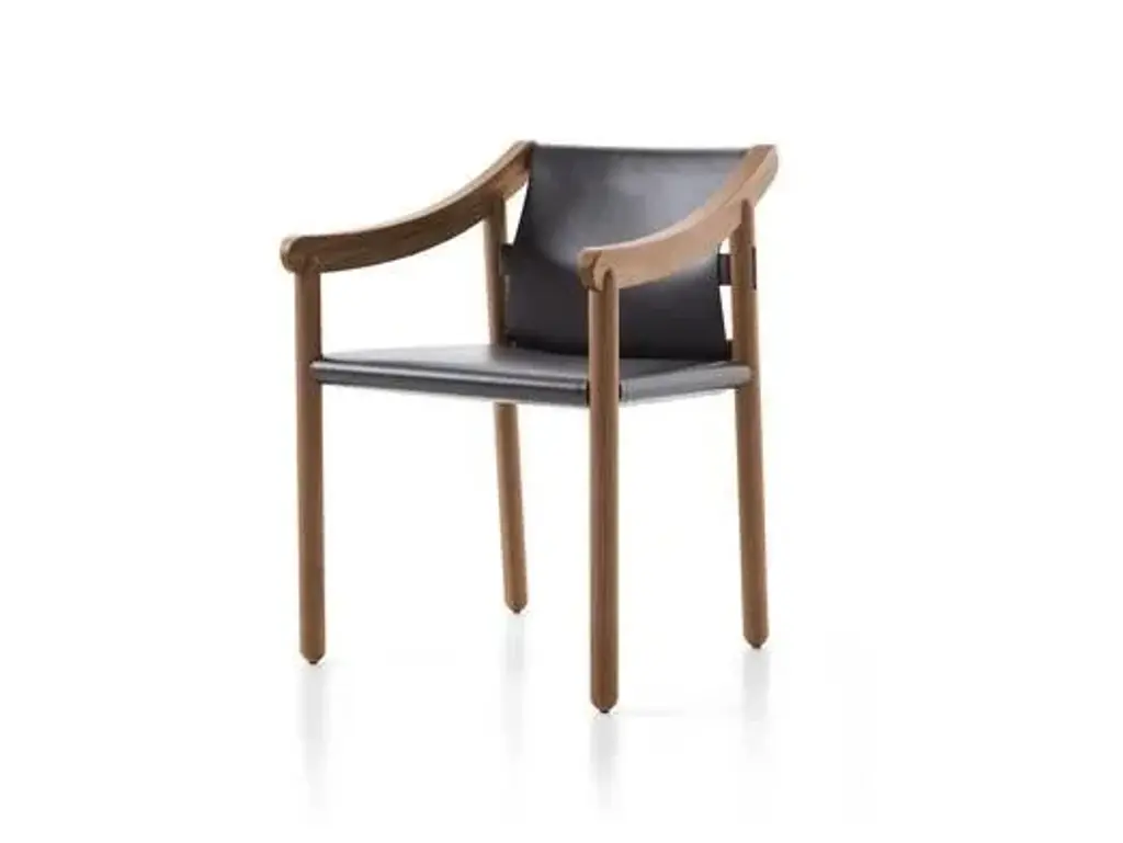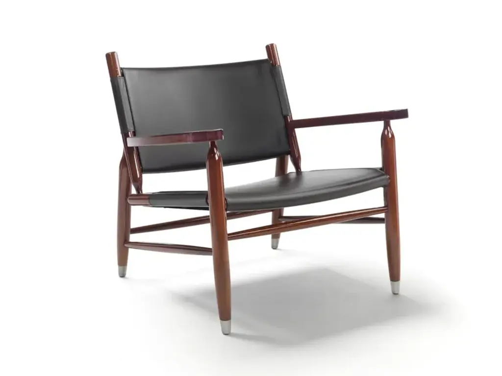Produced by Cassina until 2000, this chair has now been relaunched, the finishes and details having been updated from the original archive model. The sophisticated elegance of the frame, which features cylindrical legs and curved arm-rests, has been rejuvenated thanks to Cassina’s extensive experience in handling leather, not to mention the company’s high quality carpentry skills. The complex nature of this piece is expressed in a design that looks simple but fully reflects the genius quality of the original concept, a veritable masterpiece of the crafts tradition proper to Meda, in the Brianza area north of Milan, the trademark registered by Cassina and a guarantee of utmost quality. The frame, in finest quality wood, bespeaks the perfect combination of the artisanal tradition and premier CNC technology, while the overall design stands out for the self-supporting seat crafted from one single piece of saddle leather, curved and slotted into the frame. The decorative stitching has been discontinued, while the rear of the chair still features the leather belt that lends support to the back and enhances its comfort quotient.The 905 chair features a solid wood structure with cylindrical legs and curved armrests, joined to a self-supporting cowhide seat, the quintessential expression of the time-tested experience of the Cassina joinery and saddlery.UPHOLSTERY Self-supporting saddle-hide.STRUCTURE Wood with cylindrical legs and curved armrests.BACK Finished with saddle-hide belt.