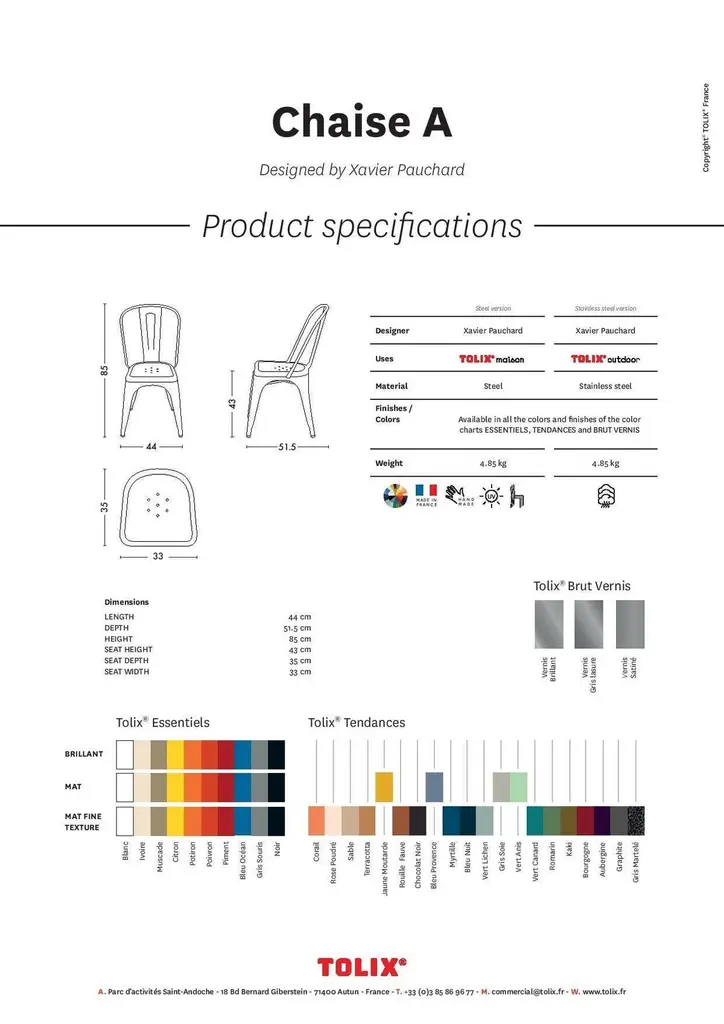 Created in 1927 by Xavier Pauchard, the A-chair met with worldwide success from the beginning. It has been imitated but never equaled! Before becoming part of the collections at the Vitra Museum, the MOMA, the Pompidou Centre and the highly renowned architect Le Corbusier’s Villa Savoye, the A-chair was part of ""Le Normandie"" ocean liner’s furniture in 1935, lined café patios and equipped hospitals, the American army and cities before settling in private homes. Still manufactured by hand in Burgundy in our workshop, just as with all of our furniture, the A-chair remains an icon in today’s design world. You can also use a Tolix cushion on A-chairs. Finish in matte fine texture.