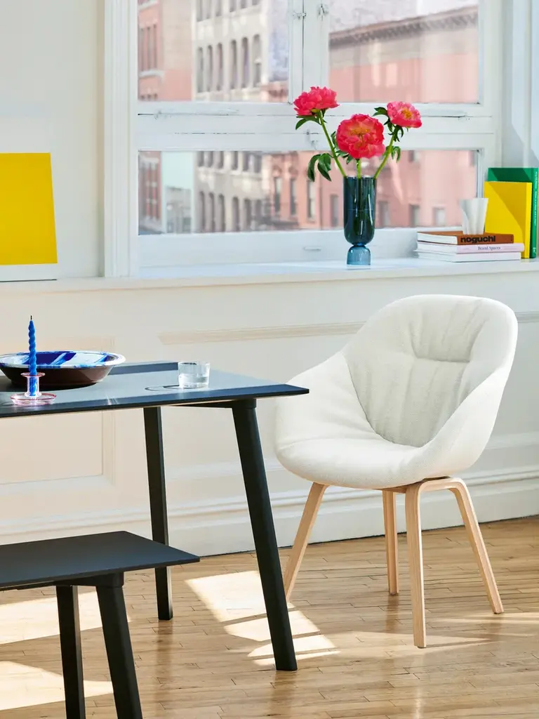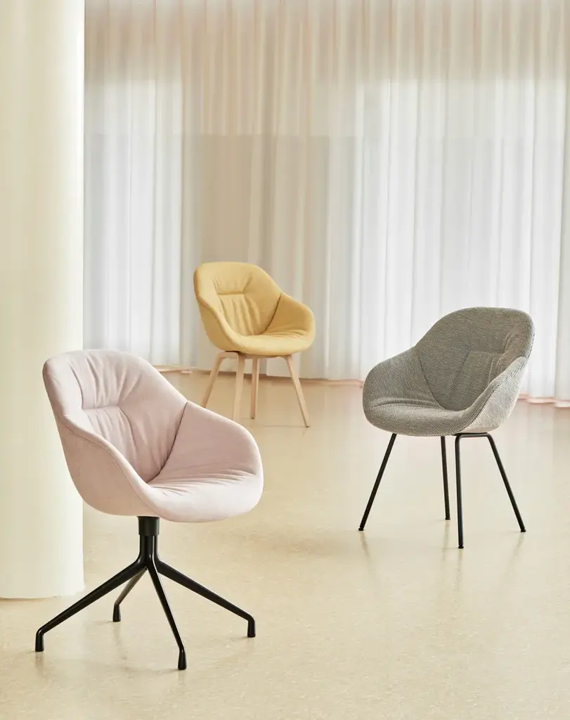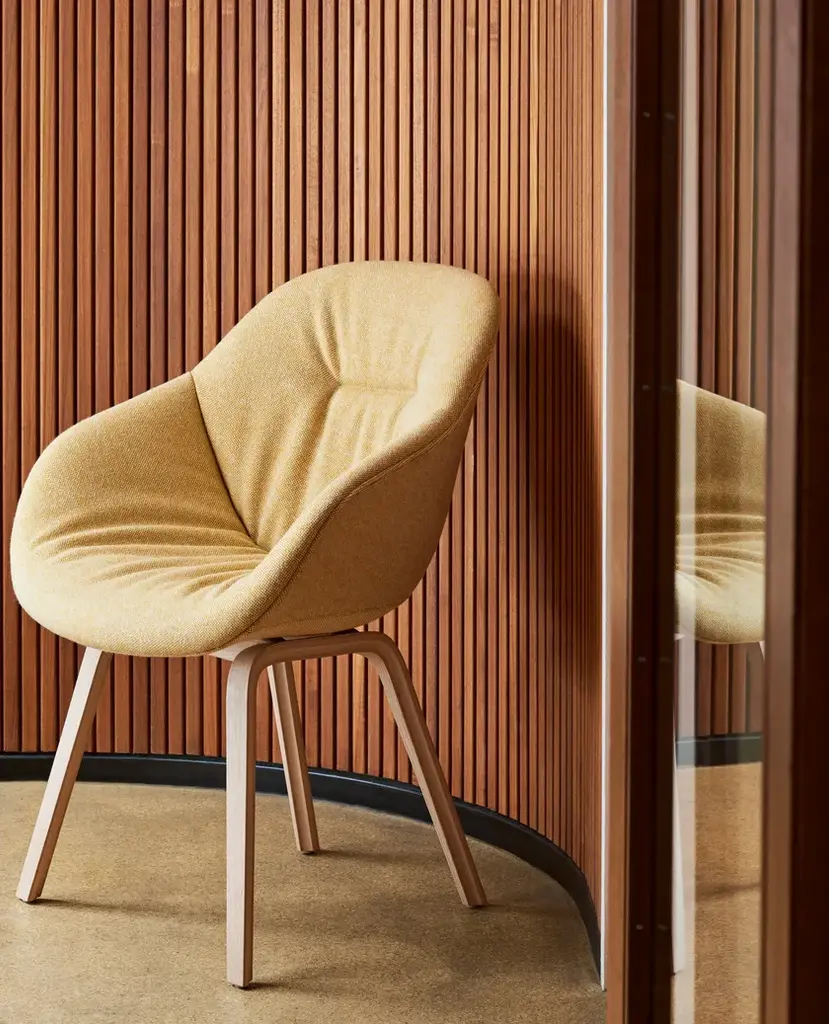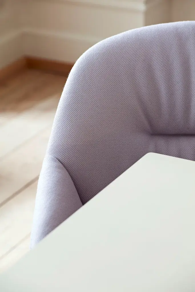 The AAC123 Soft fuses the natural elegance and character of the four-legged wooden base with the softness and warmth of the quilted shell. Retaining the same high backrest and generous seat that characterises the series, this design features a solid base with angled legs that slant slightly outwards for optimal stability. The oak base is available in different finishes and the quilted shell is offered in a variety of upholstery options, providing a multitude of design combinations that give this series versatility in a wide range of corporate, public and private contexts. 10 mm injection moulded polypropylene with 10% glass fibre. Full upholstered. 15 mm cut foam, 15 mm super soft cut foam and 40 mm wadding. Moulded plywood. Available in a large selection of standard fabrics and leathers. Available in 4 different base finishes: - Black stained oak veneer (RAL 9005)- Clear lacquered oak veneer - Soaped oak veneer- Matt lacquered oak veneer (only on demand)