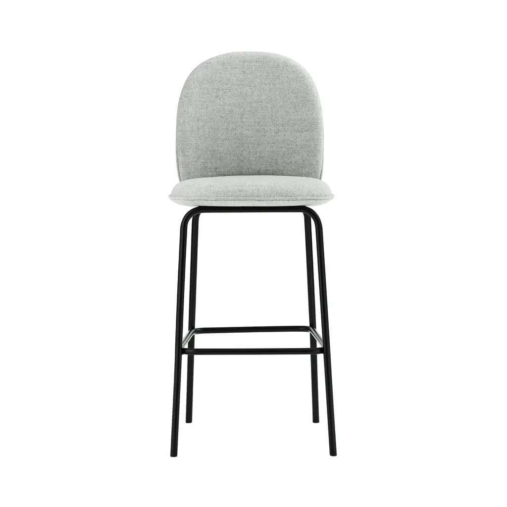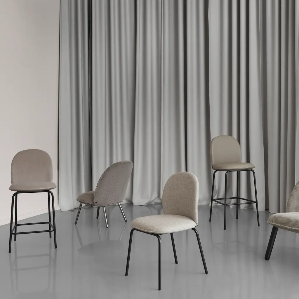 Danish designer Hans Hornemann extends his Ace template to a fine bar- and counter-height stool. The designer tempers the comfort of rounded contours and cushy full upholstery with controlled proportions to suit limited urban living spaces. Defined by piping around the seat and back, the sleek embrace of the curving backrest beckons invitingly while the crisp metal legs provide a modernist frame of reference.