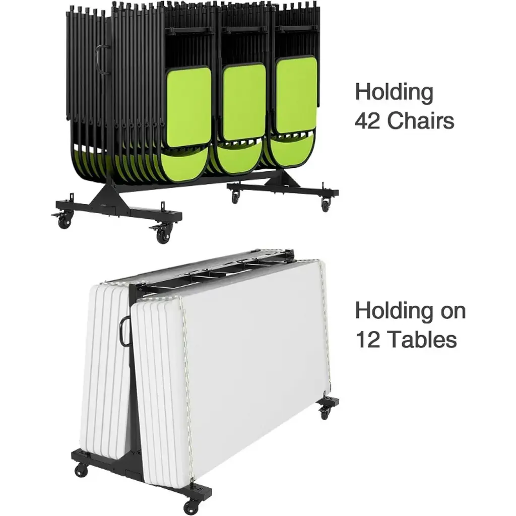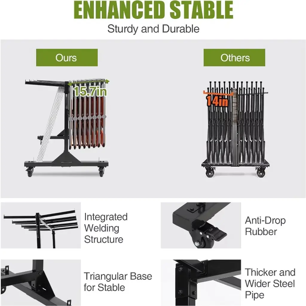 The Acekool folding chair rack cart provides a practical and sturdy solution for storing and moving folding chairs. Its metal frame supports up to 265 lbs and holds up to 42 chairs with ease. The adjustable height offers a custom fit for various chair sizes. The cart moves smoothly on 360° locking PVC wheels that work on multiple surfaces and lock firmly for safety. A protective water-resistant cover with elastic bands keeps chairs clean and dry. This multi-use cart is ideal for offices, or homes, and can also carry boxed goods for added convenience and efficient storage.