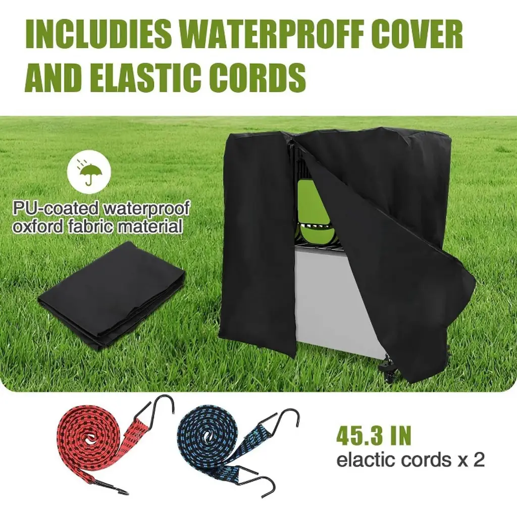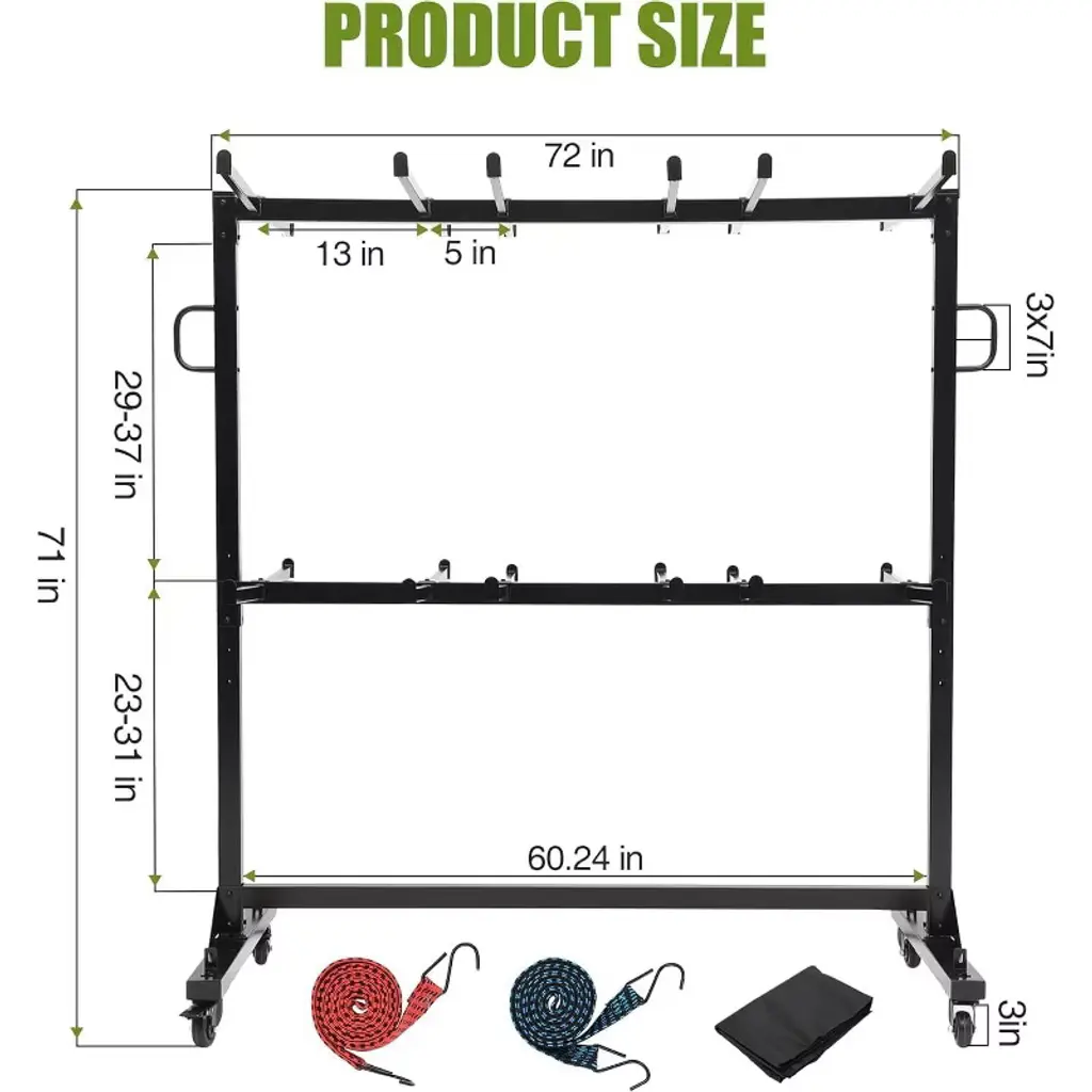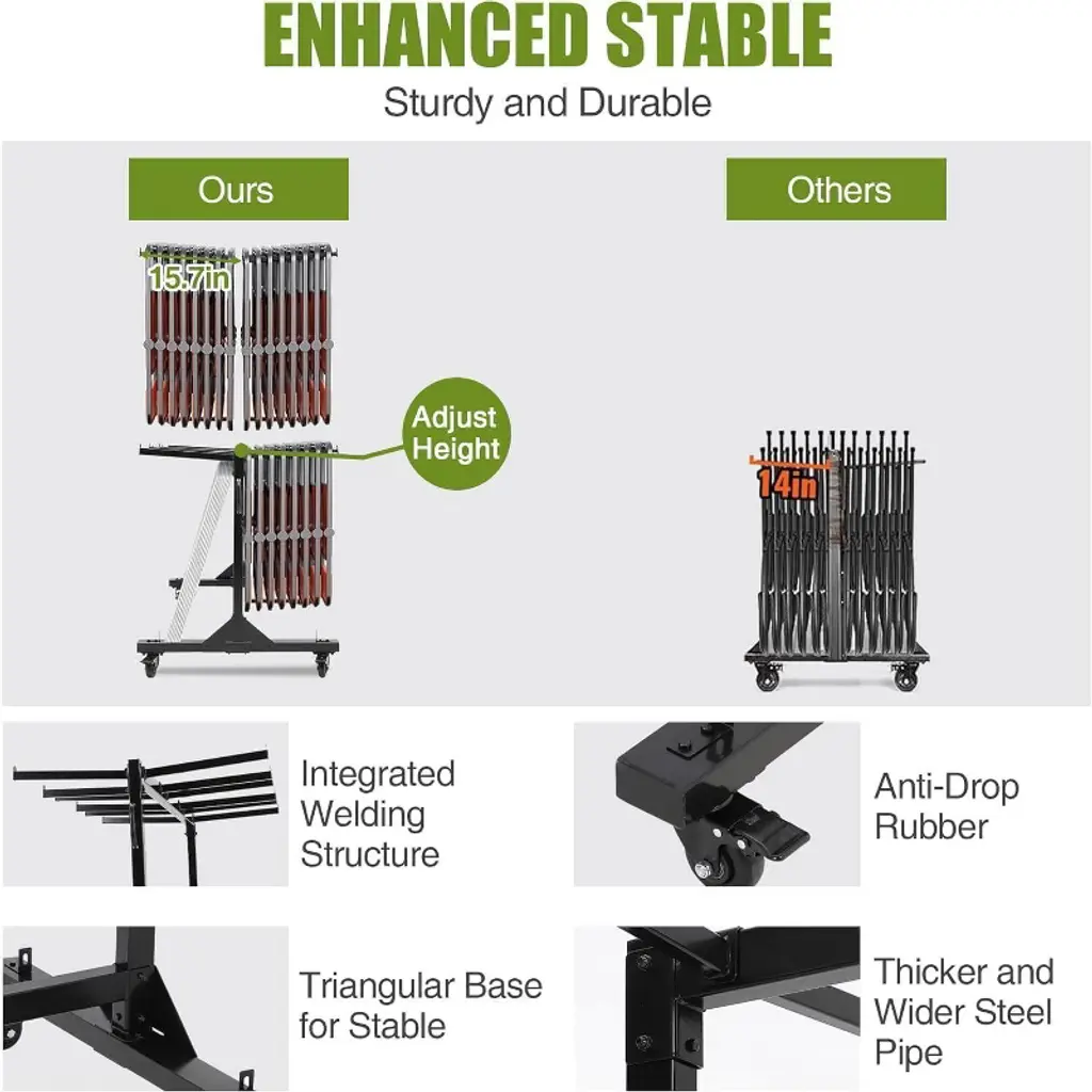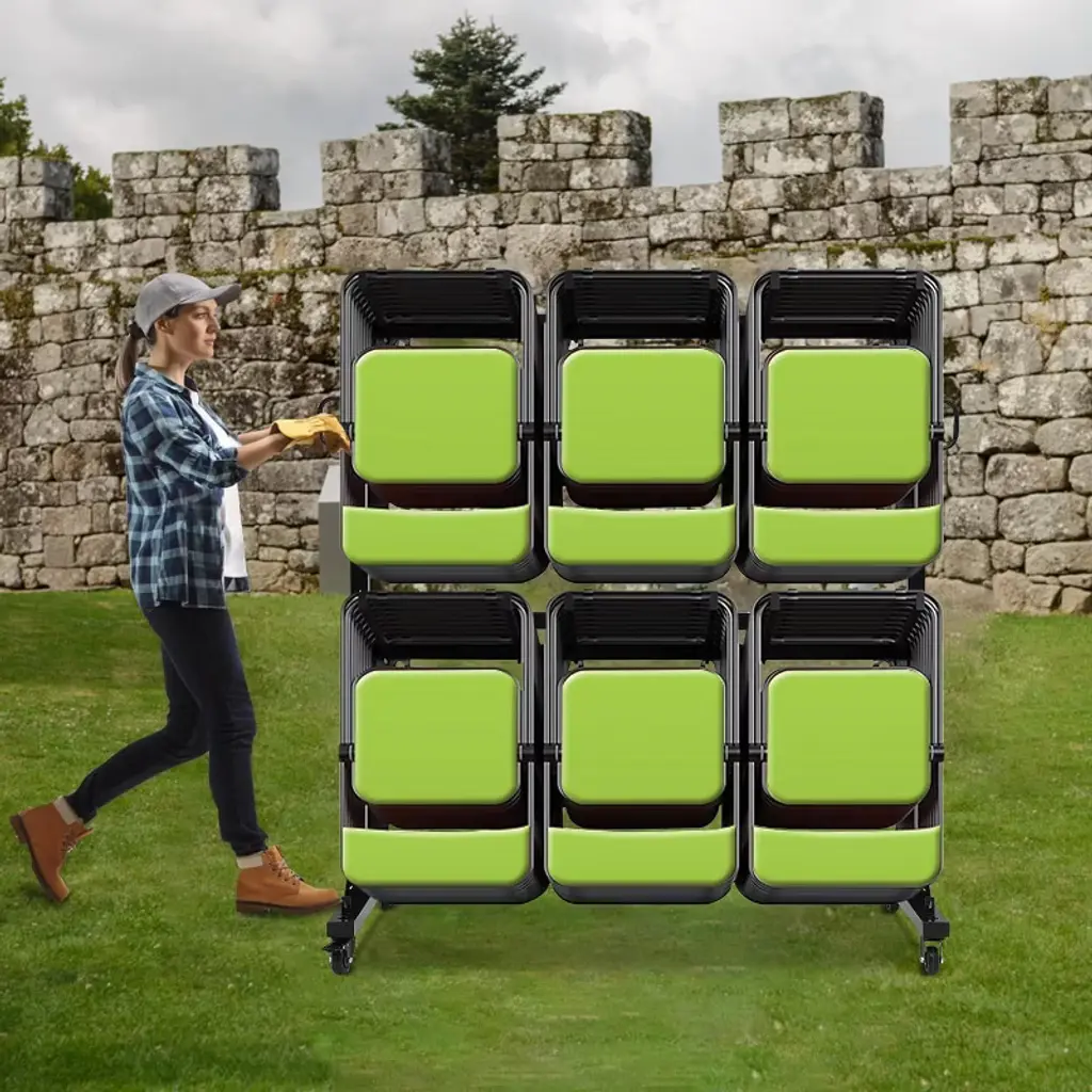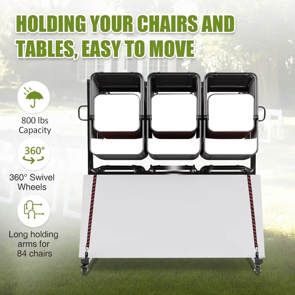 The Acekool folding chair rack cart provides a practical and sturdy solution for storing and moving folding chairs. Its metal frame supports up to 265 lbs and holds up to 42 chairs with ease. The adjustable height offers a custom fit for various chair sizes. The cart moves smoothly on 360° locking PVC wheels that work on multiple surfaces and lock firmly for safety. A protective water-resistant cover with elastic bands keeps chairs clean and dry. This multi-use cart is ideal for offices, or homes, and can also carry boxed goods for added convenience and efficient storage.
