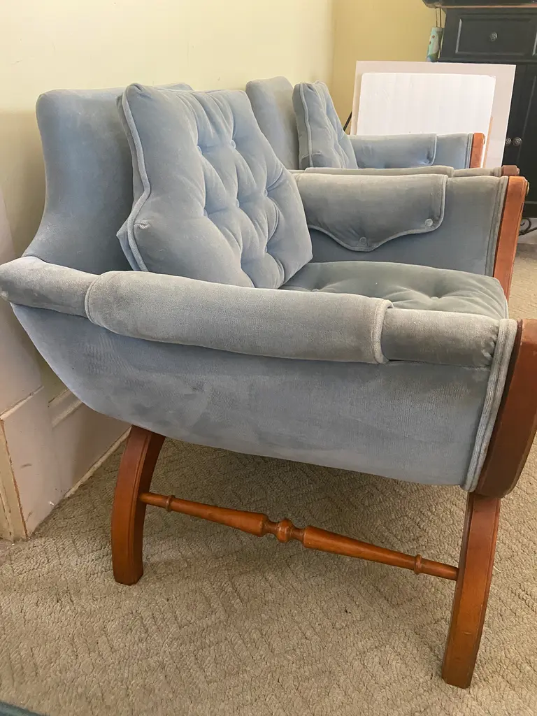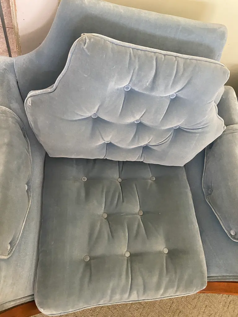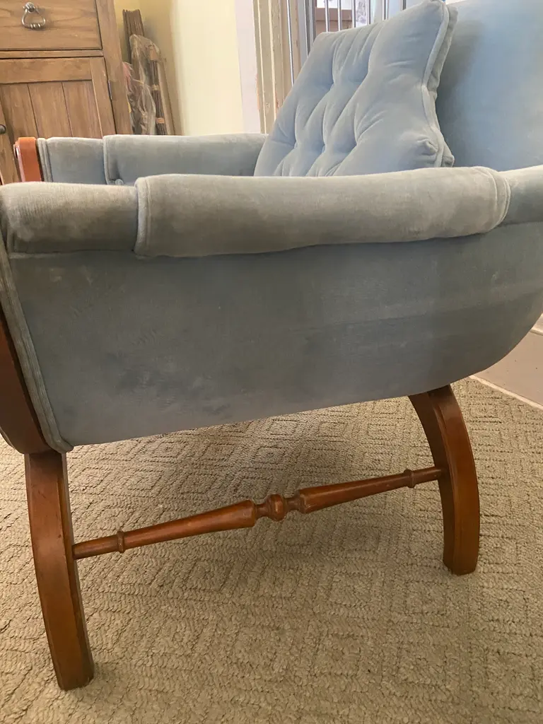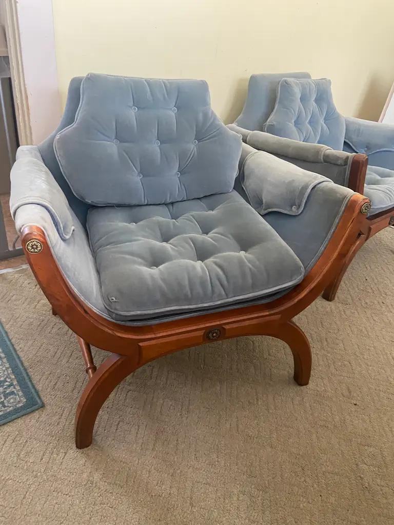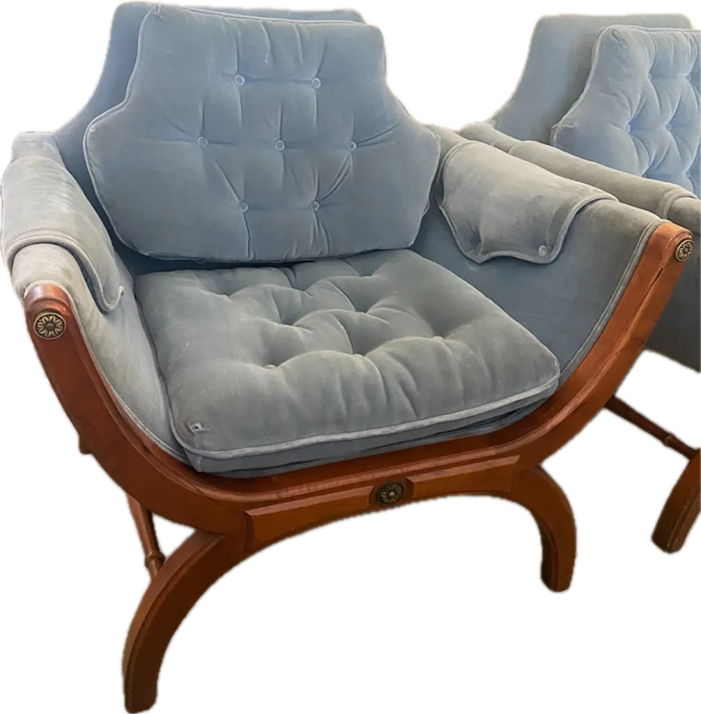 Adrian Pearsall Lounge style French Gondola X Base Louis Velvet Tuft XV Chair Beautiful Robbin blue light color Tuft removable pillows Great bones Recover to your color Medallions Wood X base Buy 1 or a Pair (Ask for pictures of other one ) Other 1 a medallion is missing Follow us !