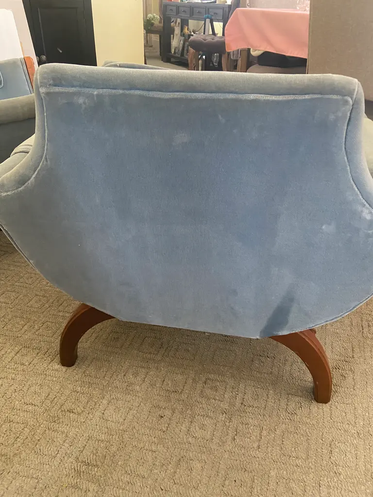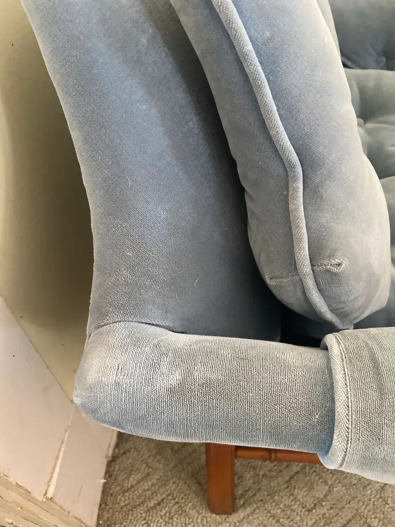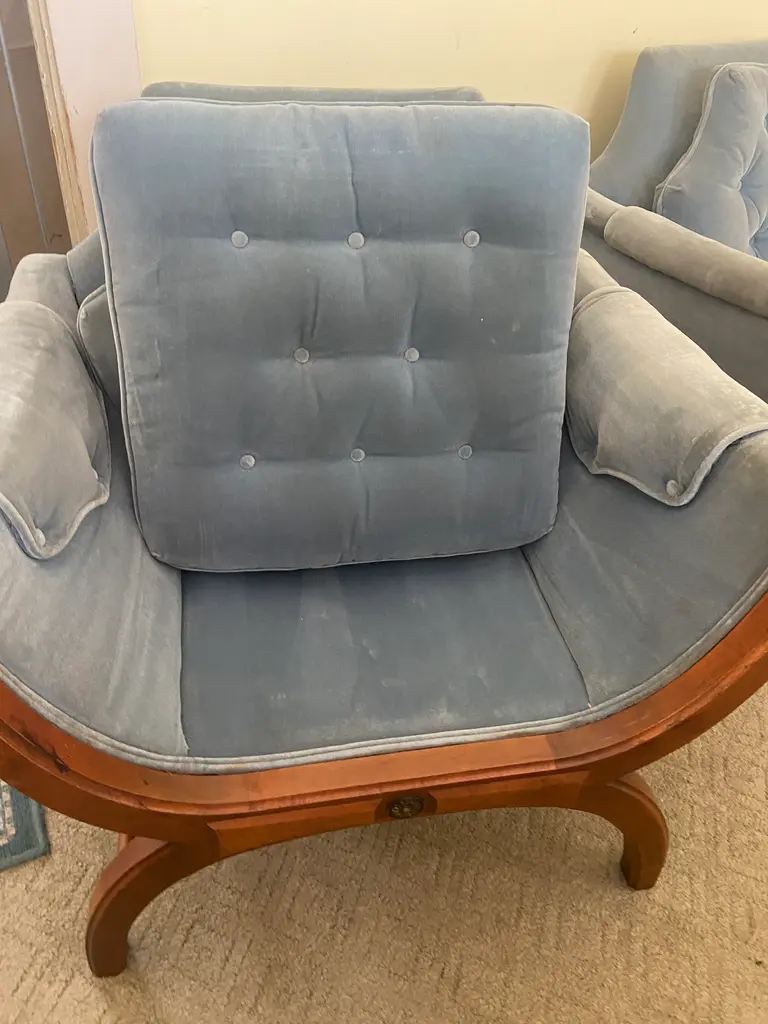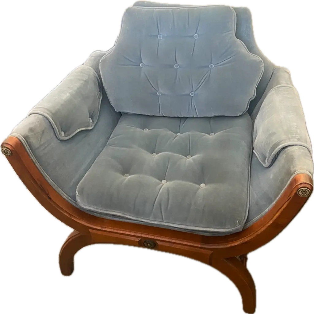 Adrian Pearsall Lounge style French Gondola X Base Louis Velvet Tuft XV Chair Beautiful Robbin blue light color Tuft removable pillows Great bones Recover to your color Medallions Wood X base Buy 1 or a Pair (Ask for pictures of other one ) Other 1 a medallion is missing Follow us !