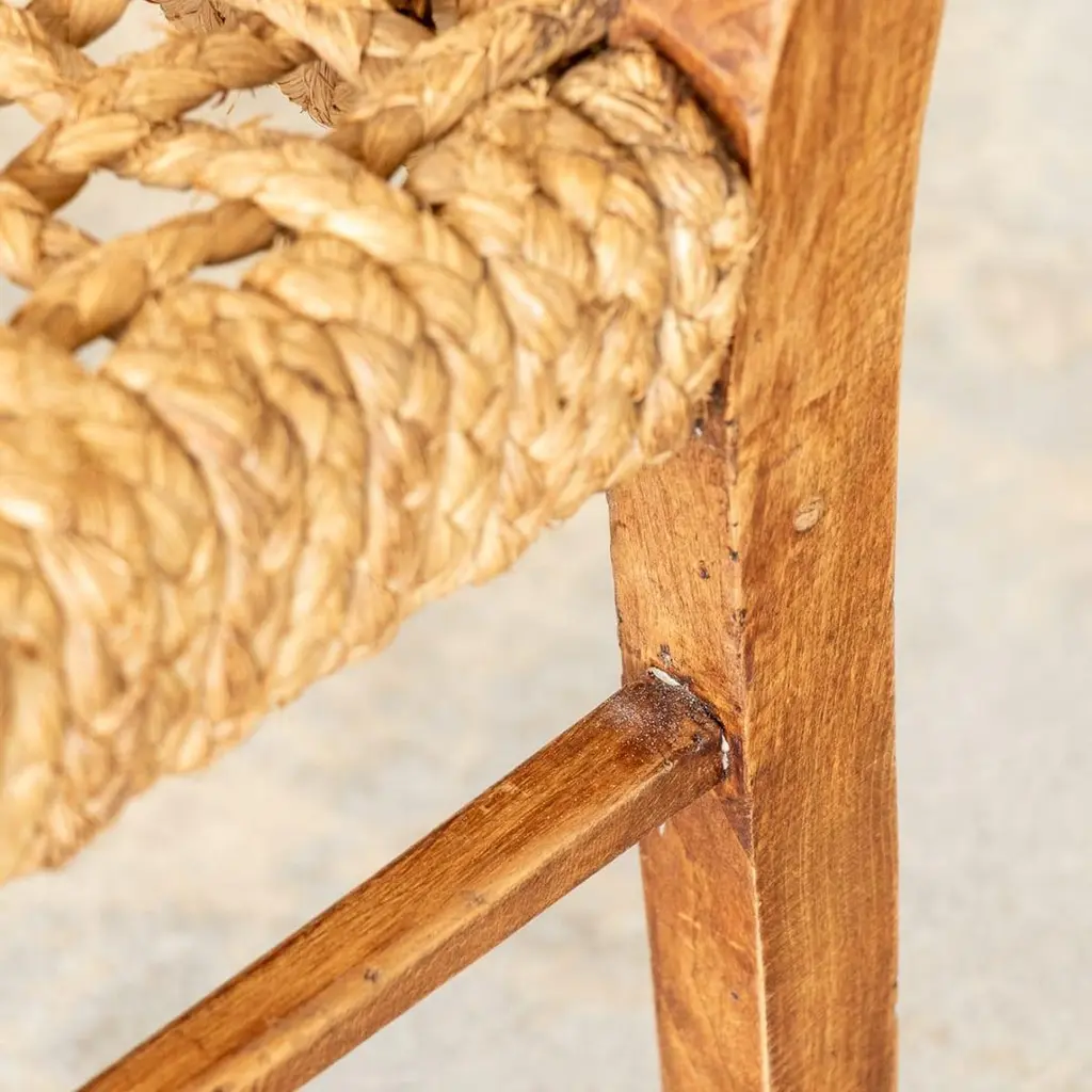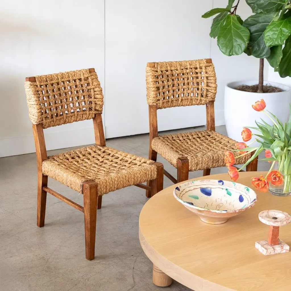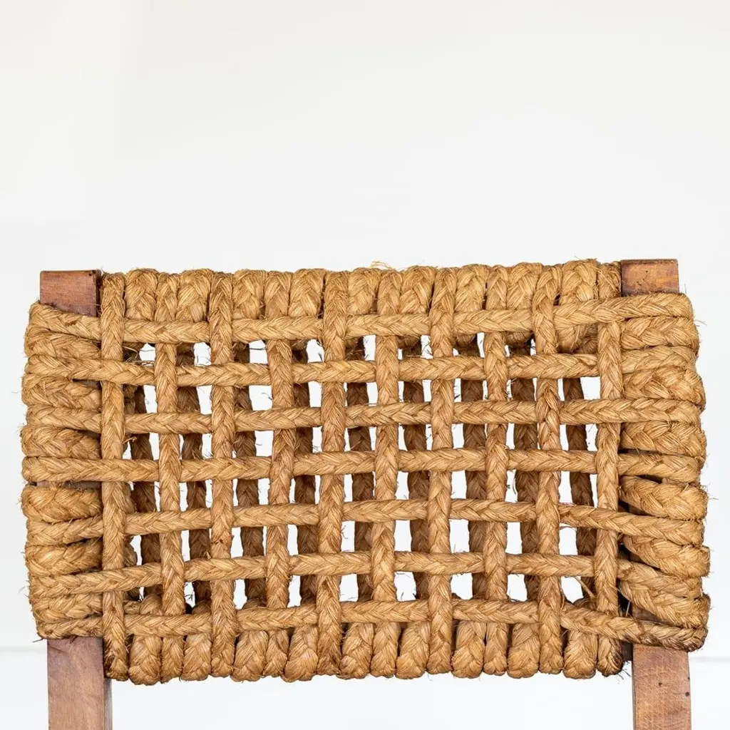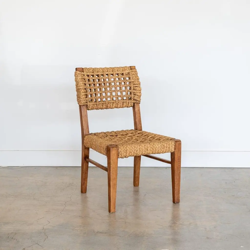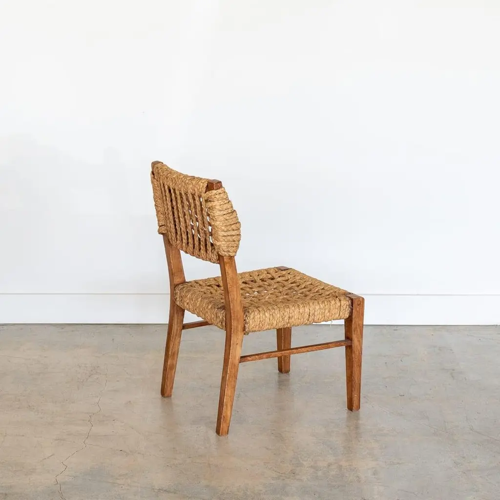 Vintage Adrien Audoux & Frida Minet chair from France, 1950s. All original woven rope seat with nice patina and age. Oak wood frame with dark stain. Overall nice vintage condition. Two available. Sold individually.