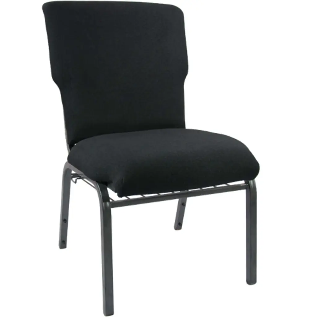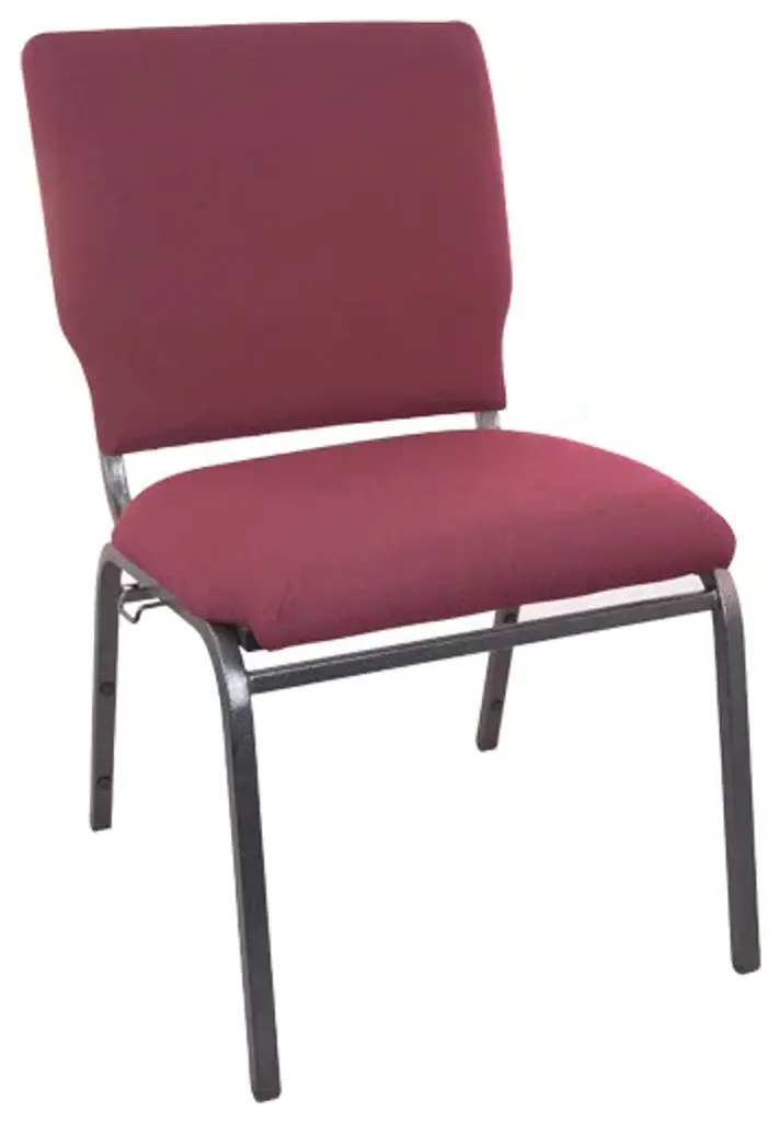 The Maroon Molded Foam Multipurpose Church Chair - 18.5 in. Wide with Silver Vein Frame provides a durable seating solution for your fellowship hall or convention center. This comfortably padded stack chair not only satisfies seating in Churches, but work well in hotel lobbies, banquet halls and conference facilities. Keep all guests engaged with the 2.25" thick foam padding containing zero fillers. Integrated ganging devices connect chairs together for uniform row seating. This padded chair was built to last with a 600 lb. weight capacity, 16 gauge steel frame and T-Nut construction with a metal on metal connection that's more durable than traditional wood screws. These beautifully crafted chairs go from the truck to your Sanctuary, as they don't require any assembly. Save your staff time and frustration with the purchase of these ready-to-use Stackable Church Chairs.Multipurpose Church Chair18 Gauge steel frame with rocker glides and welded ganging device2.25" Padded, 2lb. 100Virgin polyurethane foam seatT-NUTS to connect seats and backs to chair frame (stronger than wood screws)Plywood base for seats and backsFoam and Fabric meet flame retardant specification CA117Fabric durability- 200,000 double rubs (Wyzenbeek test)Weight limit- 600 lbs. (static weight)Single Unit Weight: 30 lbsItem Width: 18.5 InchesItem Depth: 23 InchesItem Height: 32 InchesSeat Size: 18.5"W x 16.5"DSeat Height: 17.5"HSeat Thickness: 2.5Weight Capacity: 600 lbs