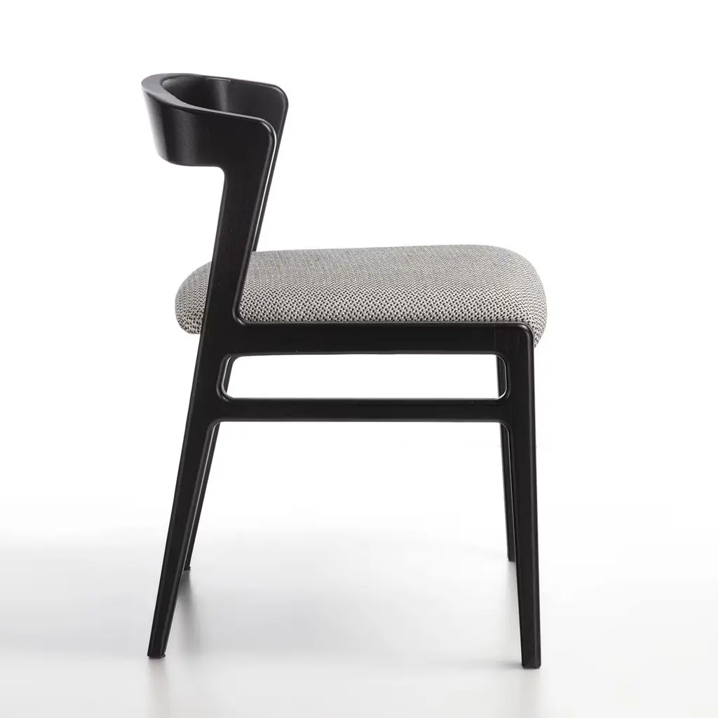 Chair from the Aida line with an essential and light design. Structure in solid wood and seat upholstered in fabric.