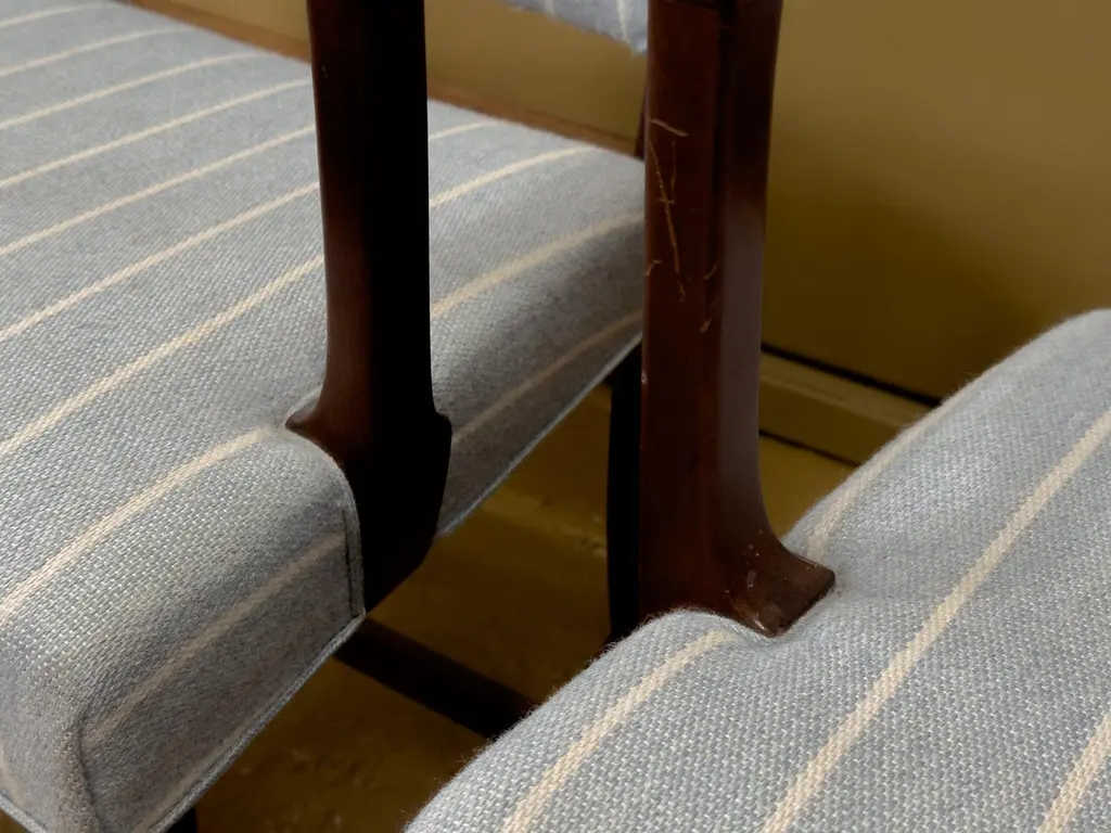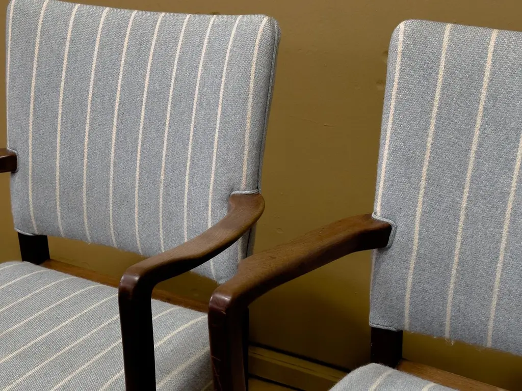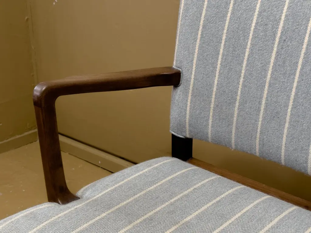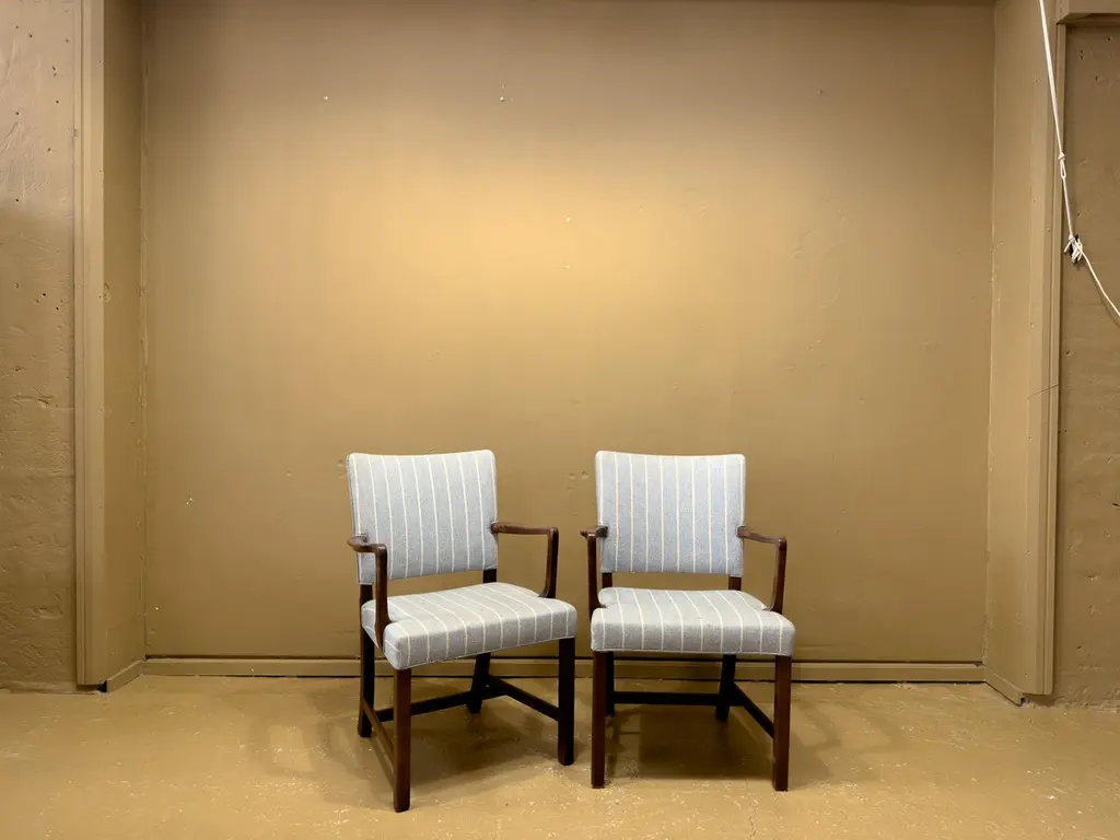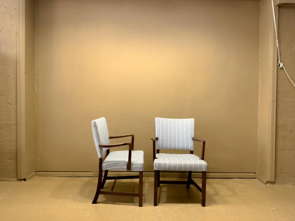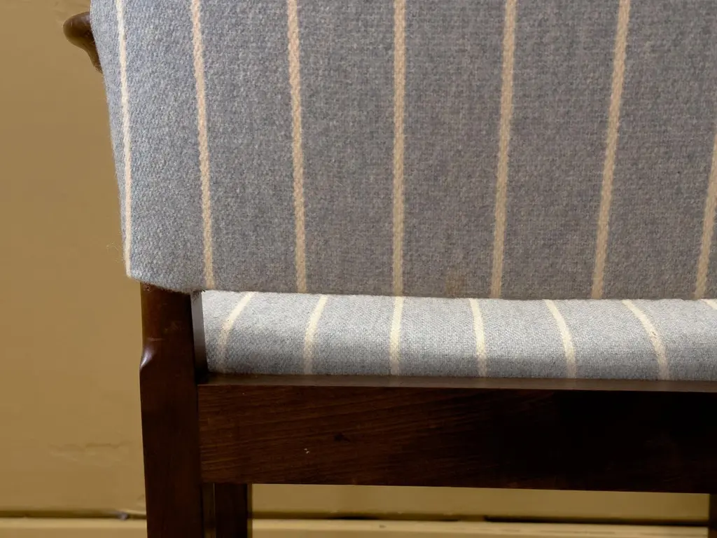 This exquisite pair of armchairs, designed by Danish master Ole Wanscher and crafted by the esteemed cabinetmaker A.J. Iversen in the 1960s, embodies the timeless elegance of mid-century design. Known for his dedication to refined proportions and understated luxury, Wanscher’s designs are celebrated worldwide for their balance of form and function.The solid mahogany wood frames showcase the richness and depth of the material, with beautifully contoured armrests that provide both visual interest and comfort. The chairs are upholstered in a subtly striped light blue fabric, adding a sophisticated contrast to the dark wood.